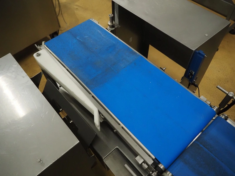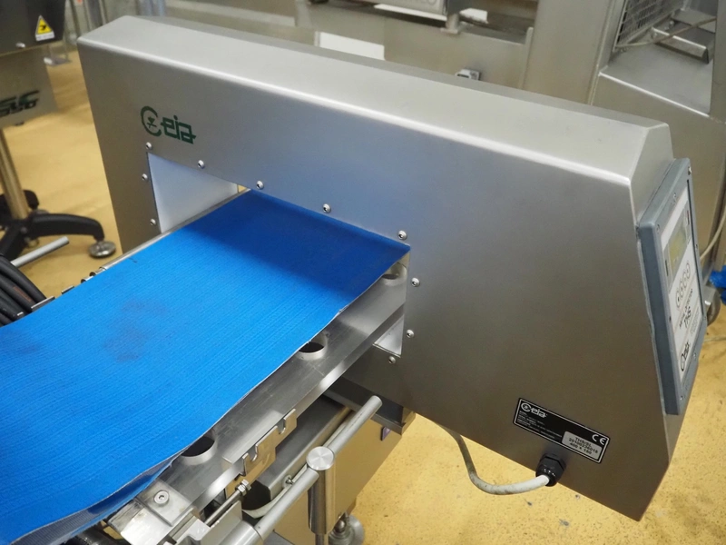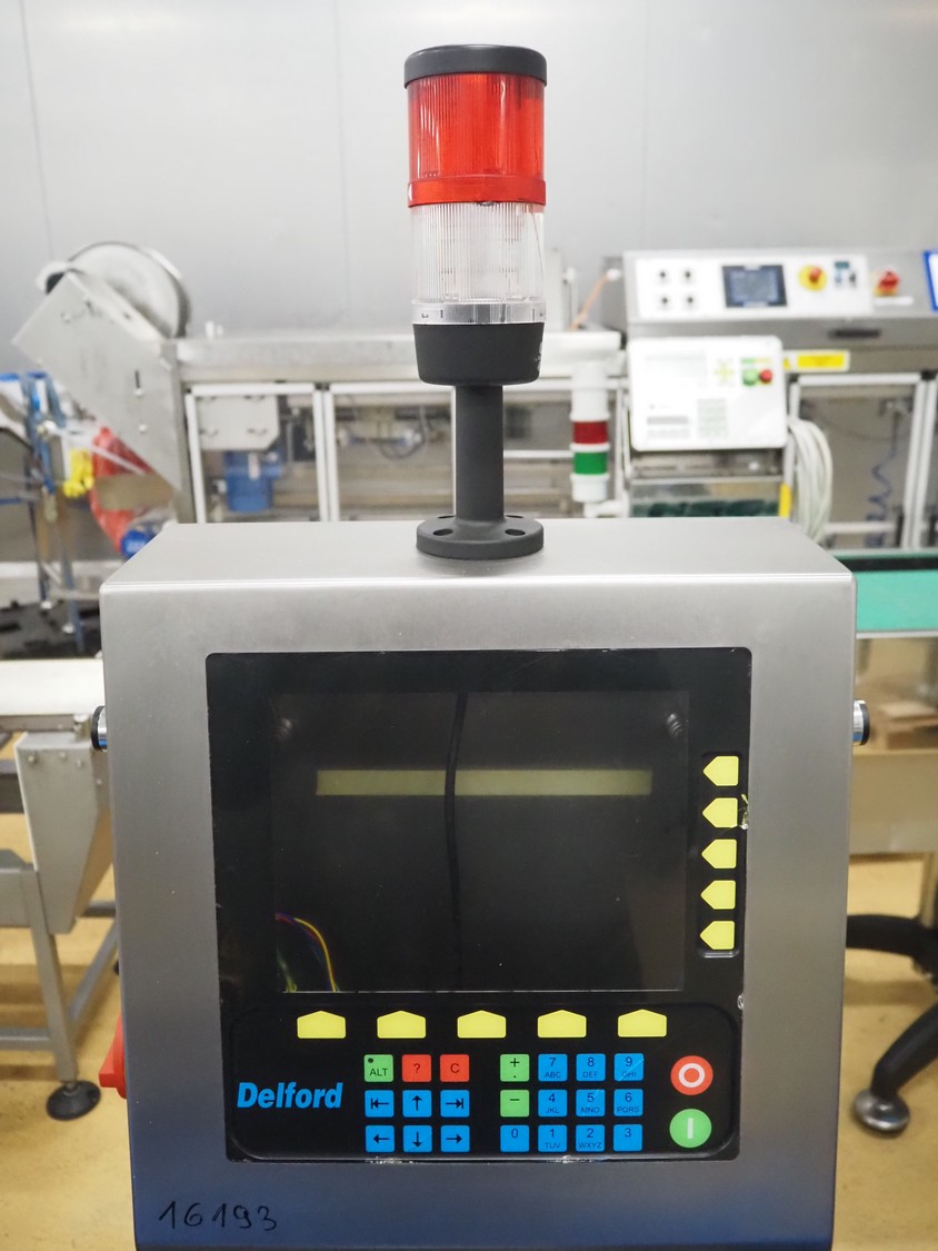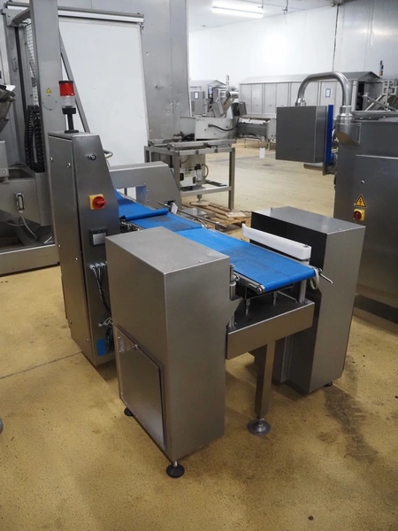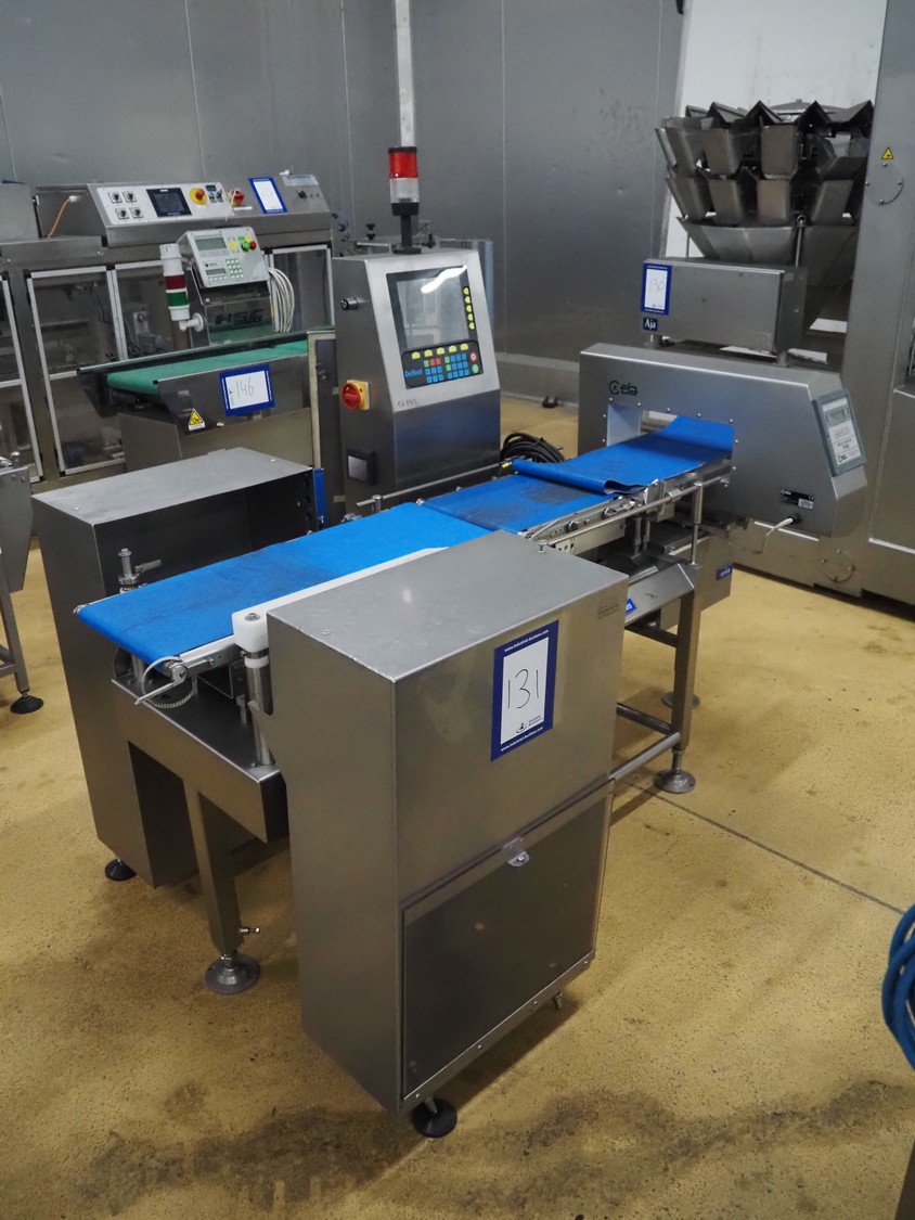 Ceia metal detector with Delford checkweigher, model metal detector: THS/SL, serial number: 20100236015, plastic belt, belt width: 295 mm, clearance: 400 mm x 110 mm, model checkweigher: G1000, serial number: 1001, year of construction: 2001, weighing range: 10-990 g, 415 V, 3 Ph, 50 Hz, 3 A, total dimensions: 2100 mm x 1200 mm x 1600 mm.