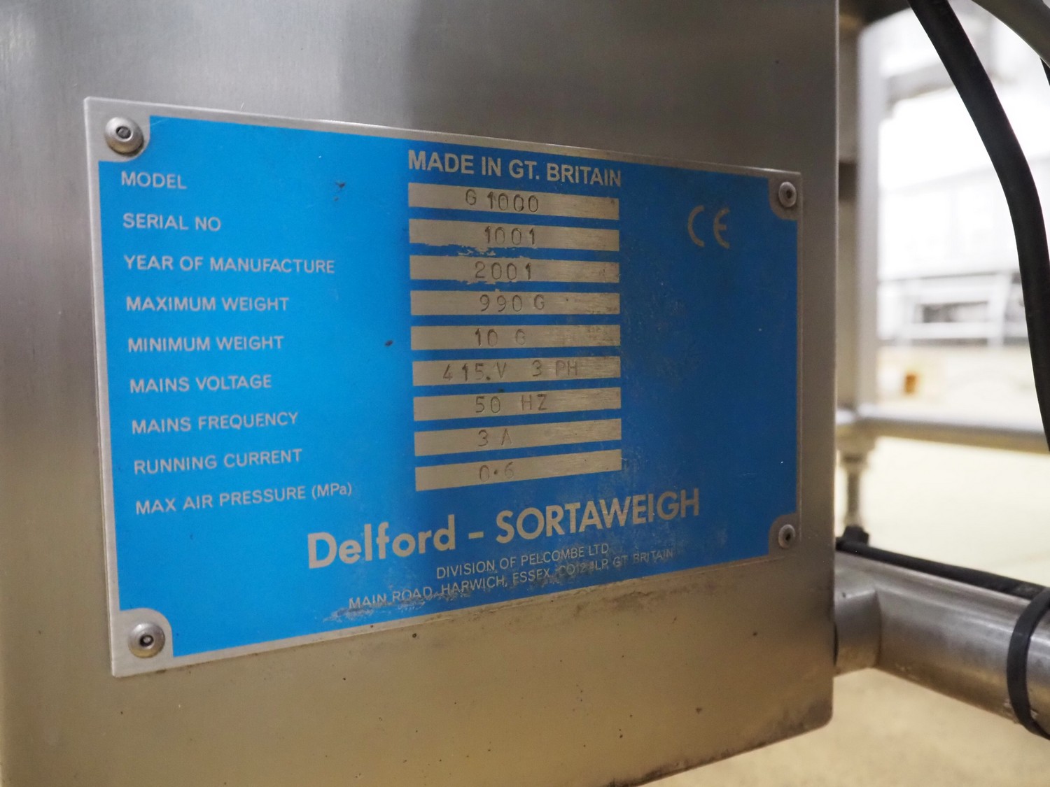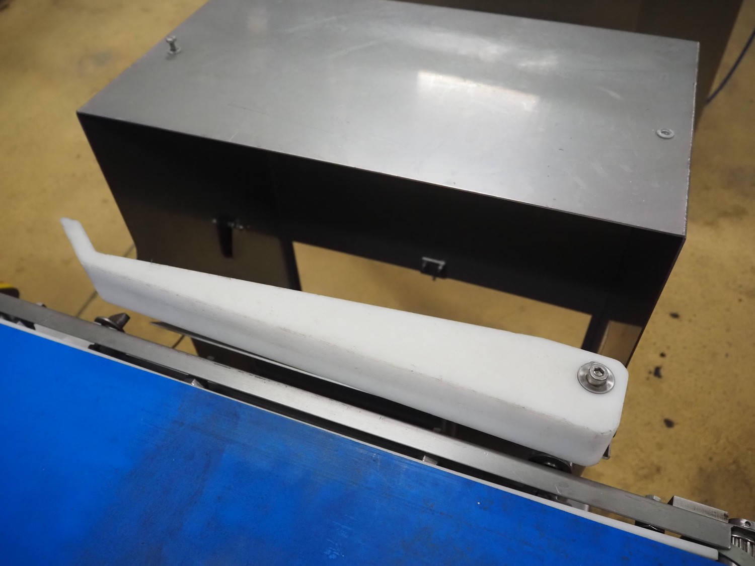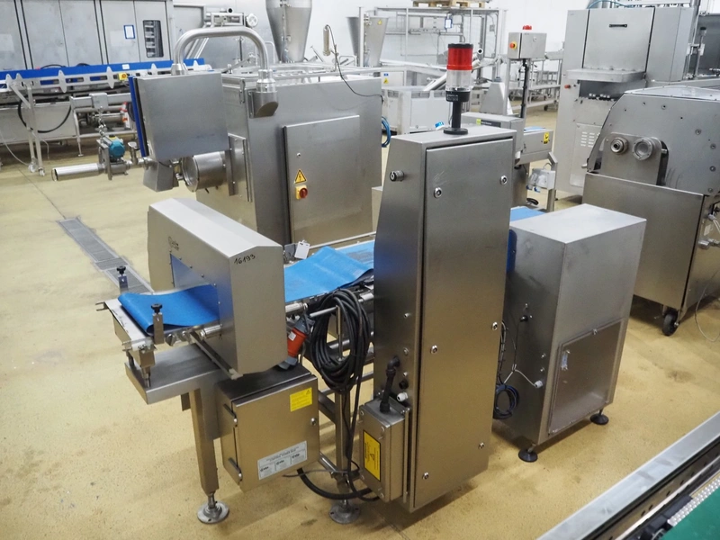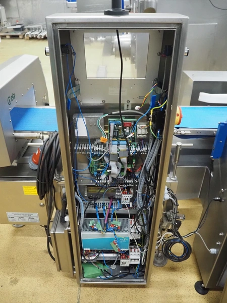 Ceia metal detector with Delford checkweigher, model metal detector: THS/SL, serial number: 20100236015, plastic belt, belt width: 295 mm, clearance: 400 mm x 110 mm, model checkweigher: G1000, serial number: 1001, year of construction: 2001, weighing range: 10-990 g, 415 V, 3 Ph, 50 Hz, 3 A, total dimensions: 2100 mm x 1200 mm x 1600 mm.