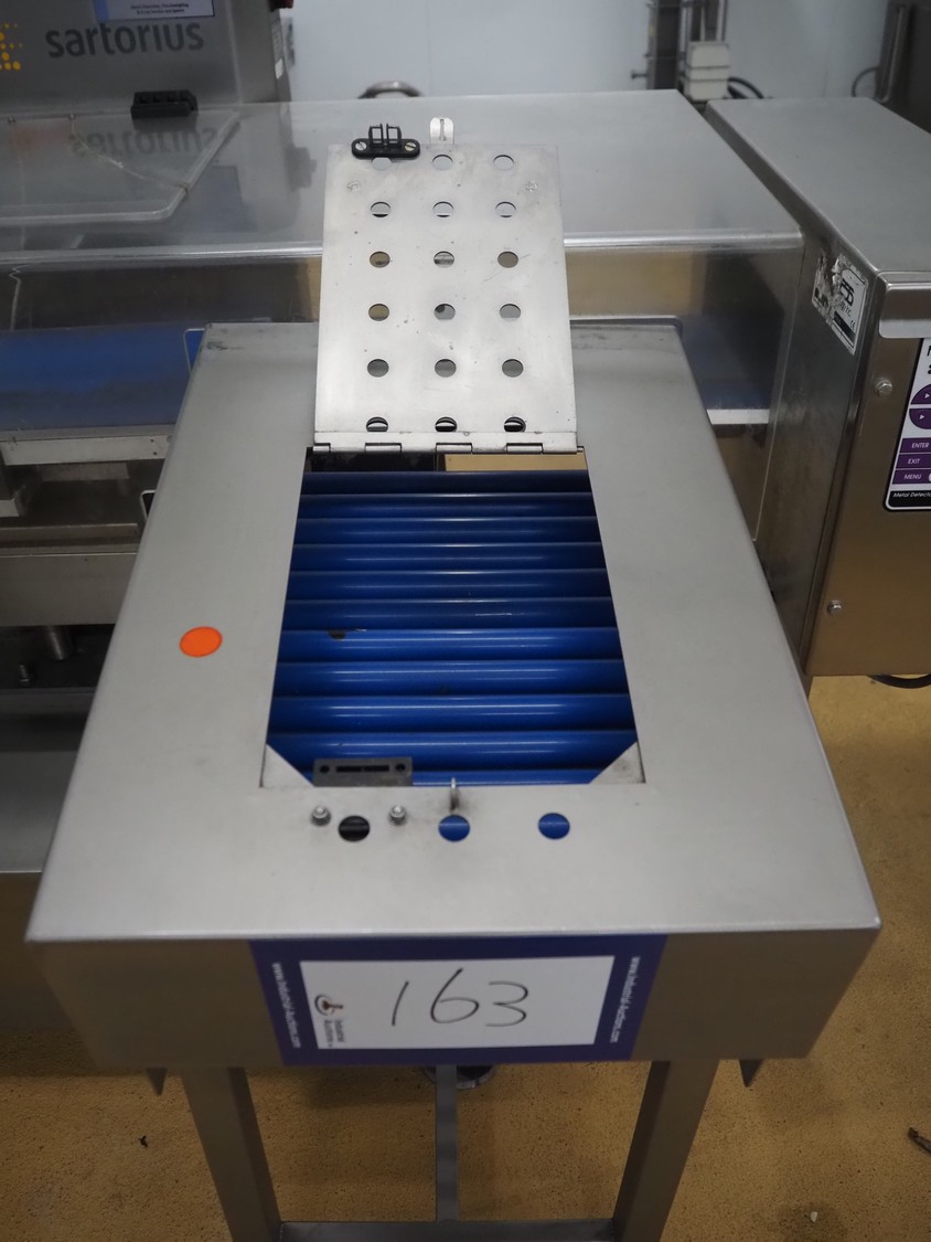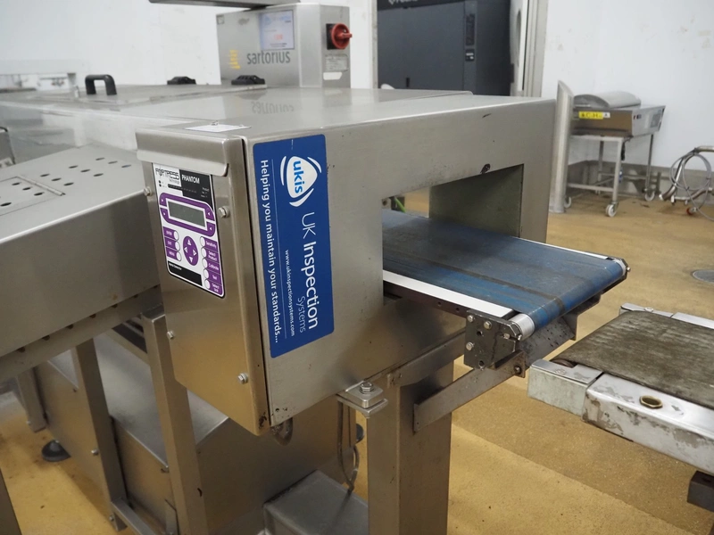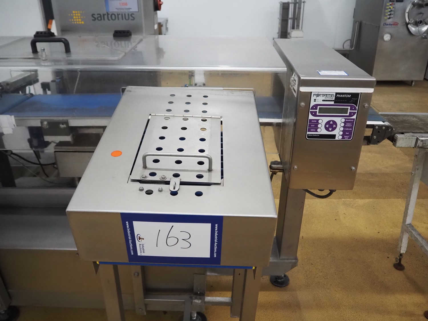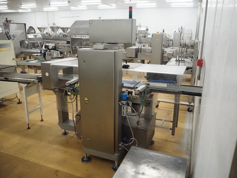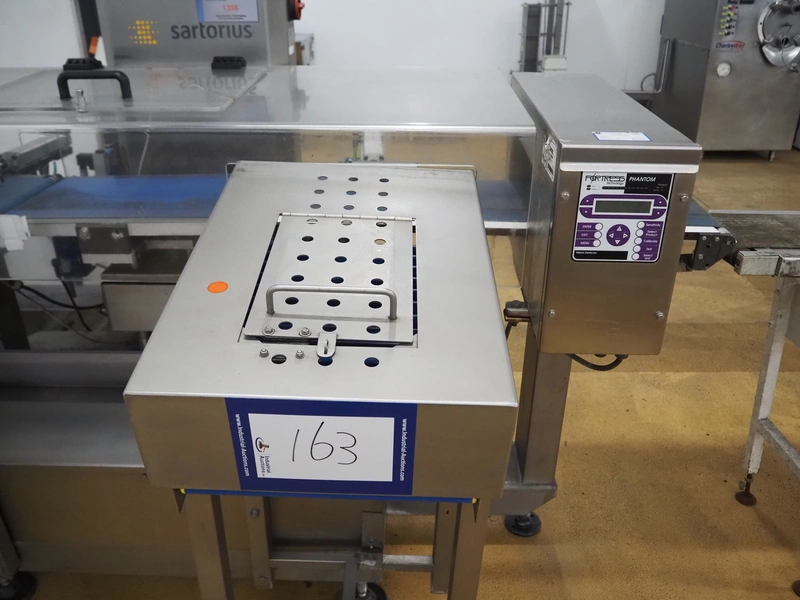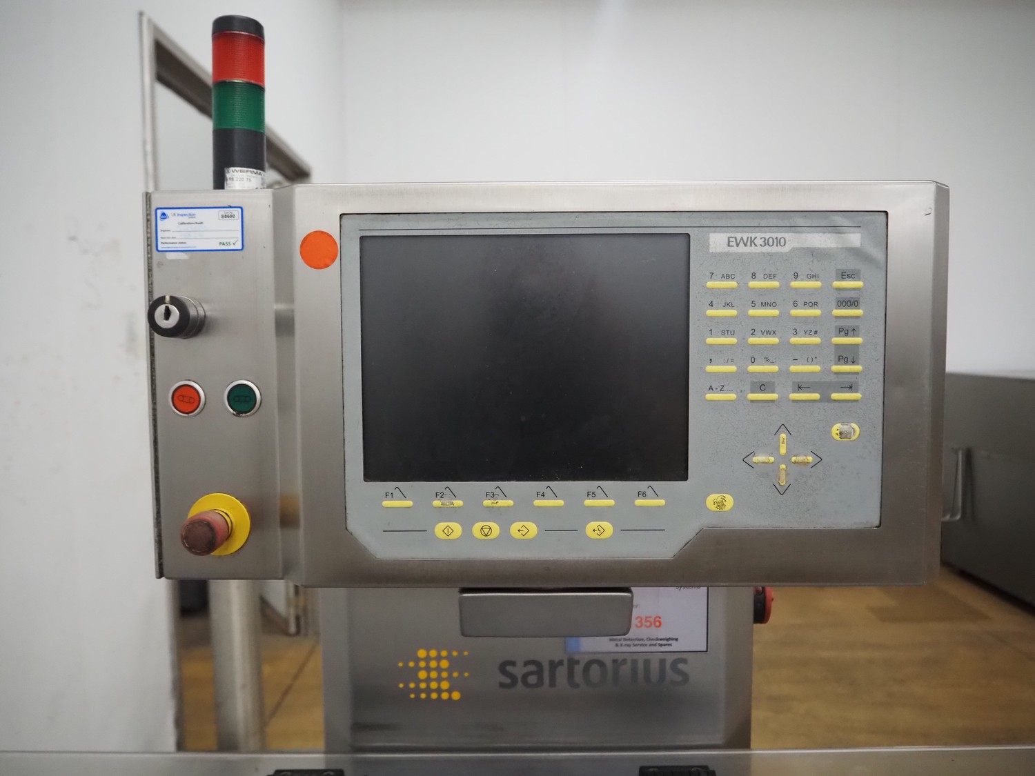 Fortress / Sartorius checkweigher and metal detector system with 2 rejectors, Fortress metal detector, mode: Phantom, clearance: 350 mm x 125 mm, Sartorius check weigher, type: EWK3010/WS2kg M CD, year of construction: 2005, 230 V, 50 Hz, plastic belt, belt width: 265 mm, total dimensions: 2250 mm x 1350 mm x 1800 mm.