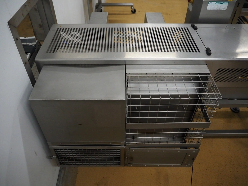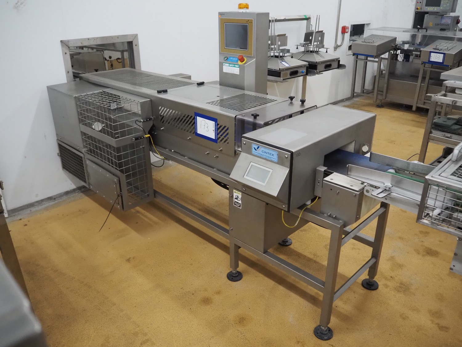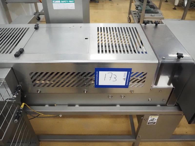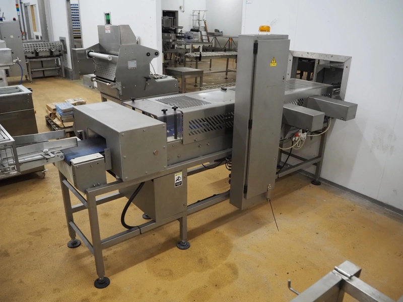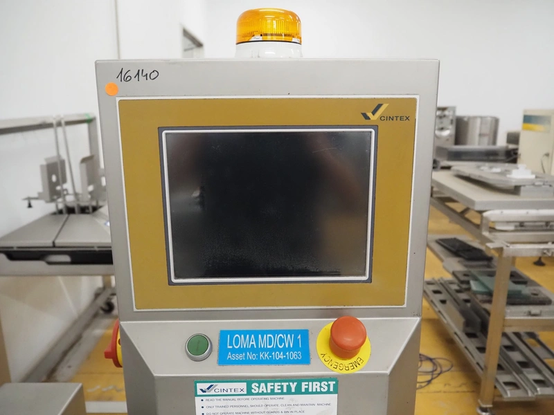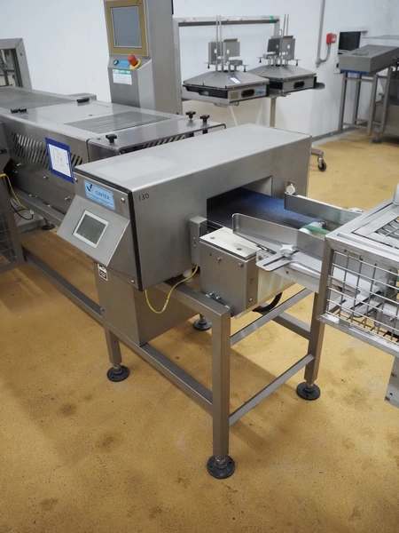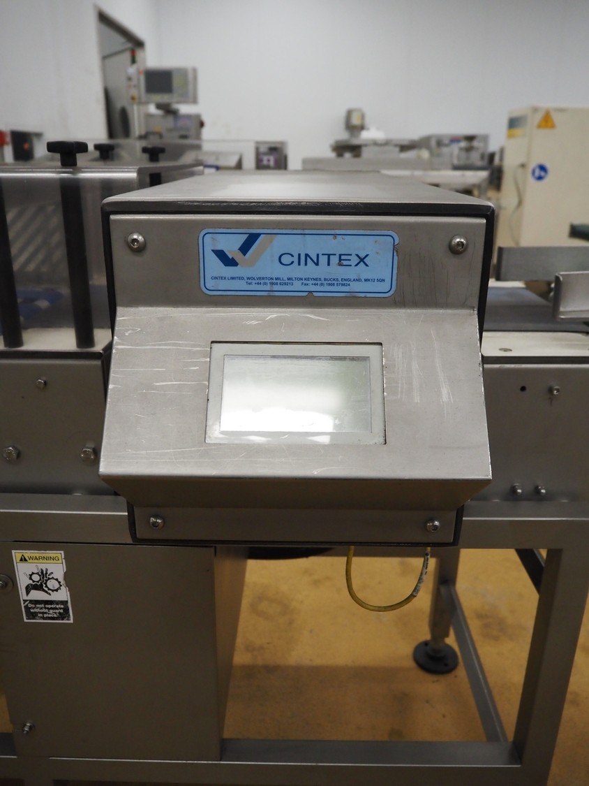 Cintex metal detector and checkweigher with rejector, clearance: 300 mm x 70 mm, plastic belt, belt width: 280 mm, 200 mm, 340 mm, total dimensions: 2550 mm x 1200 mm x 1550 mm.