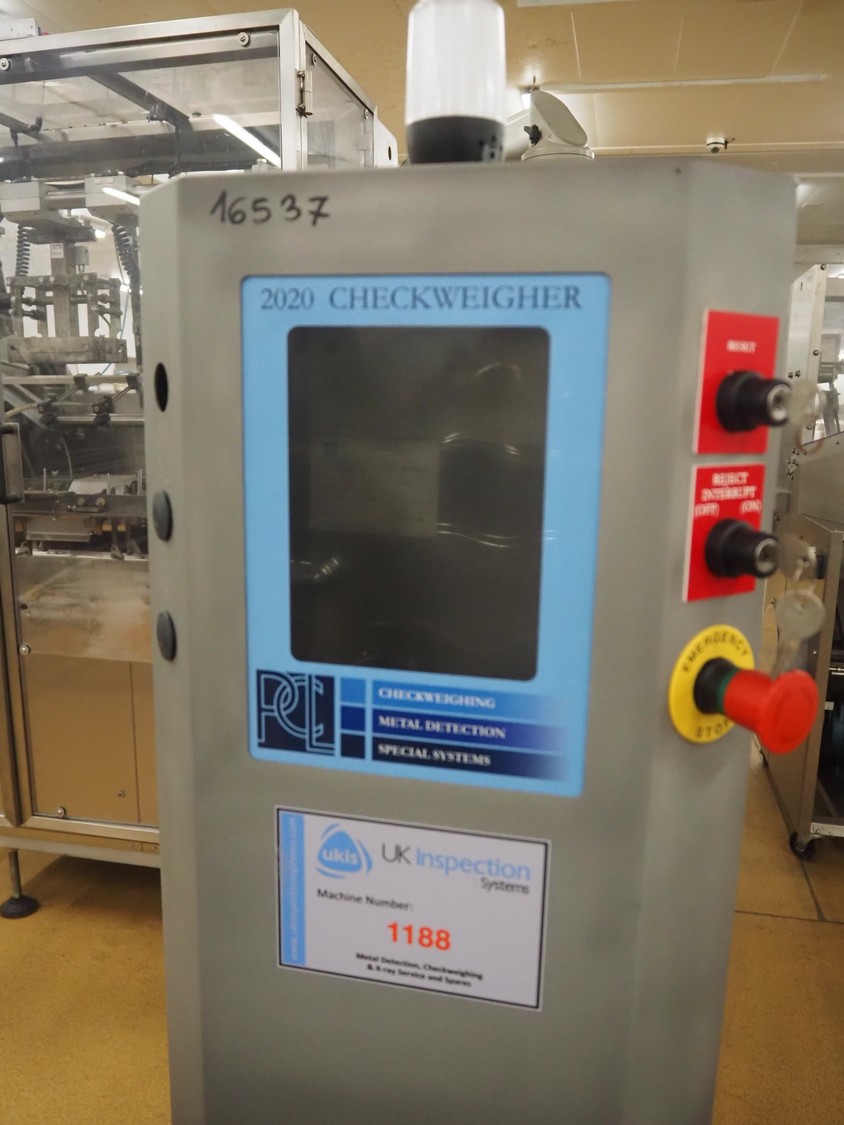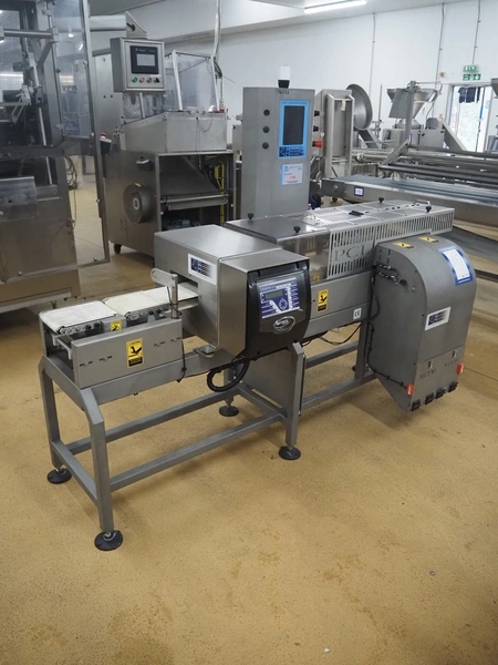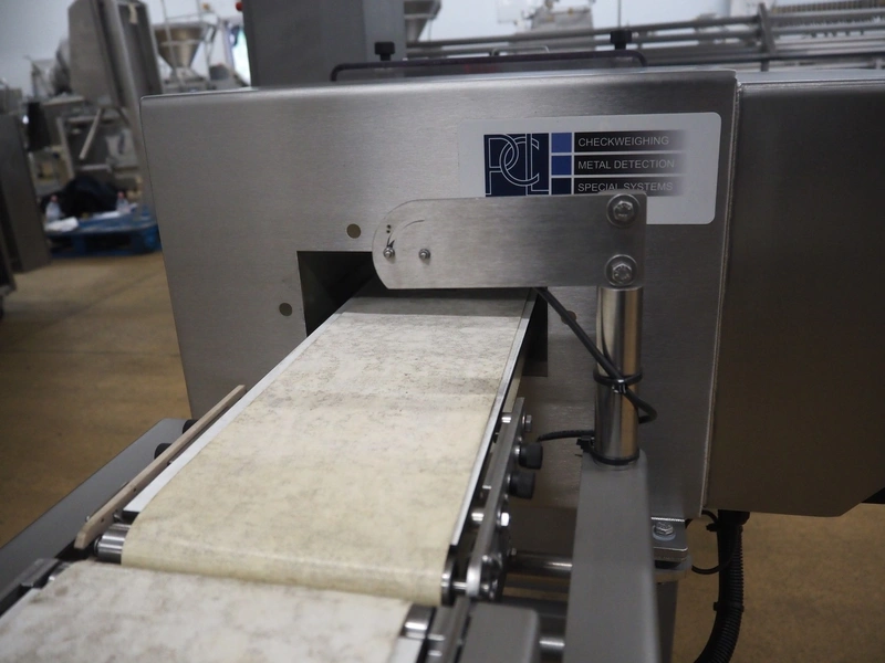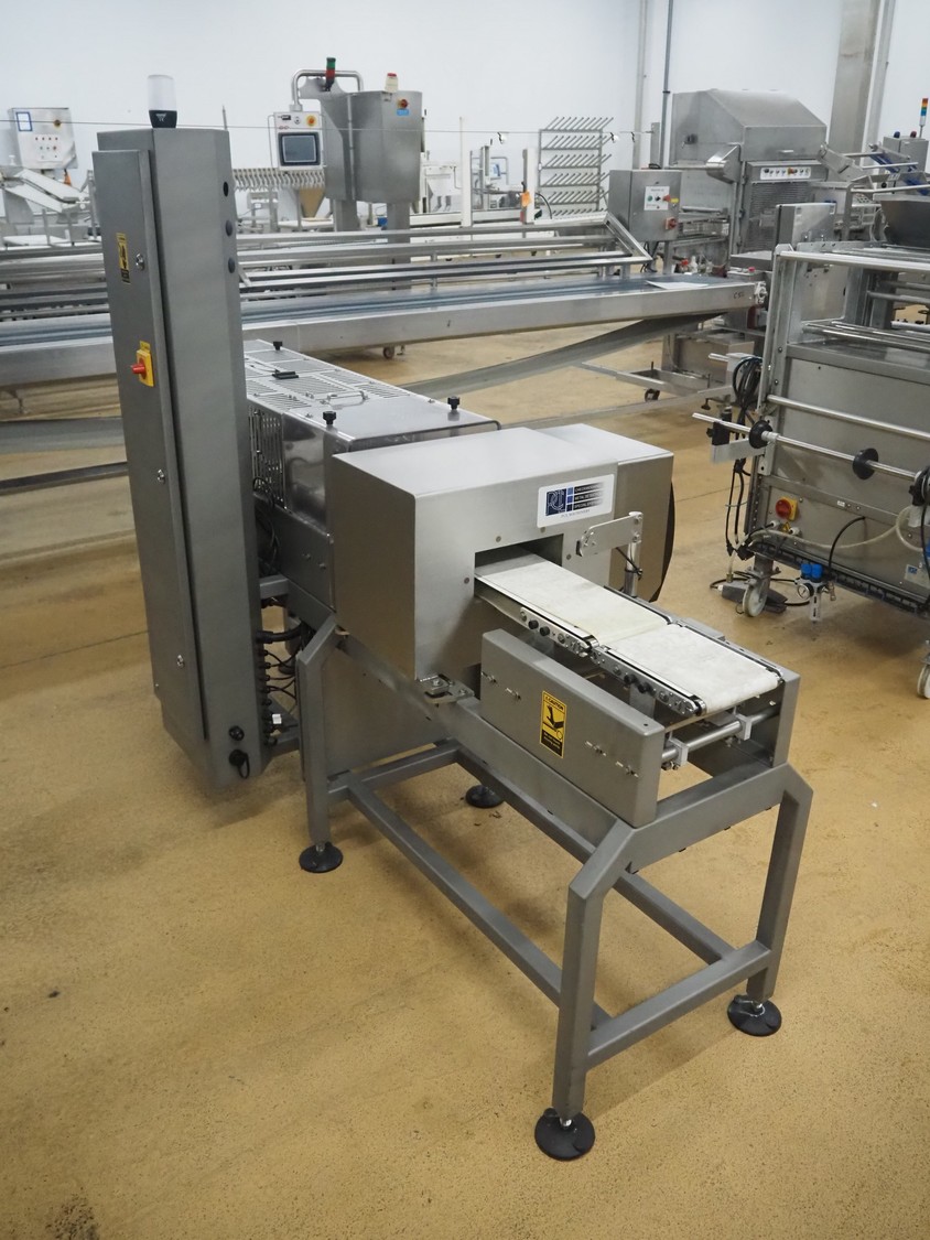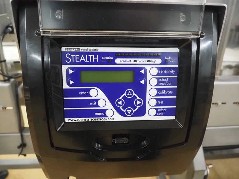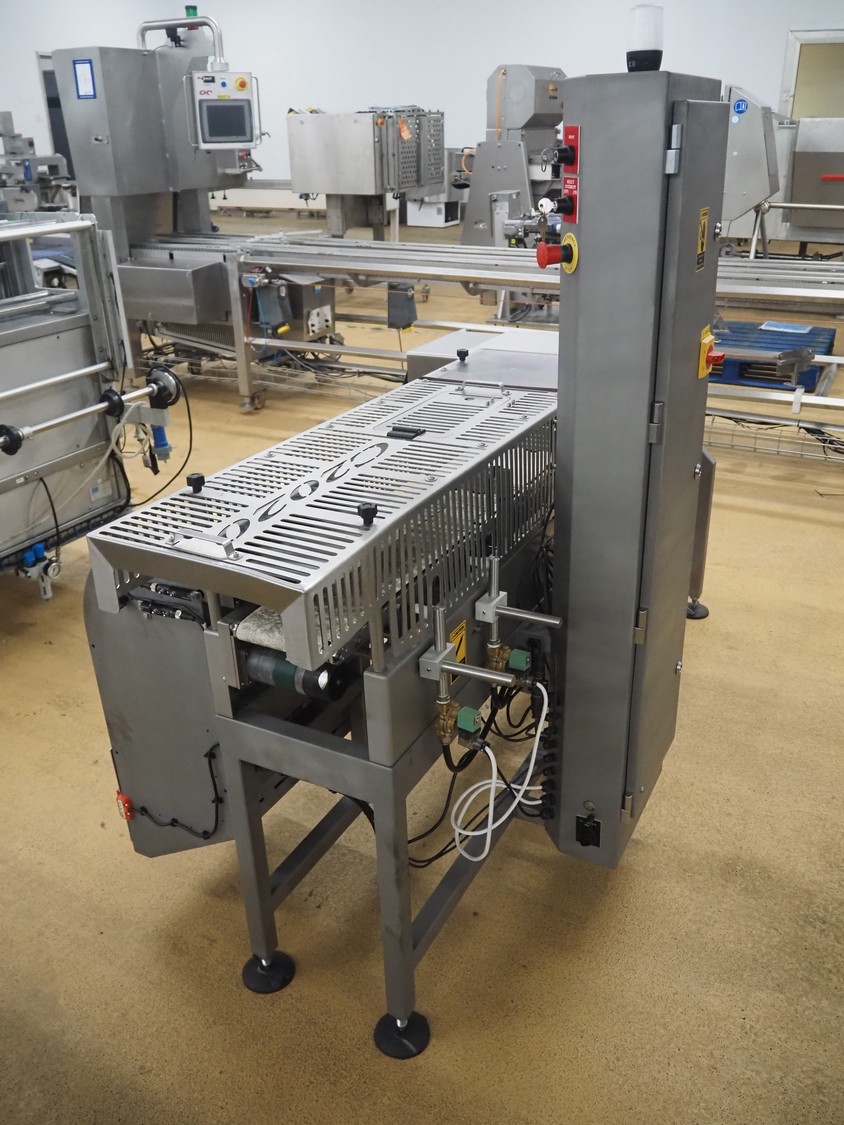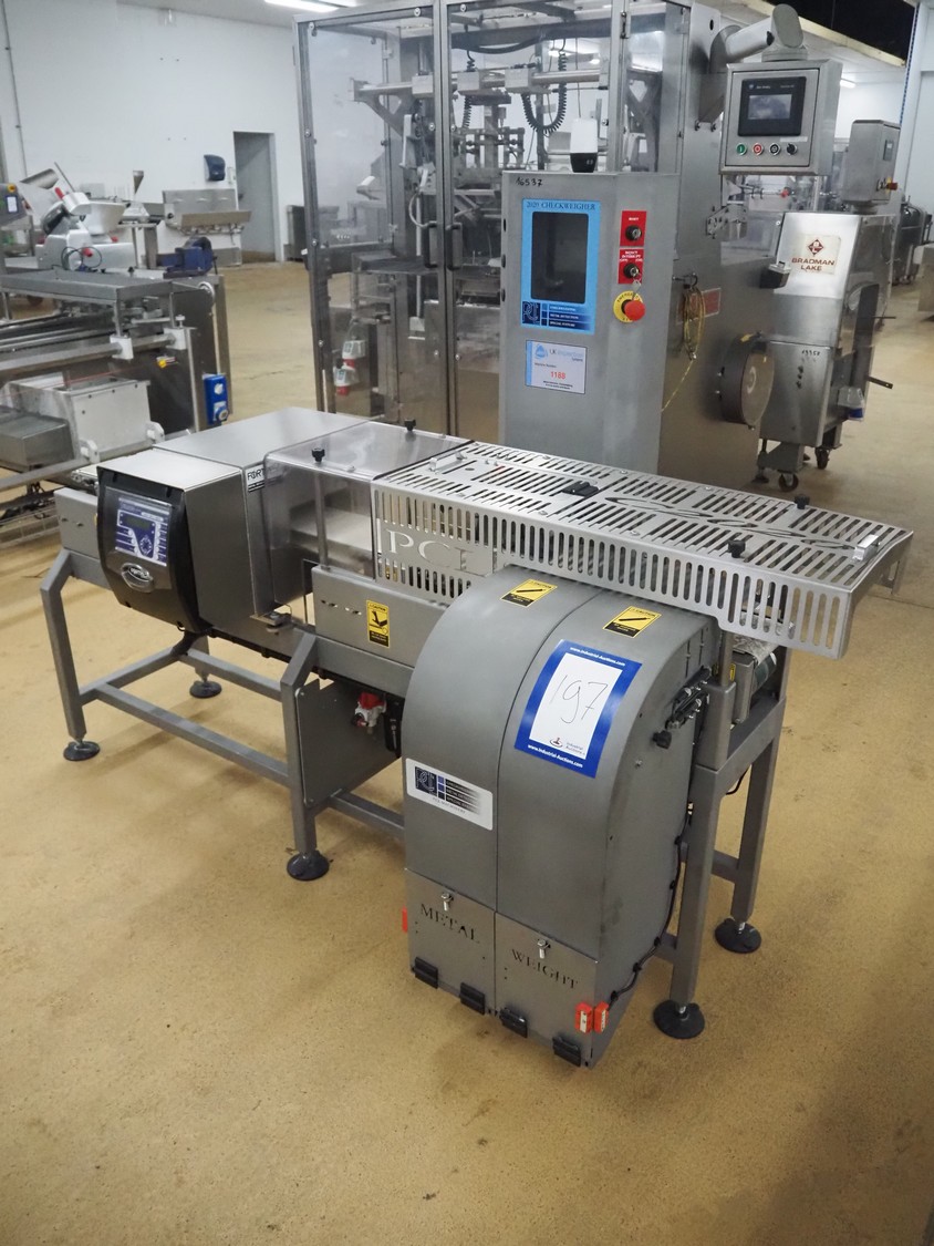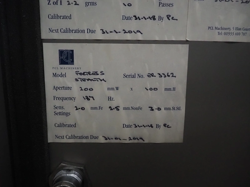 Fortress metal detector and PCL Machinery checkweigher with rejector, type metal detector: Fortress Stealth, serial number: ER 3362, clearance: 200 mm x 55 mm, plastic belt, belt width: 150 mm, total dimensions: 2120 mm x 900 mm x 1650 mm.