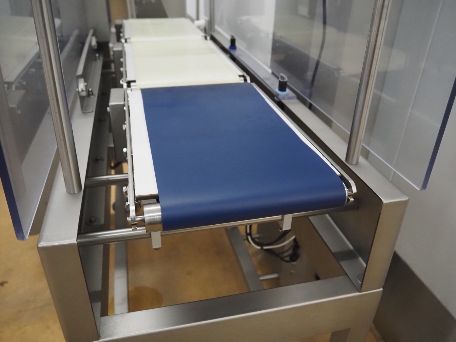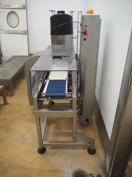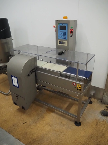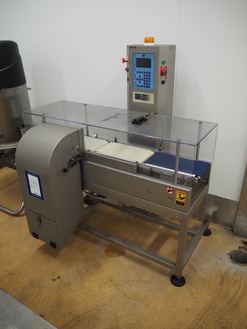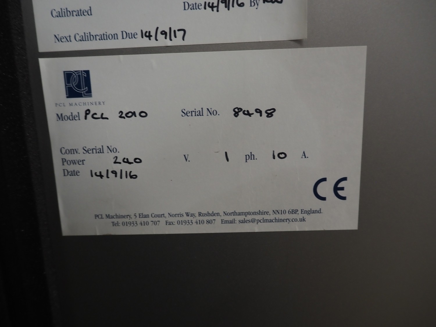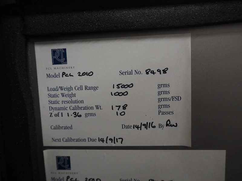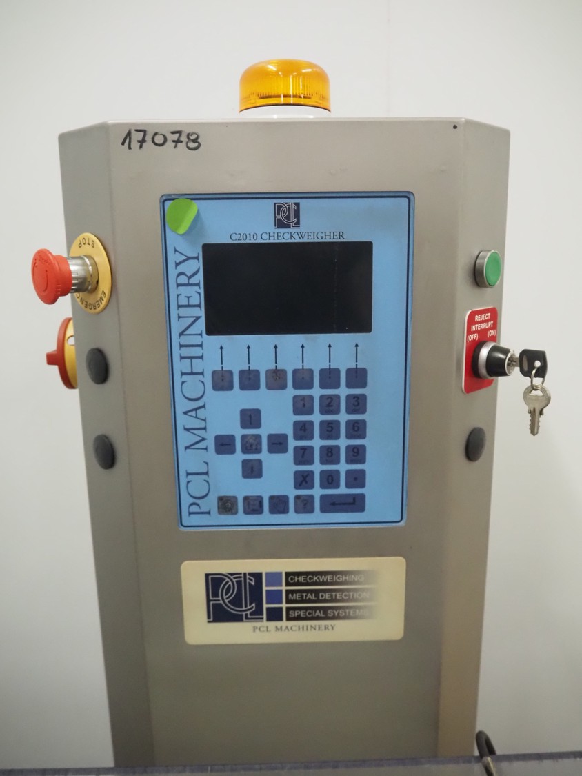 PCL Machinery checkweigher, model: PCL 2010, serial number: 8498, maximum weighing capacity: 15000 g, plastic belt, belt width: 200 mm, total dimensions: 1400 mm x 1000 mm x 1570 mm.