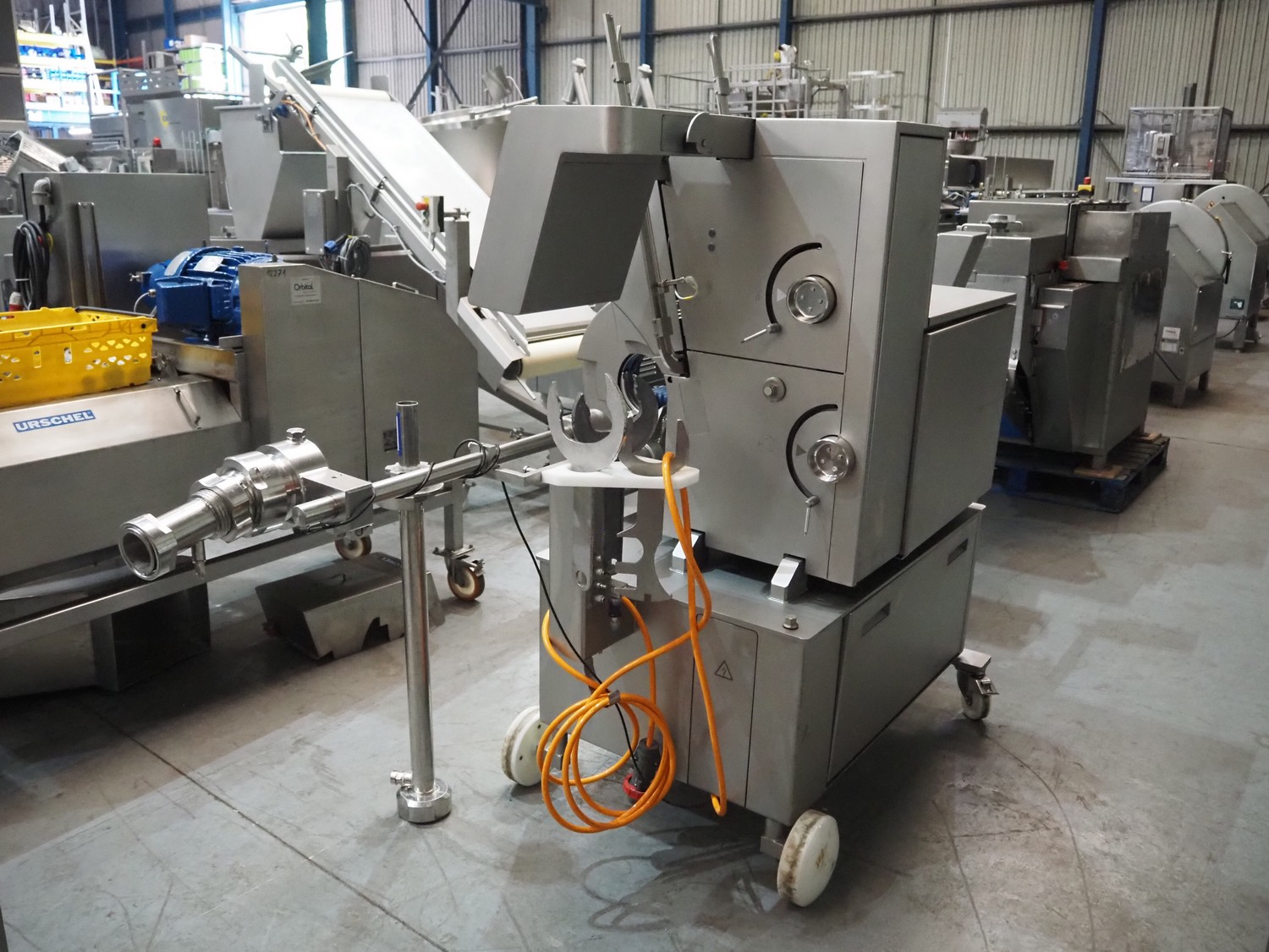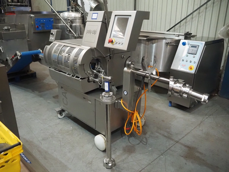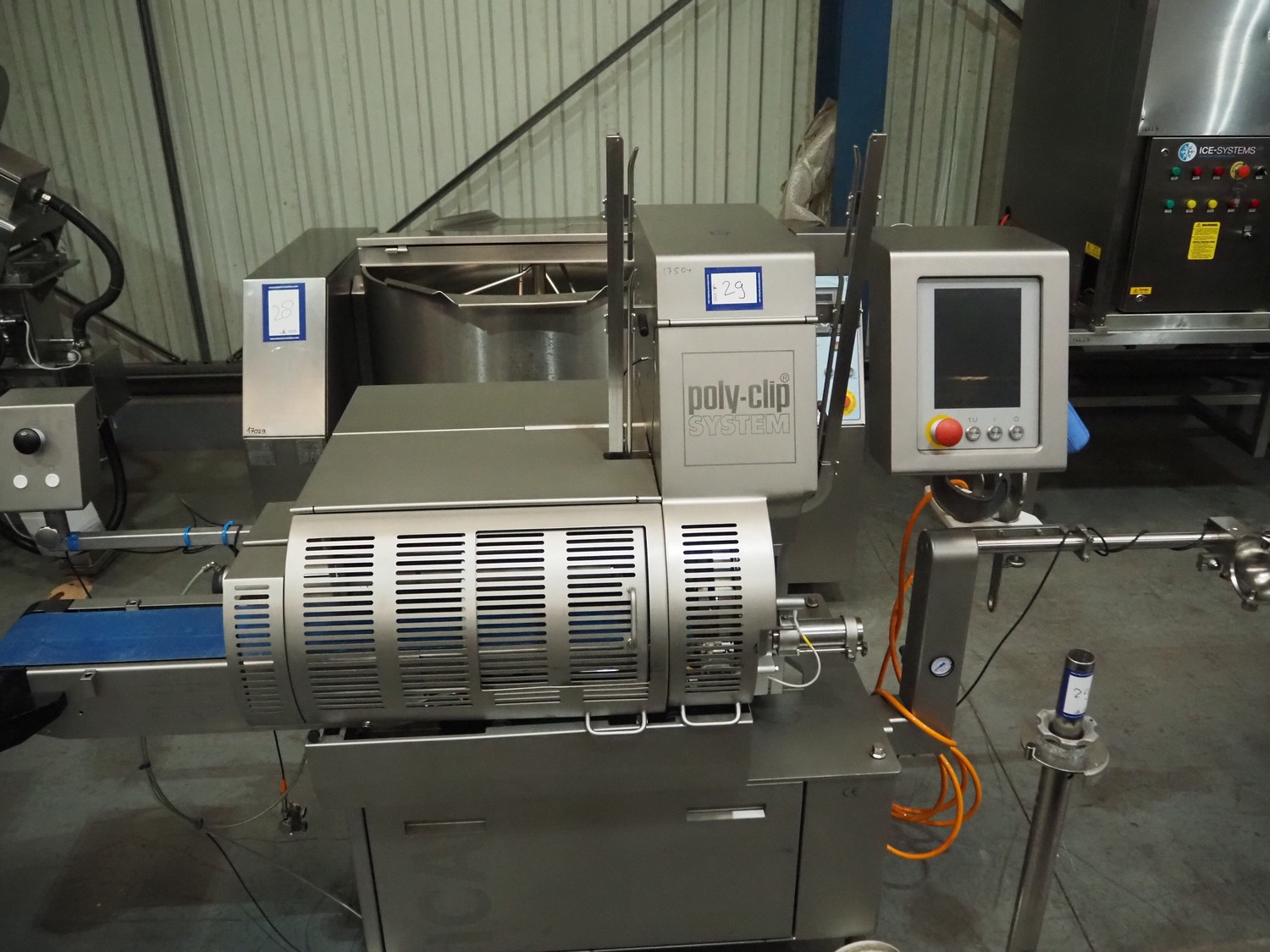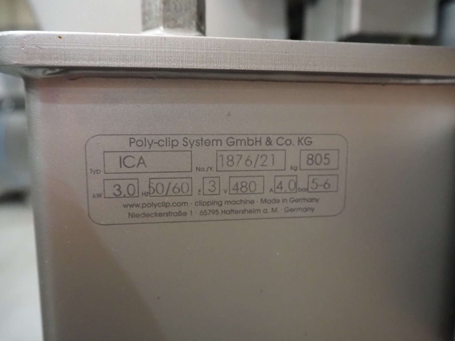 Poly-clip System GmbH & Co. KG mobile automatic double clipper, type: ICA, number: 1876, year of construction: 2021, 480 V, 3 Ph, 50/60 Hz, 4.0 A, 3.0 kW, weight: 805 kg, plastic belt, belt width: 180 mm, total dimensions: 2850 mm x 900 mm x 1850 mm.
