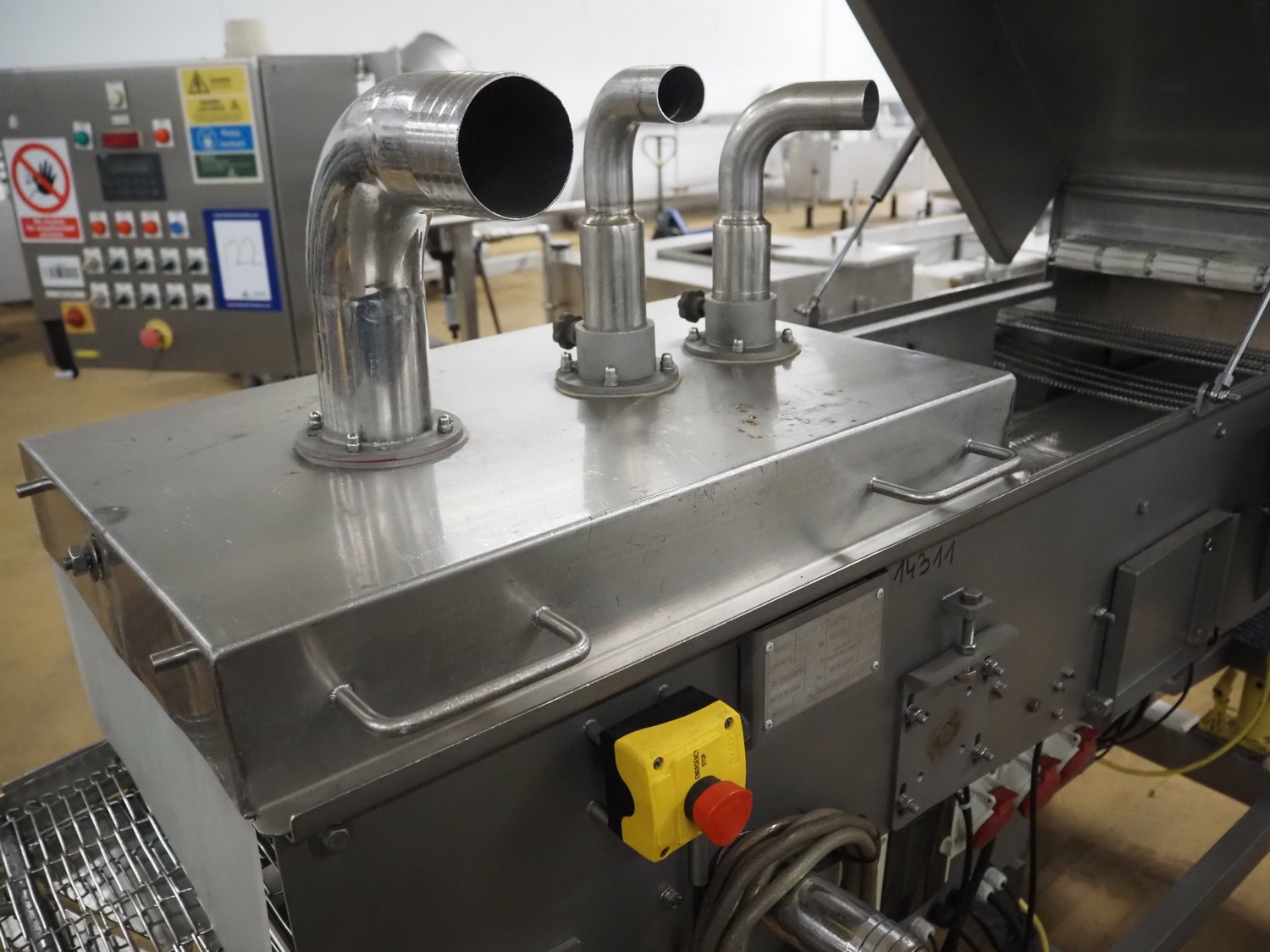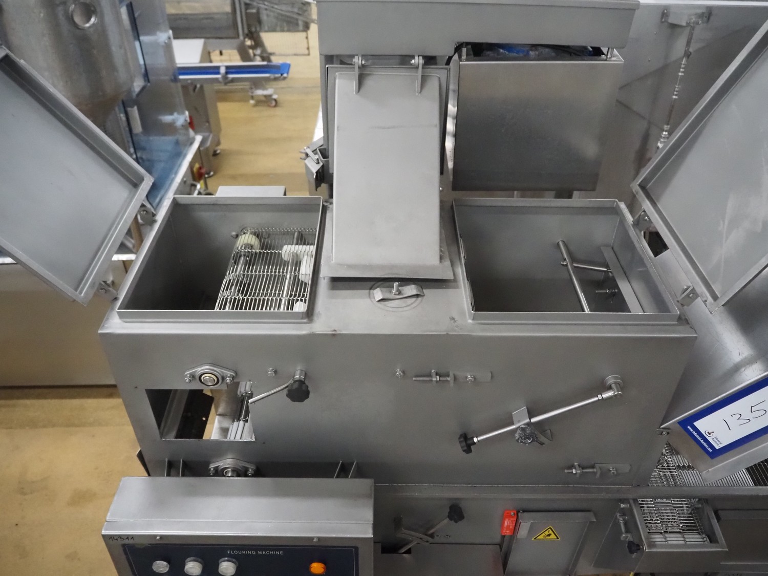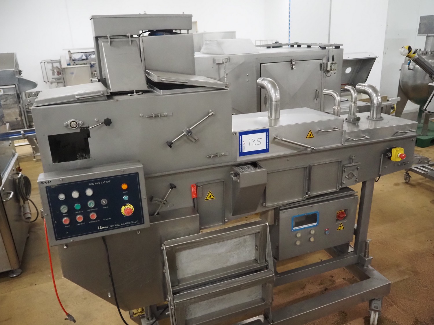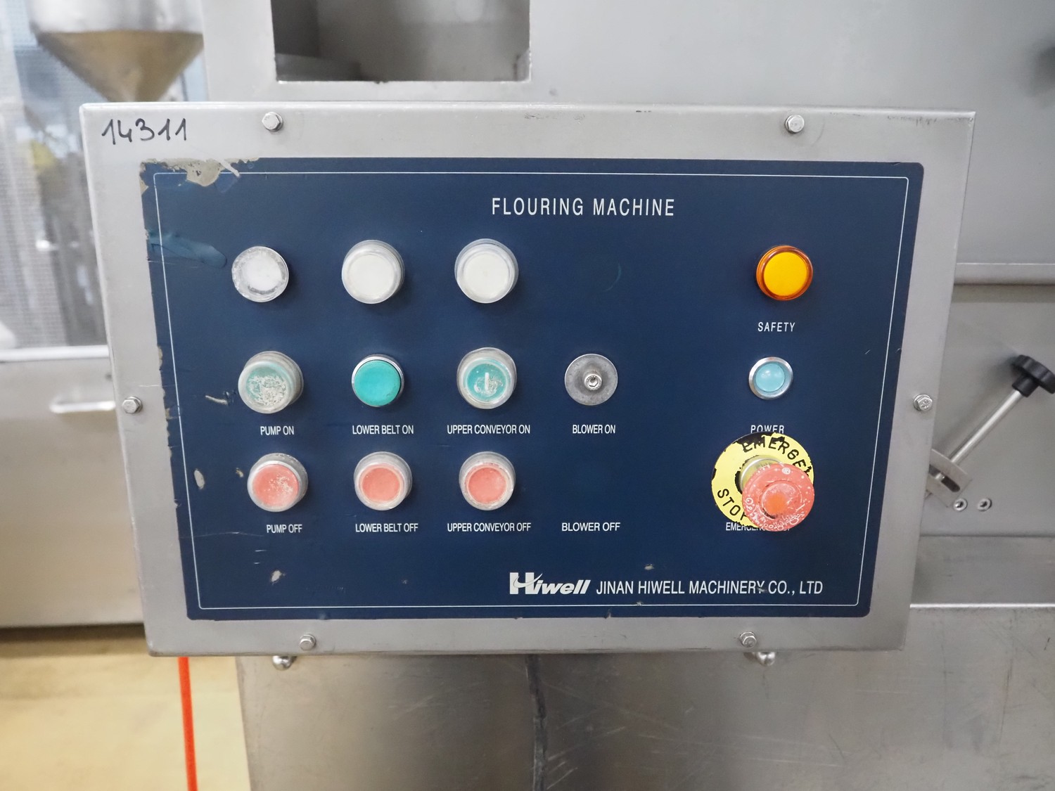 Hiwell flouring machine, model: SFJ400-III, serial number: 0541004, year of construction: 2010.04.02, 380 V, 50 Hz, 2.81 kW, weight: 630 kg, s/s mesh belt, belt width: 400 mm, total dimensions: 2700 mm x 1070 mm x 2200 mm.