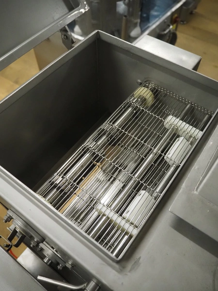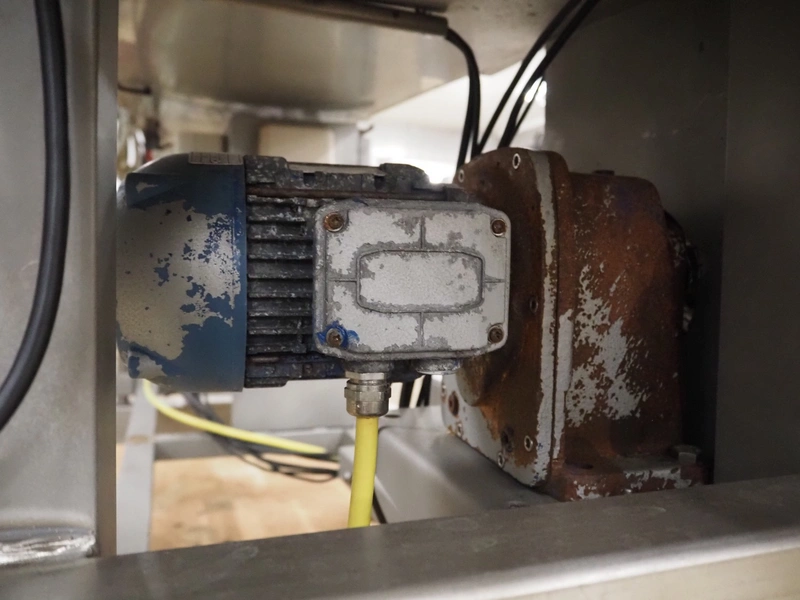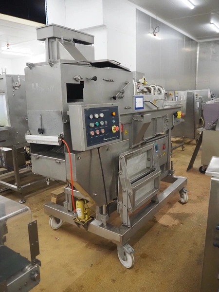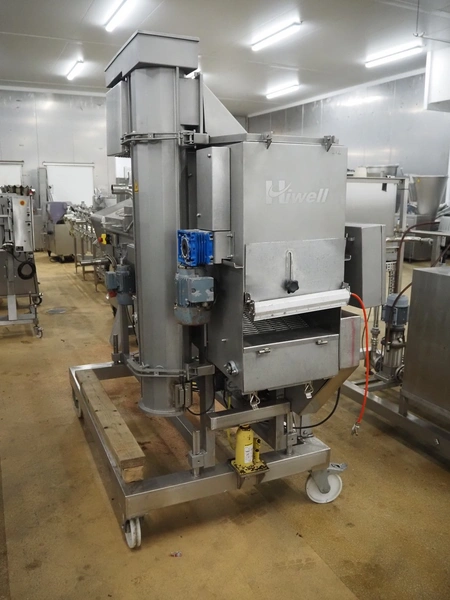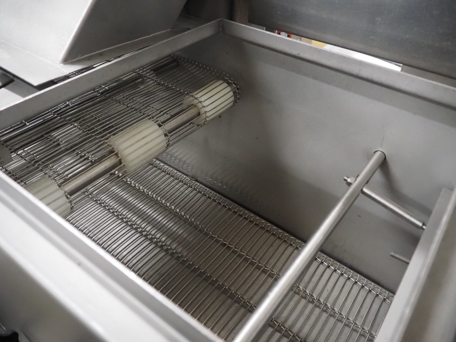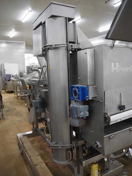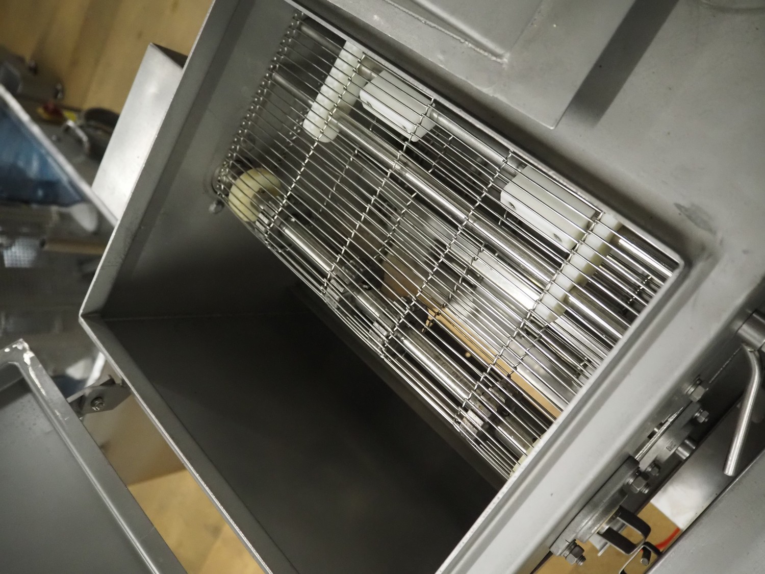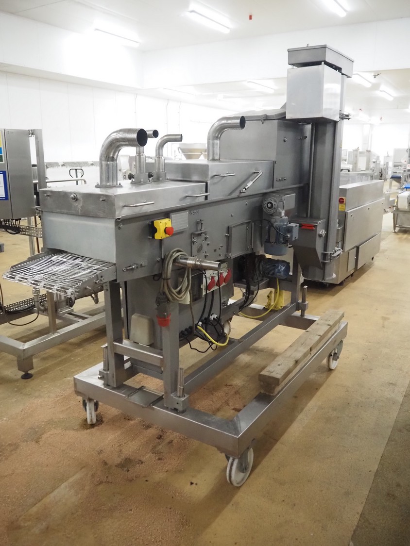 Hiwell flouring machine, model: SFJ400-III, serial number: 0541004, year of construction: 2010.04.02, 380 V, 50 Hz, 2.81 kW, weight: 630 kg, s/s mesh belt, belt width: 400 mm, total dimensions: 2700 mm x 1070 mm x 2200 mm.