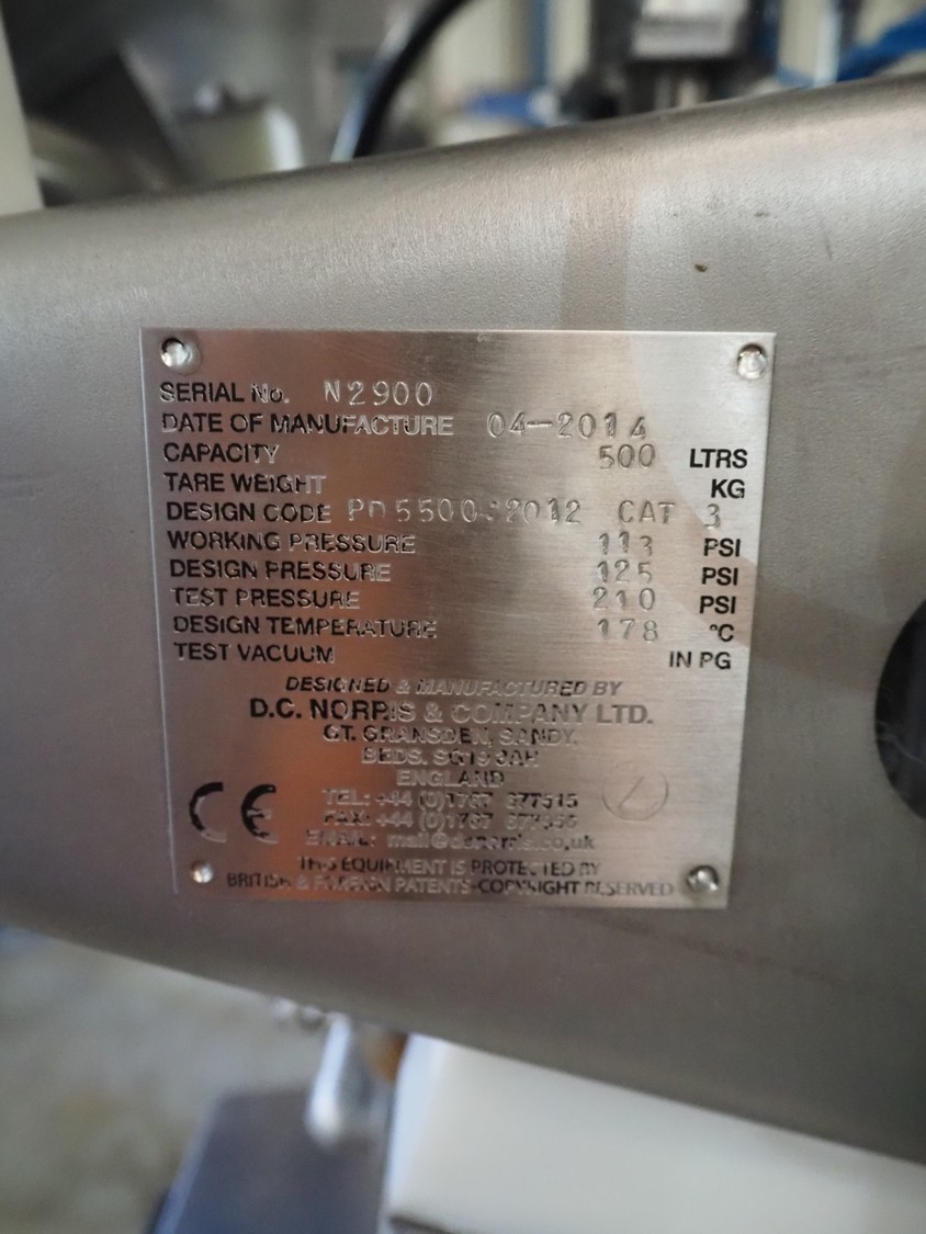 D.C. Norris & Company Ltd. cooking vessel with mixing arm, serial number: N2900, year of construction: 2014, volume: 500 litres, dimensions: 1600 mm x 1100 mm x 2000 mm. Including s/s switch cabinet, dimensions: 650 mm x 400 mm x 1000 mm.