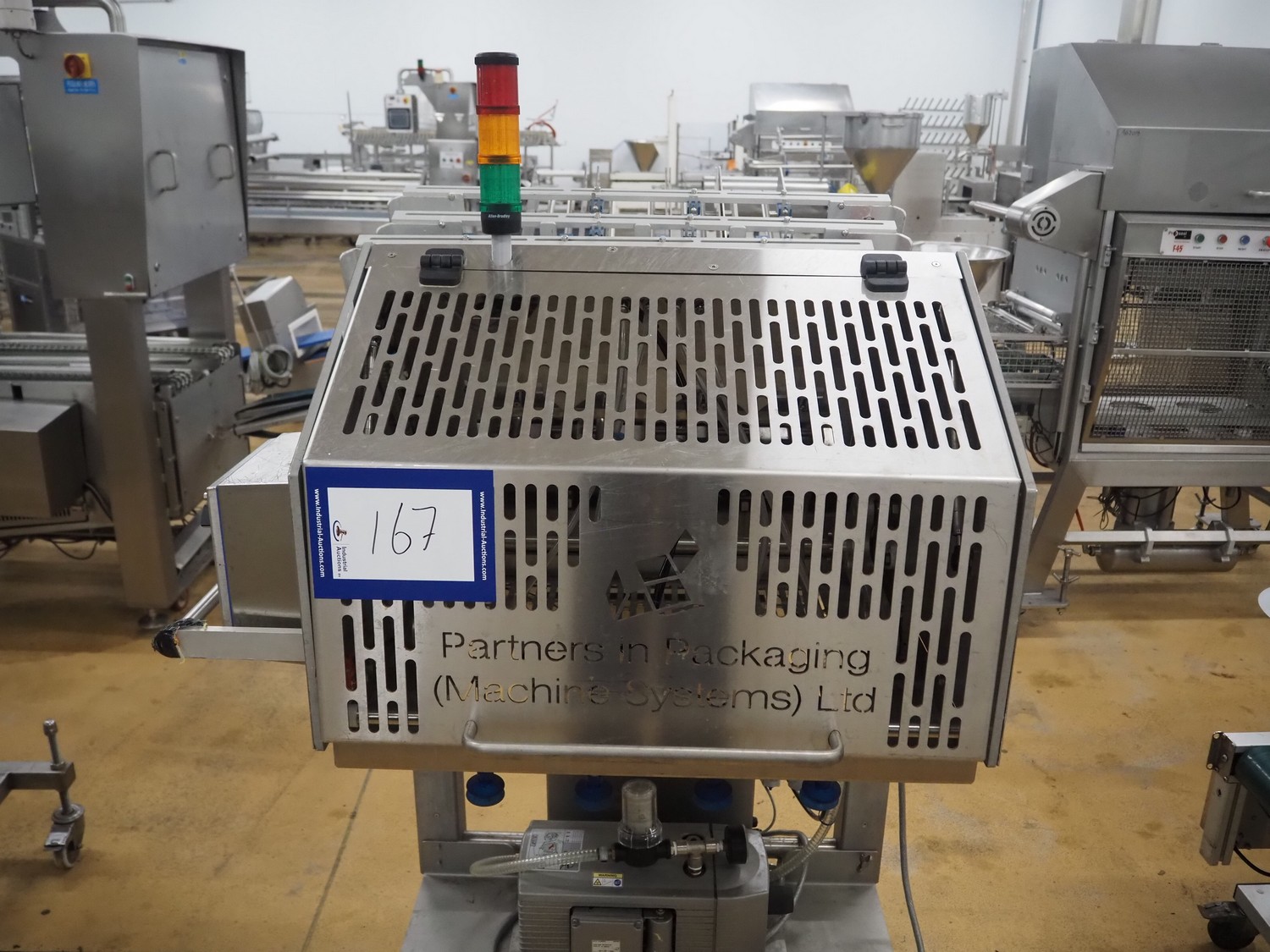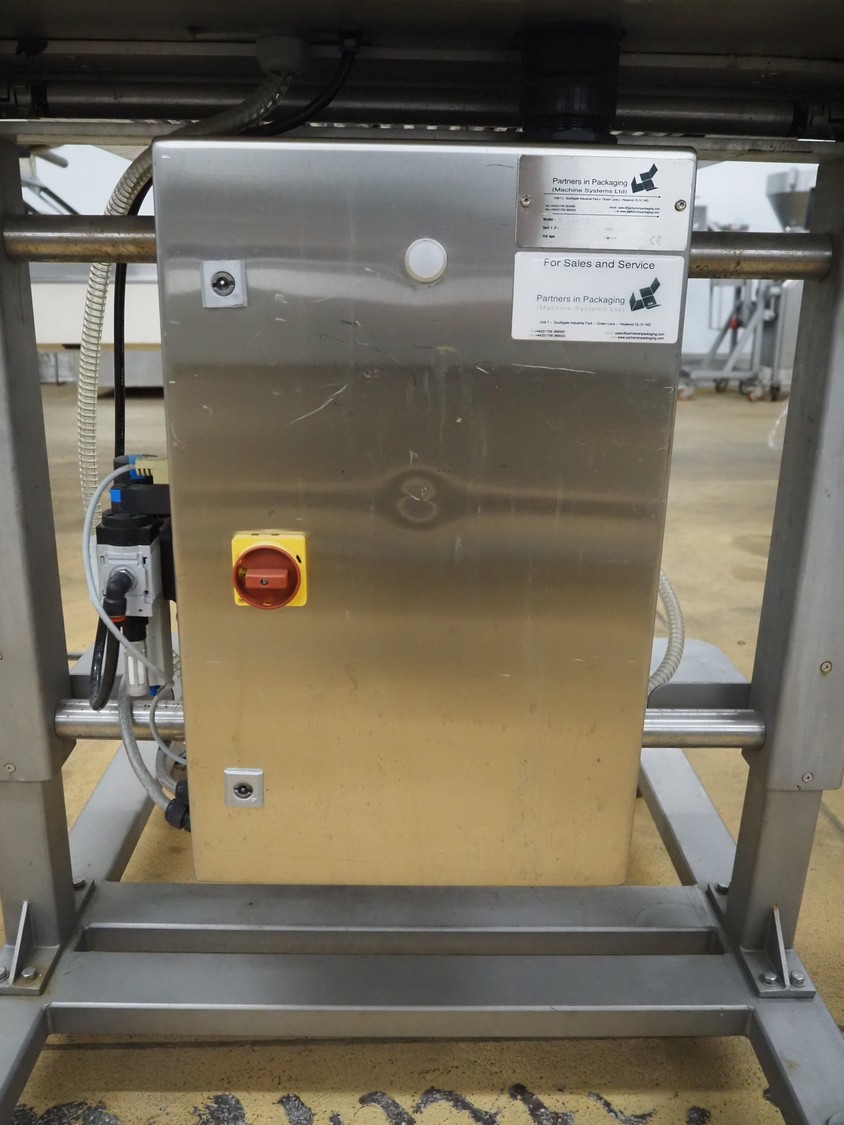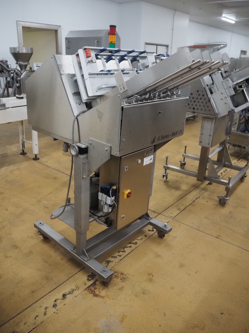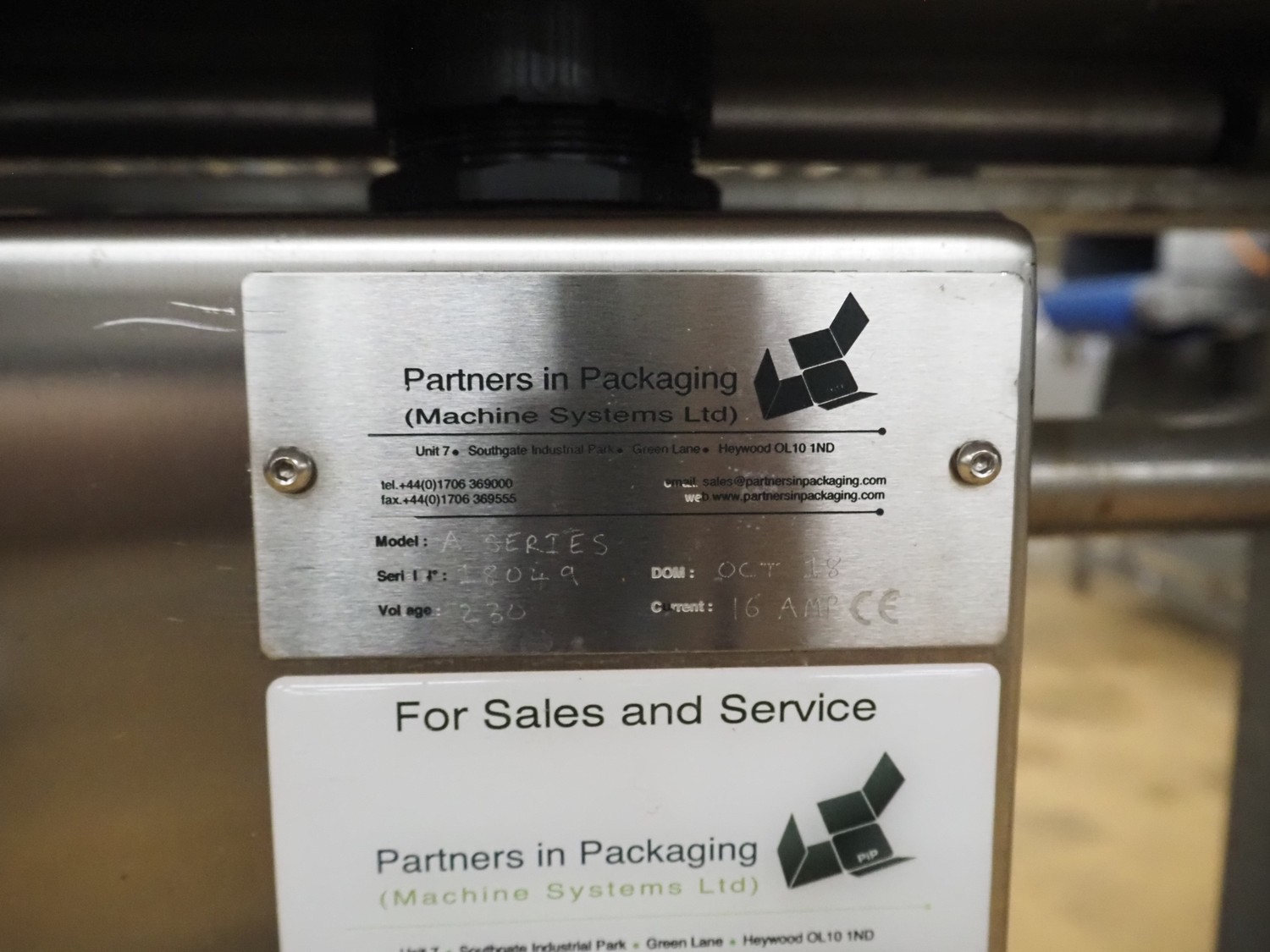 Partners in Packaging denester, model: A Series, serial number: 18049, year of construction: 2018, 230 V, 16 A, 4 trays, dimensions trays: (4x) 110 mm x 65 mm, total dimensions: 1350 mm x 1050 mm x 1800 mm.