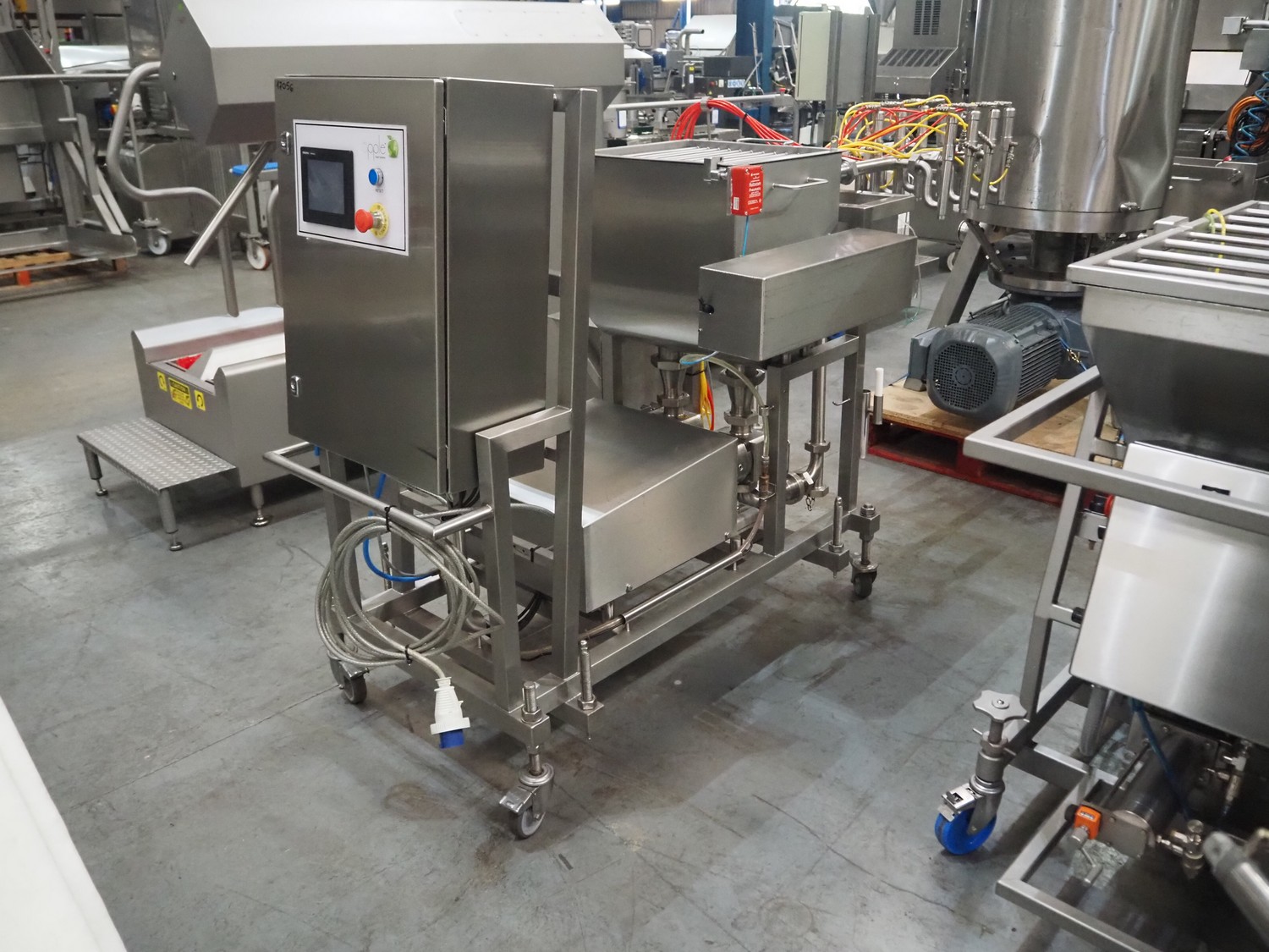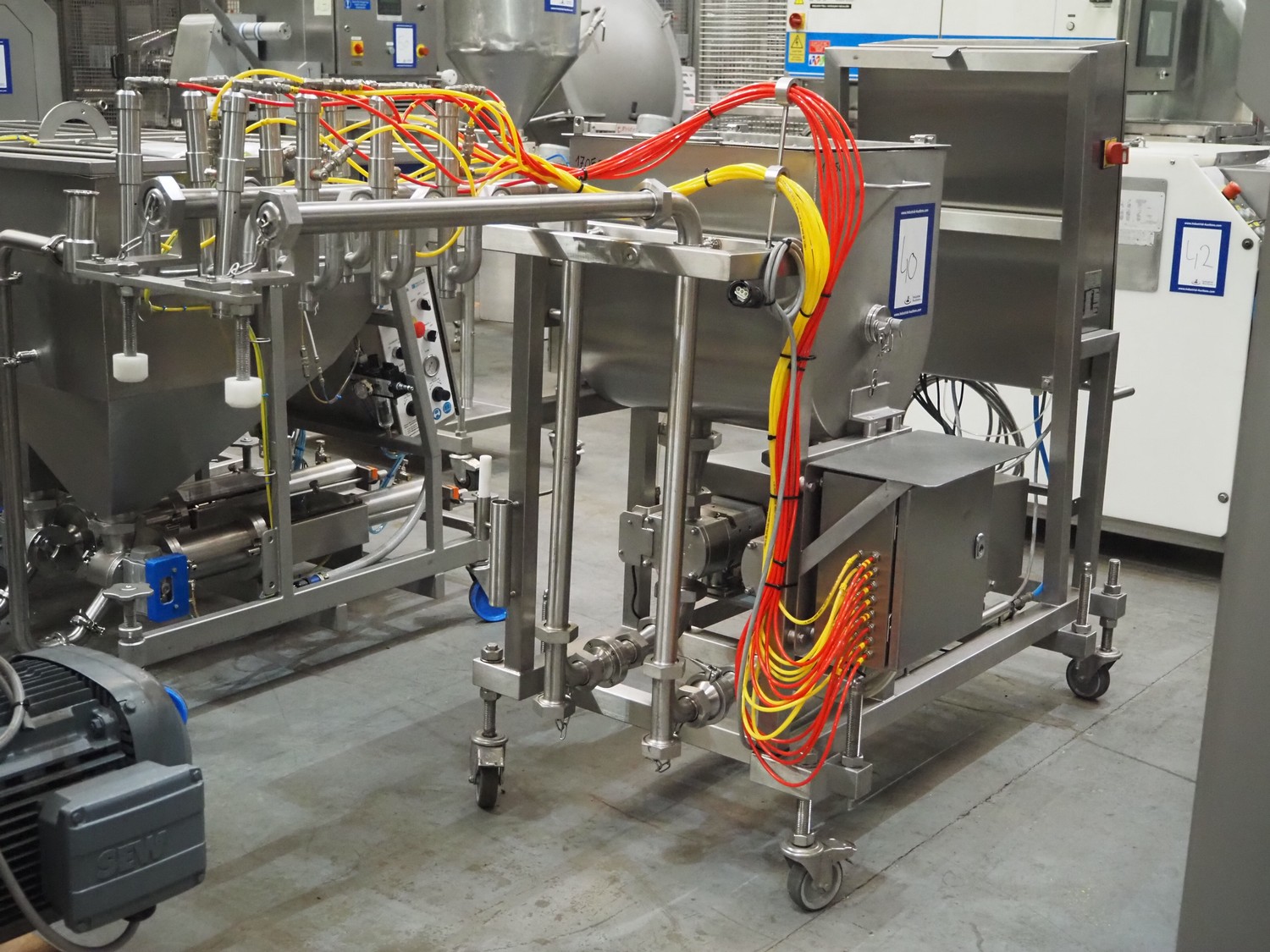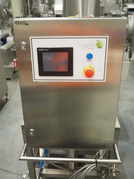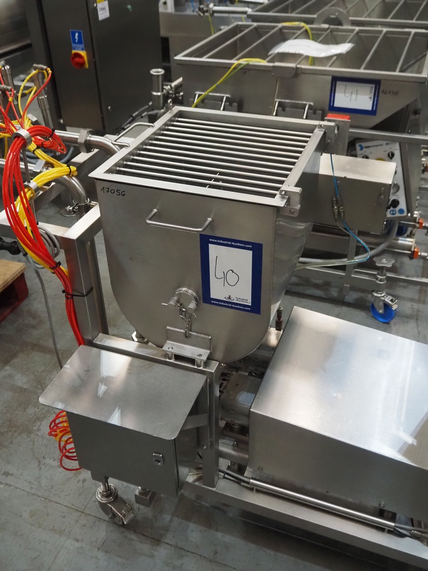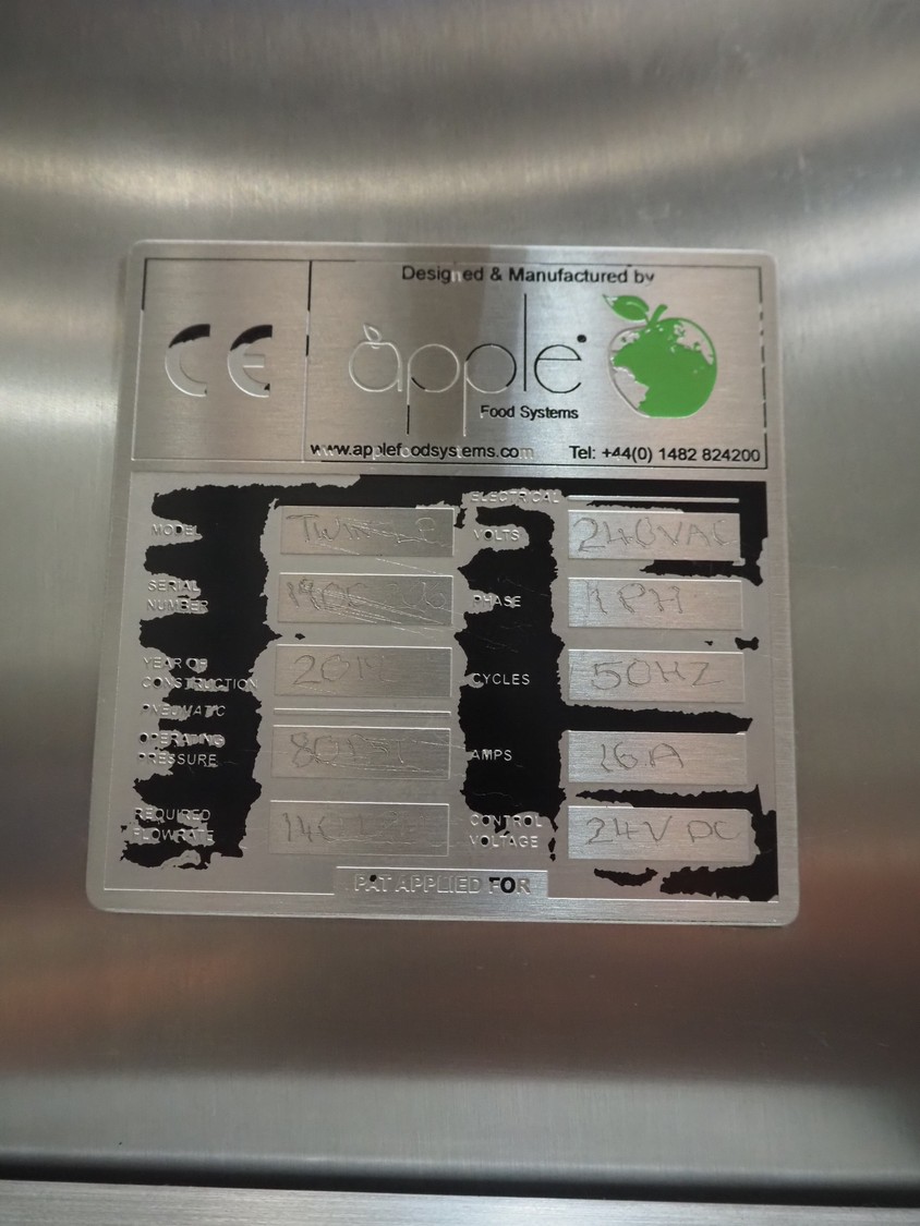 Apple Food Systems mobile depositor, 8-heads, model: Twin LP, year of construction: 2012, 240 Vac, 1 Ph, 50 Hz, 16 A, inside dimensions infeed tub: 490 mm x 420 mm x 800 mm, diameter filling heads: (8x) 20 mm, total dimensions: 2370 mm x 1000 mm x 1430 mm.