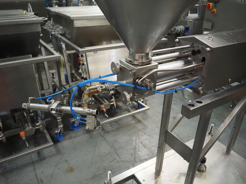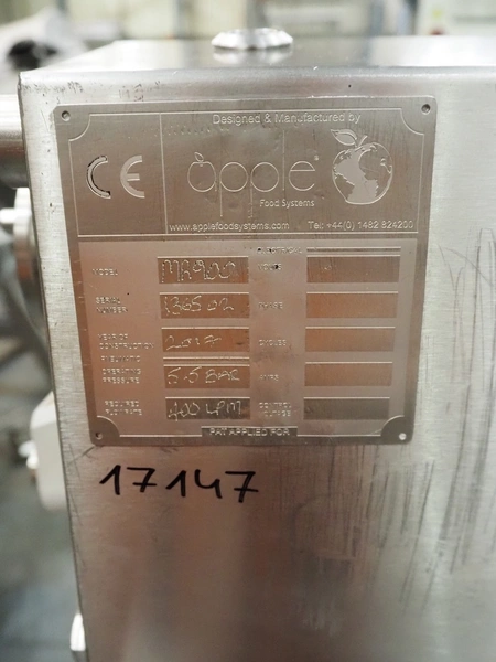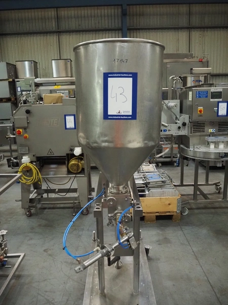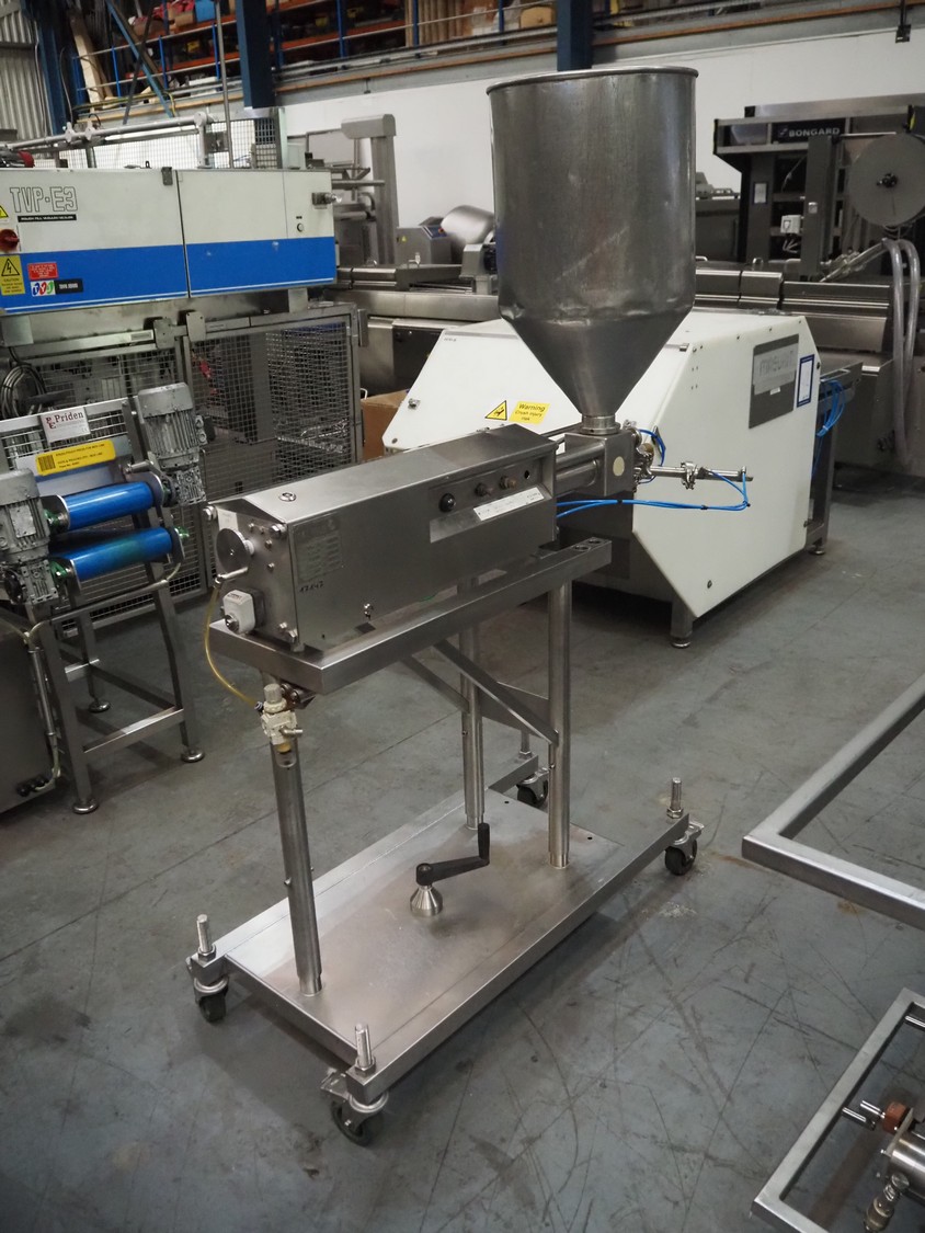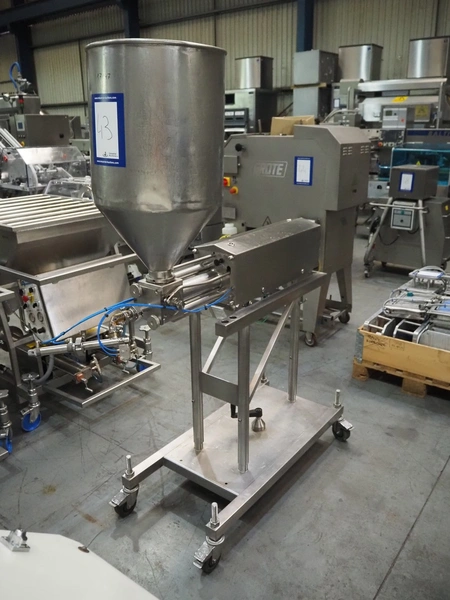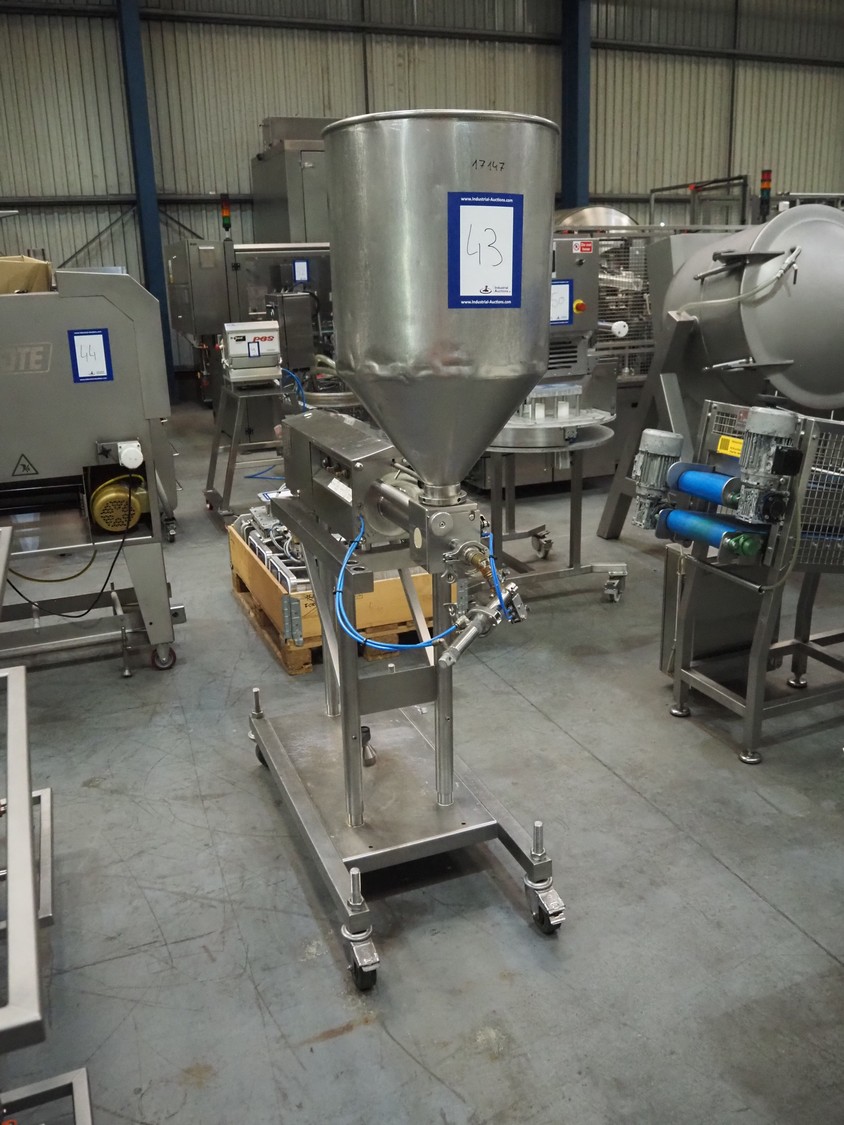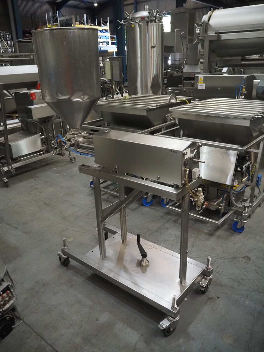 Apple Food Systems mobile depositor, model: MR900, serial number: 136502, year of construction: 2017, 400 V, inside dimensions infeed tub: ø 400 mm x 800 mm, diameter filling heads: 20 mm, total dimensions: 1500 mm x 520 mm x 1820 mm.