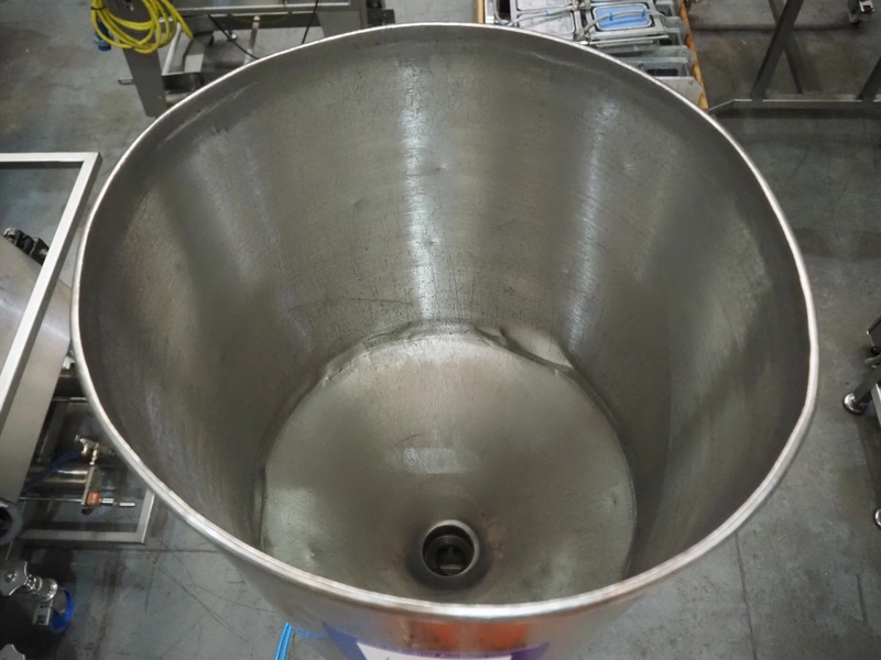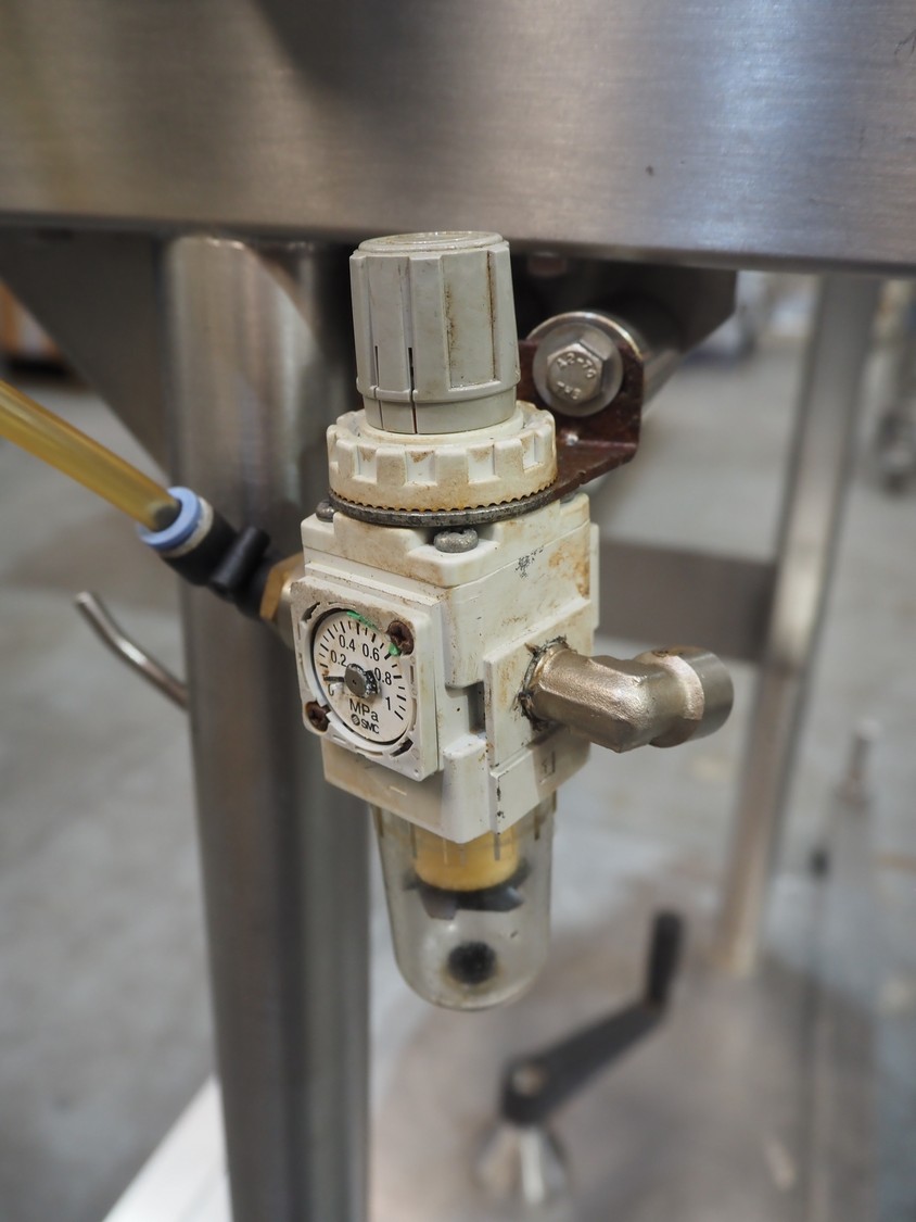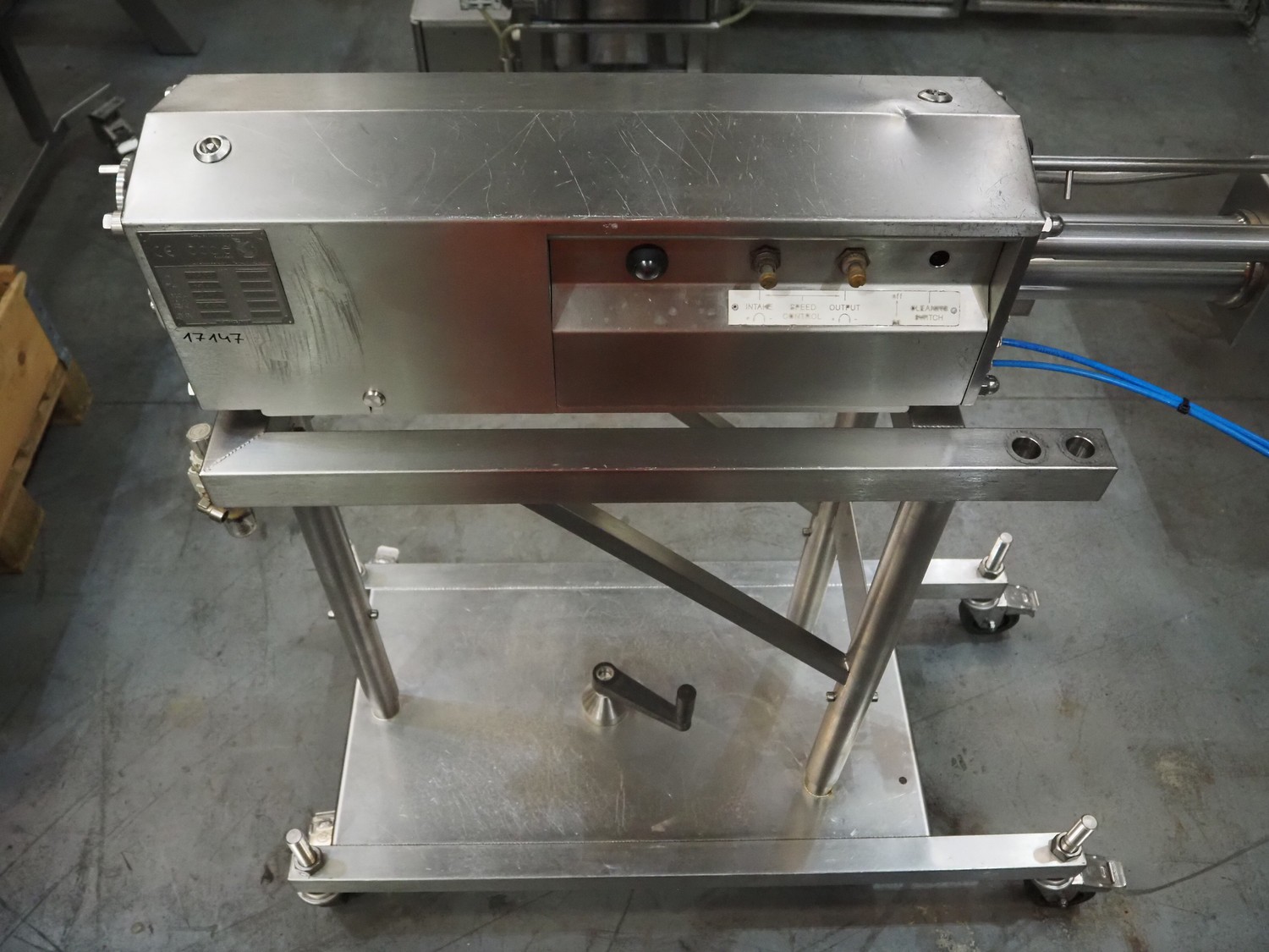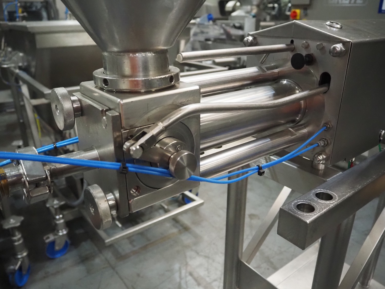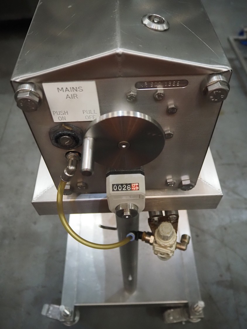 Apple Food Systems mobile depositor, model: MR900, serial number: 136502, year of construction: 2017, 400 V, inside dimensions infeed tub: ø 400 mm x 800 mm, diameter filling heads: 20 mm, total dimensions: 1500 mm x 520 mm x 1820 mm.
