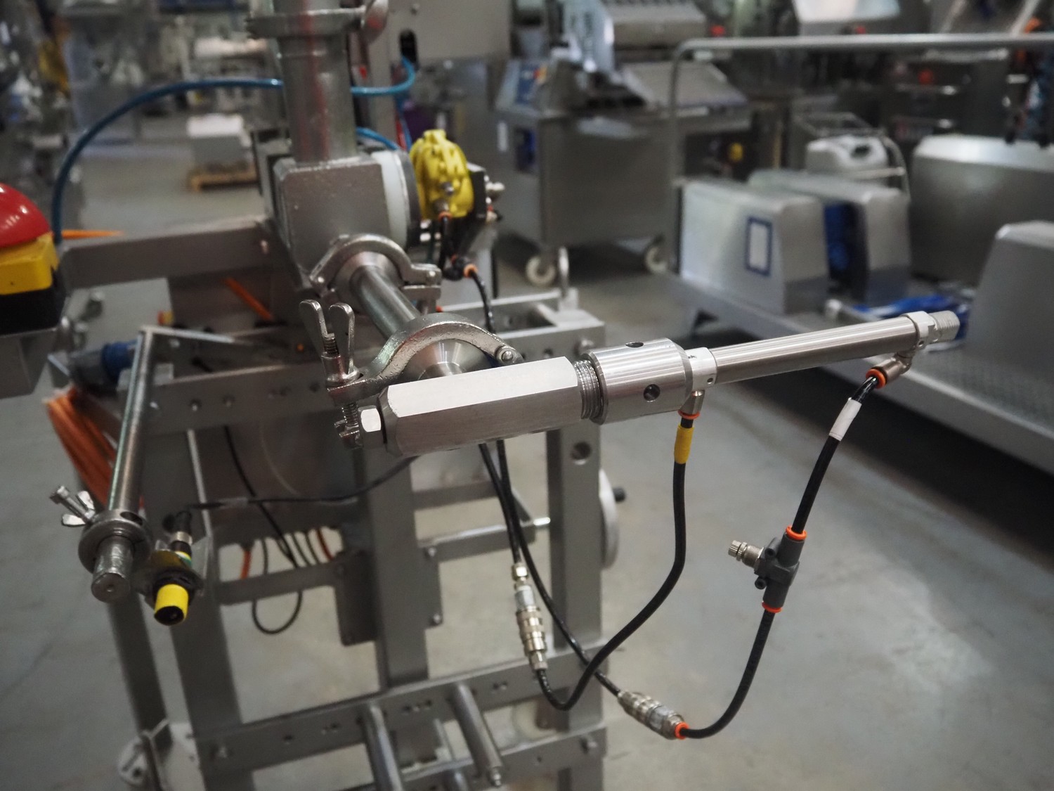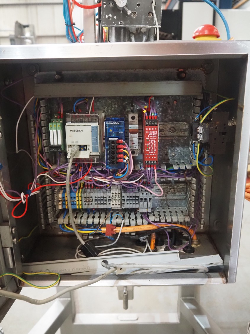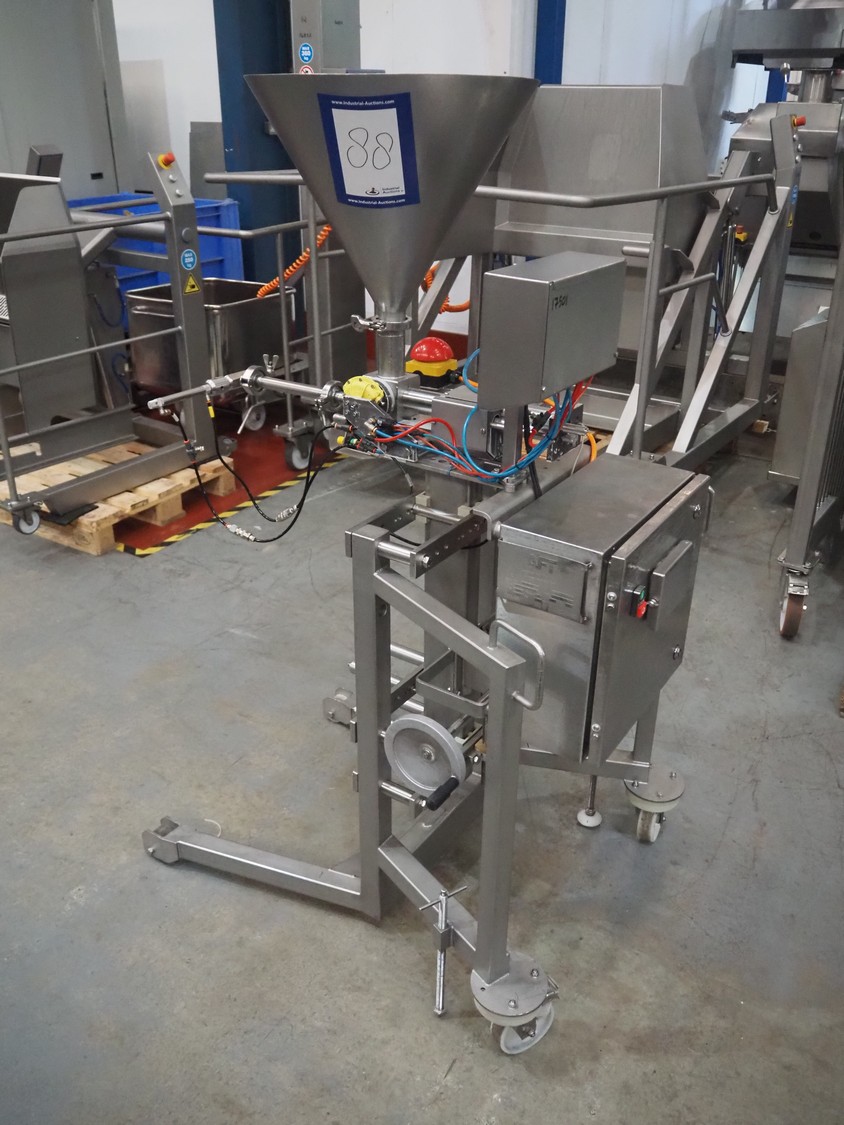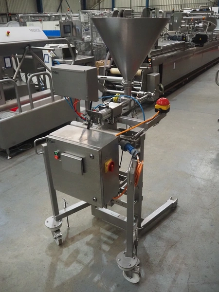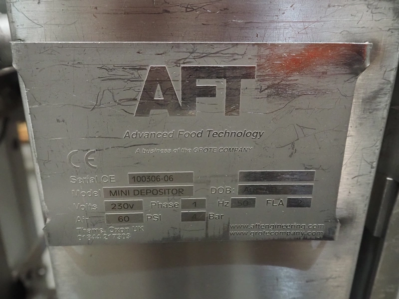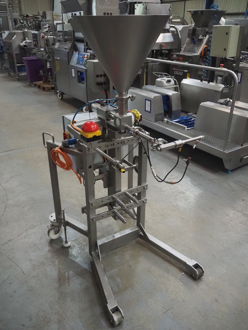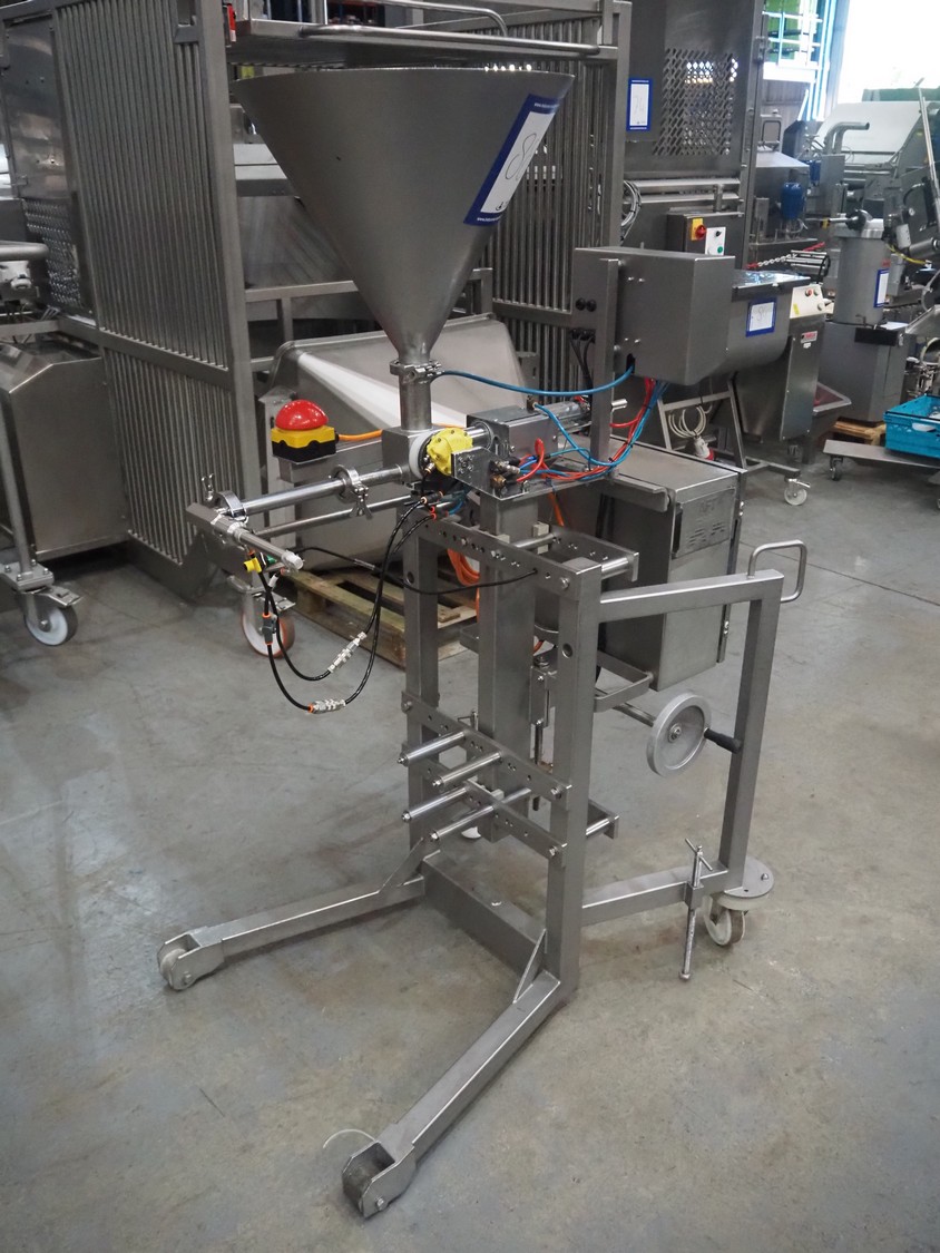 Advanced Food Technology mobile depositor, model: MINI DEPOSITOR, serial number: 100306-06, year of construction: 2010, 230 V, 1 Ph, 50 Hz, inside dimensions tub: ø 490 mm x 400 mm, total dimensions: 1000 mm x 800 mm x 1650 mm.