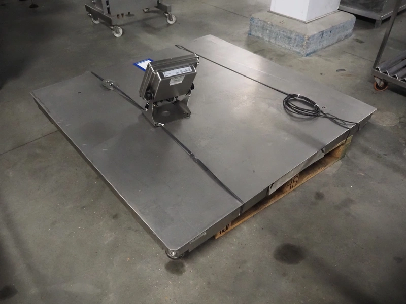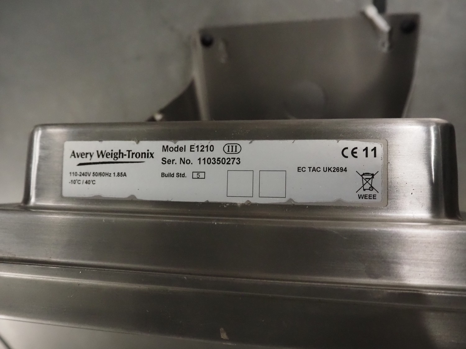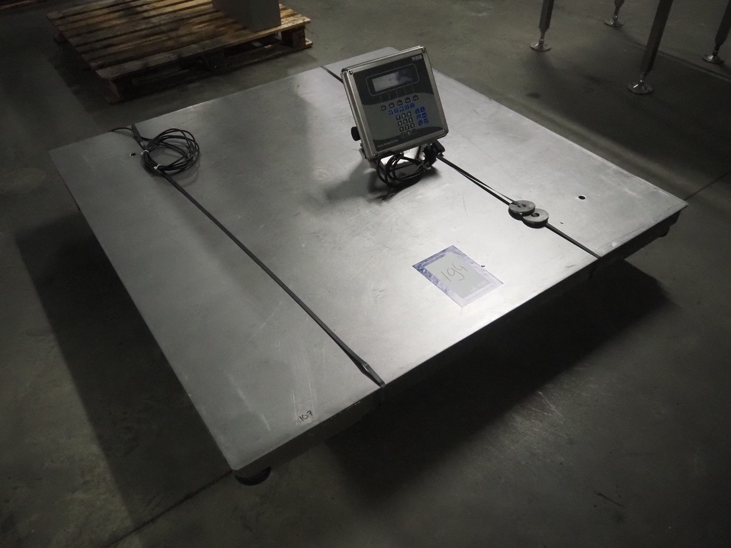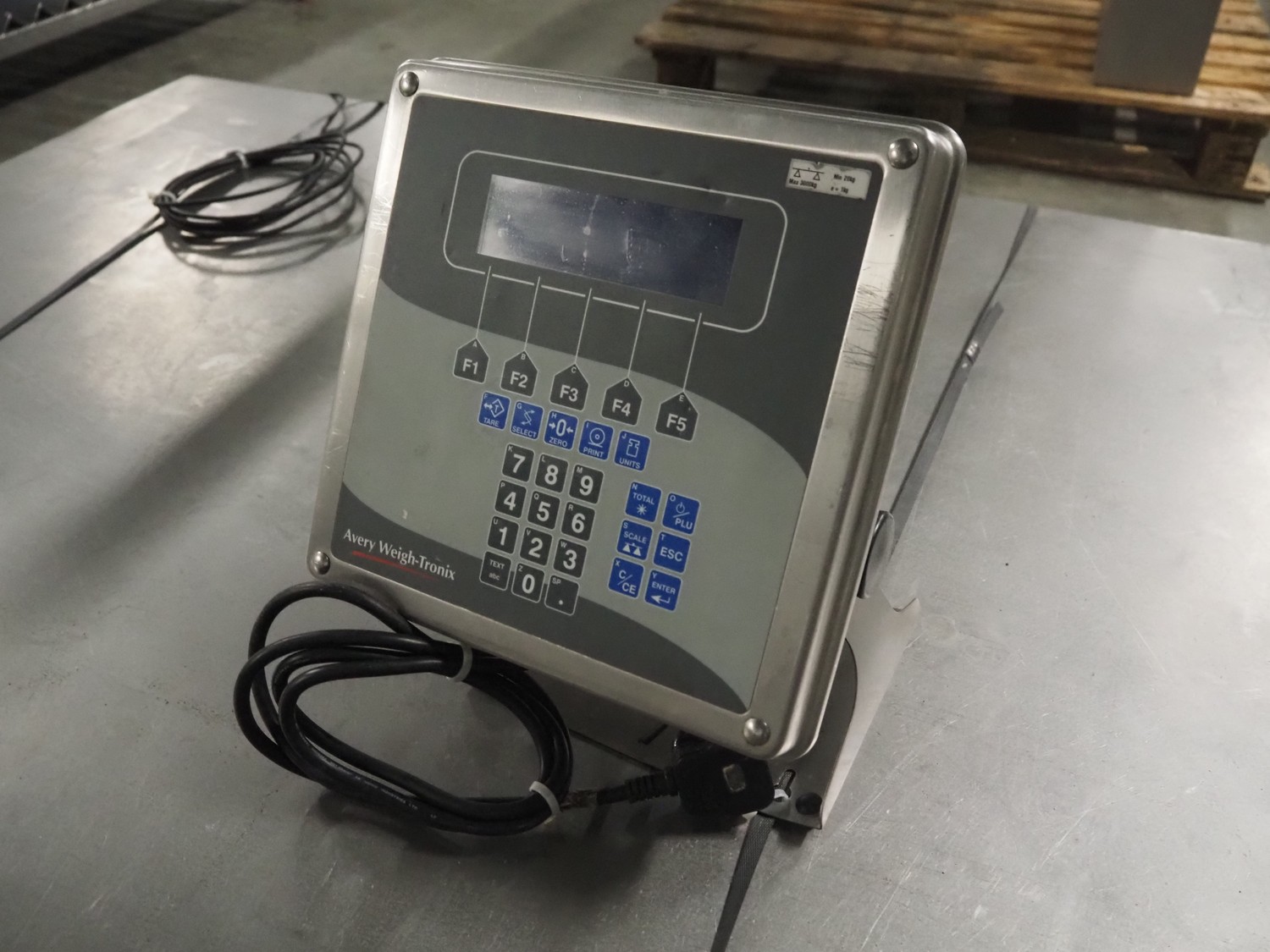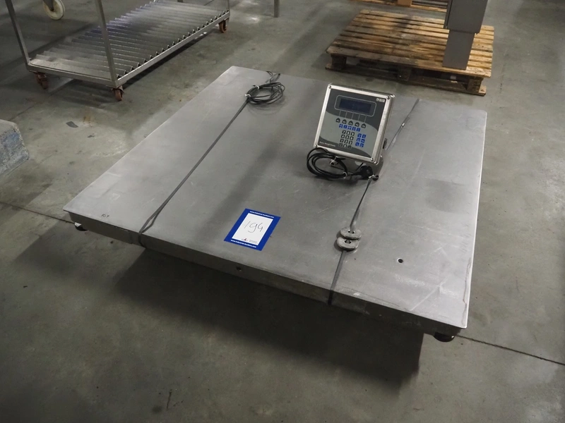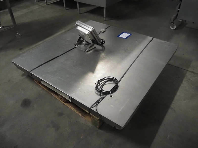 Avery Weigh-Tronix s/s floor weighing scale, model indicator: E1210, serial number: 110350273, 110-240 V, 50/60 Hz, 1.85 A, weighing range: 20 kg - 3000 kg, e=1kg, dimensions indicator: 300 mm x 250 mm x 350 mm, dimensions scale: 1500 mm x 1500 mm.