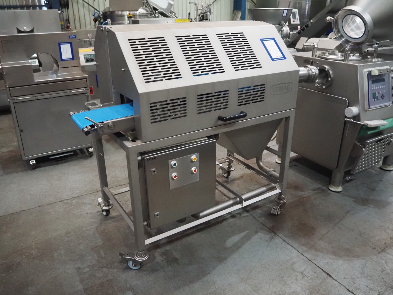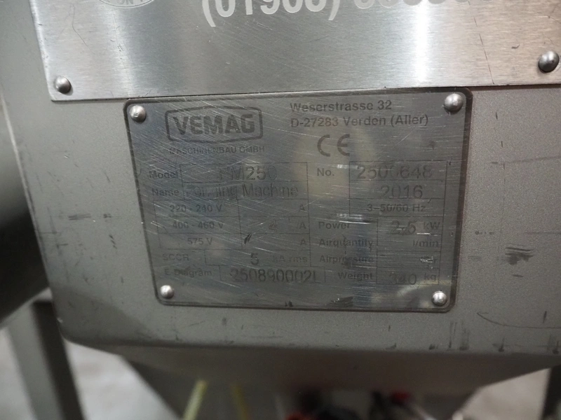 Vemag mobile forming machine, model: FM250, number: 2500648, year of construction: 2016, 400-460 V, 3 Ph, 50/60 Hz, 4 A, 2.5 kW, weight: 340 kg, diameter clearance: 90 mm, plastic belt, belt width: 245 mm, total dimensions: 2000 mm x 850 mm x 1500 mm