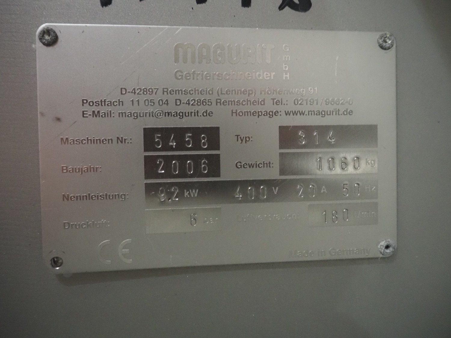 Magurit GmbH flaker, type: 314, machine number: 5458, year of construction: 2006, 400 V, 50 Hz, 20 A, 9.2 kW, working width: 440 mm, total dimensions: 2300 mm x 1050 mm x 1350 mm.