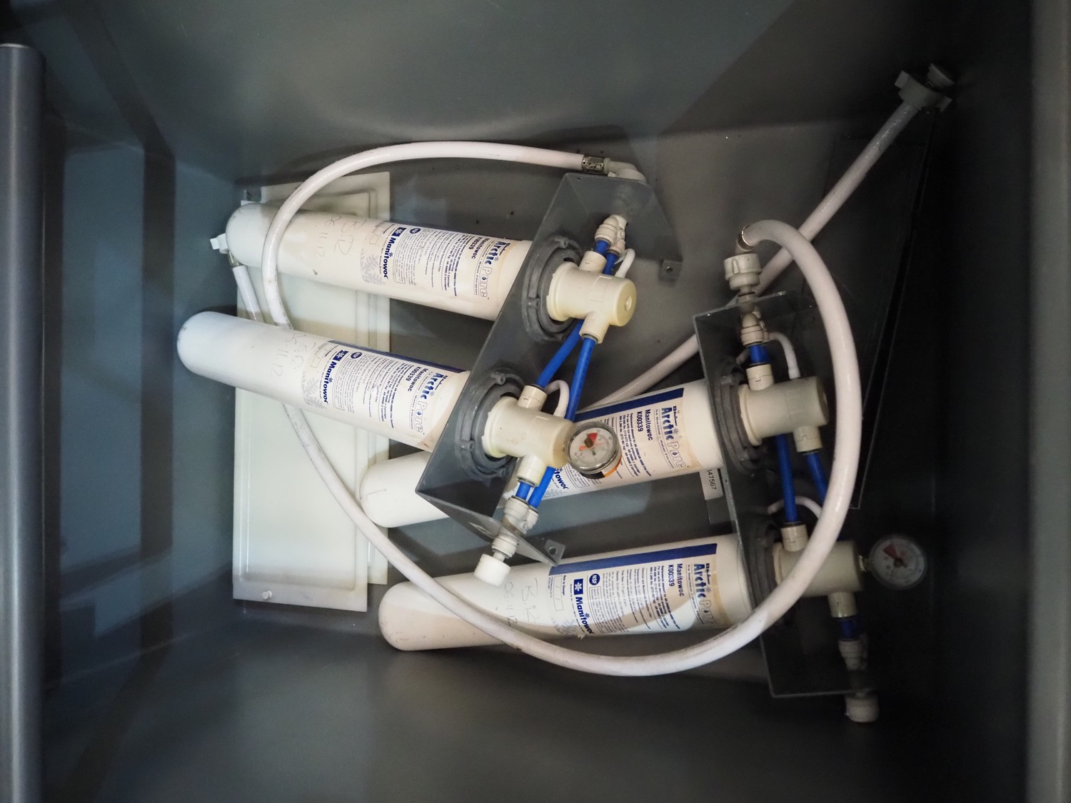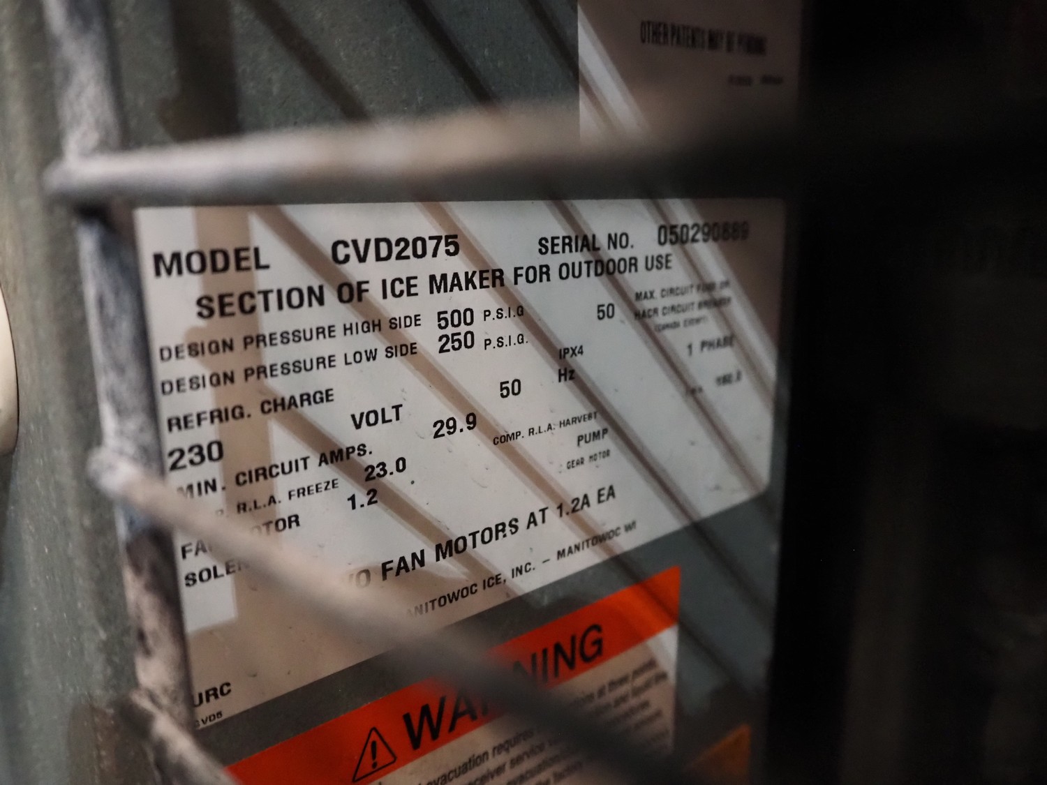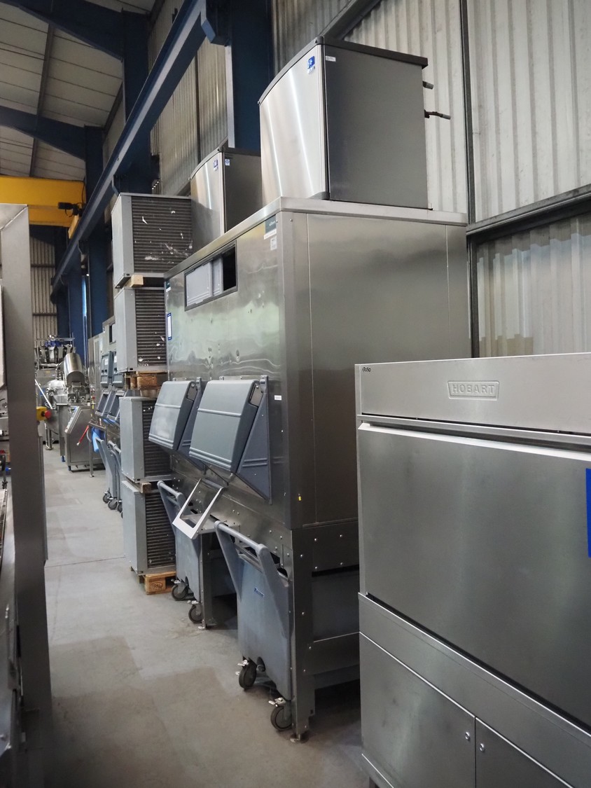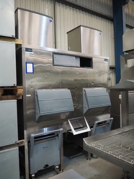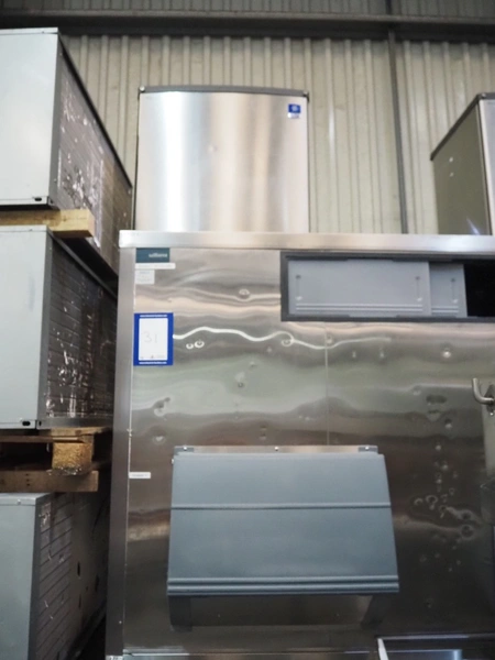 Manitowoc ice inc double ice machine with ice storage and ice trolleys, model: QDDUAL2C, 230 V, 1 Ph, 50 Hz, dimensions: ice machine: (2x) 750 mm x 600 mm x 750 mm. With William ice storage, dimensions: 2300 mm x 1100 mm x 2450 mm and 3 ice trolleys, dimensions: (3x) 630 mm x 1050 mm x 900 mm. Including 2 cooling compressors, model: CVD2075, dimensions: (2x) 1350 mm x 610 mm x 670 mm.