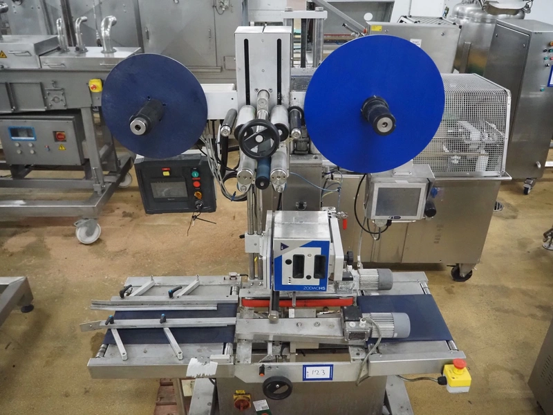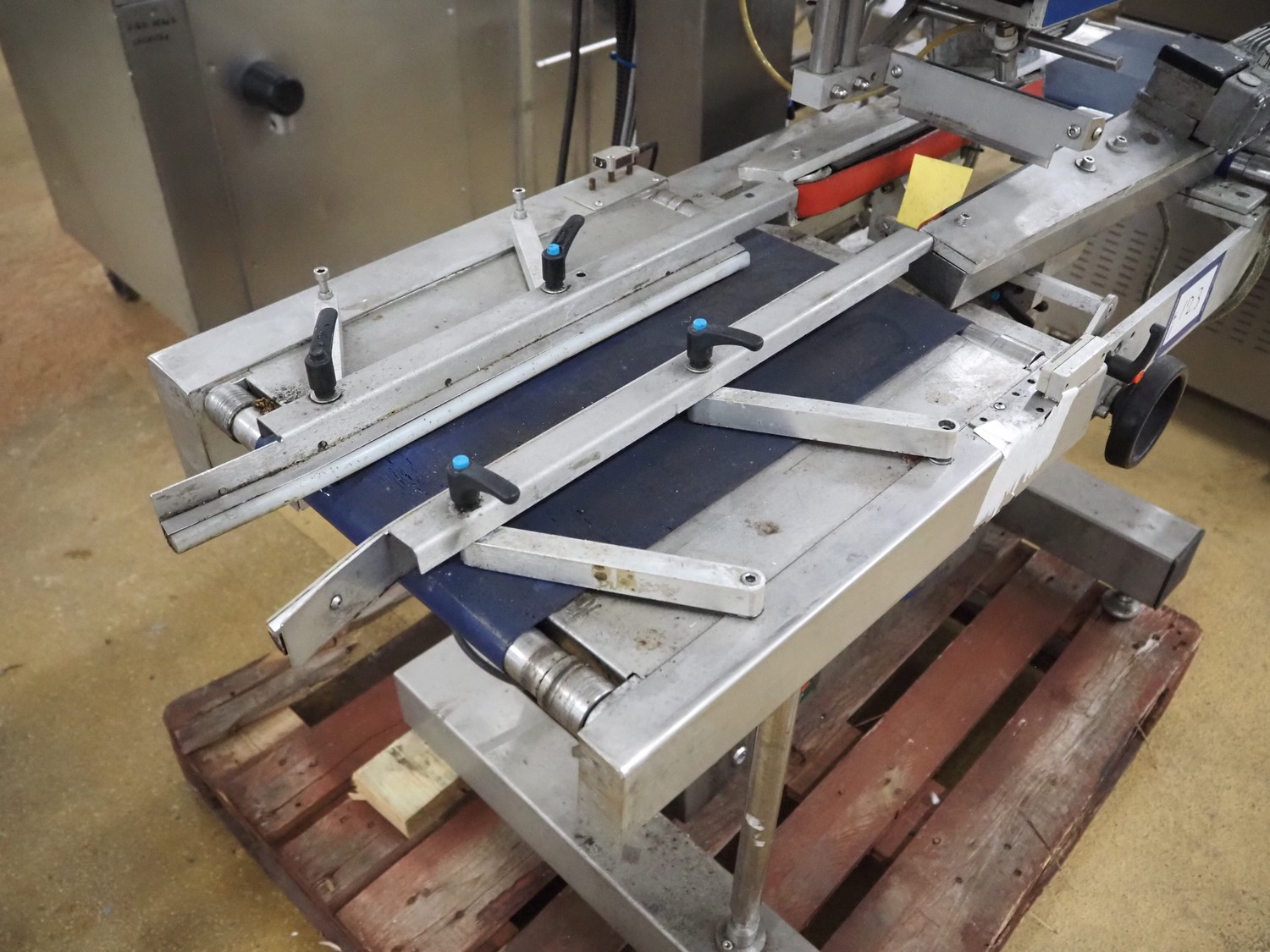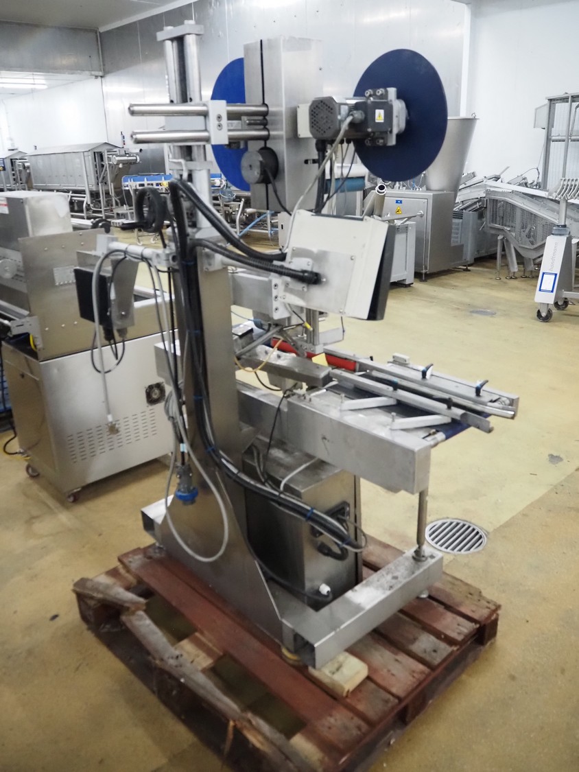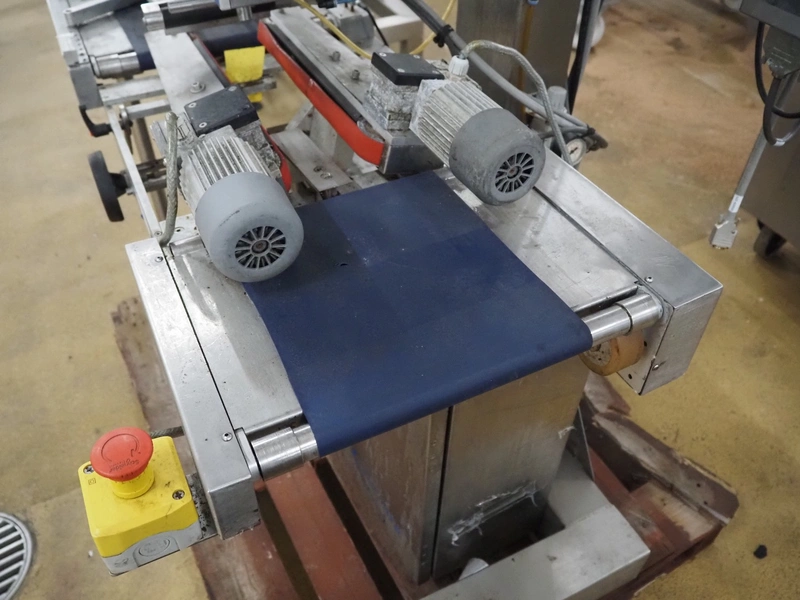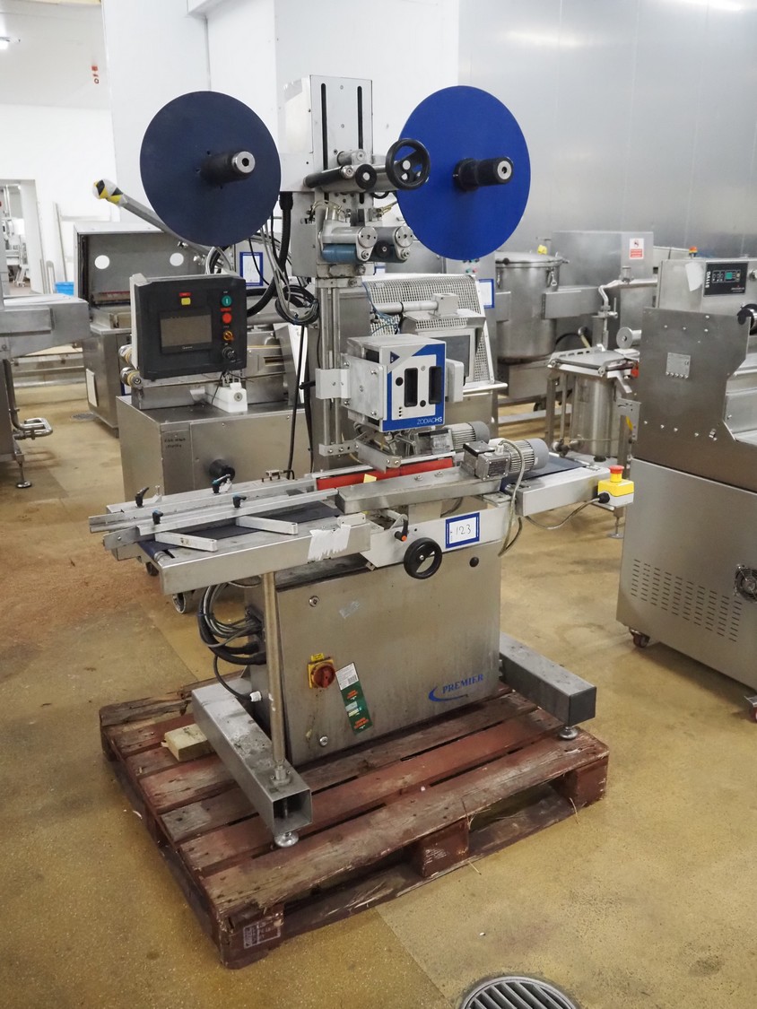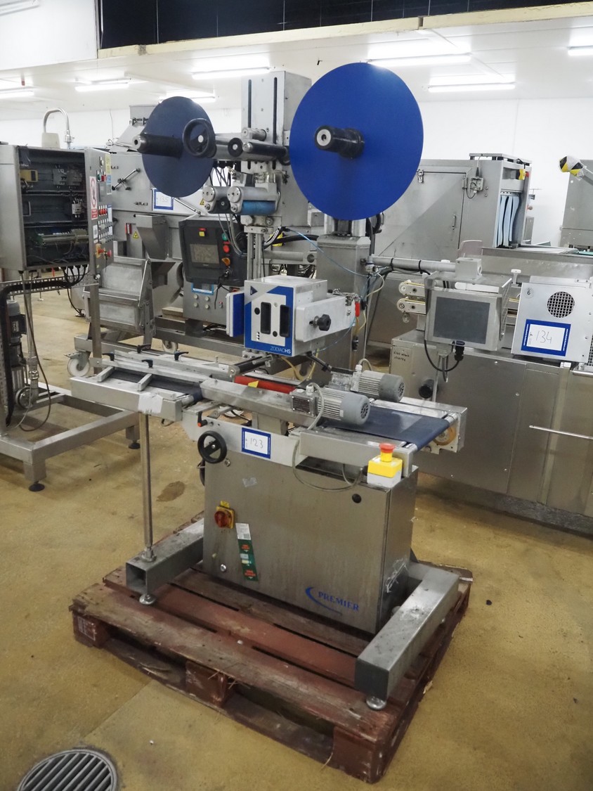 Premier labelling machine, plastic belt, belt width: (2x) 240 mm, total dimensions: 1300 mm x 850 mm x 1800 mm. Incomplete.