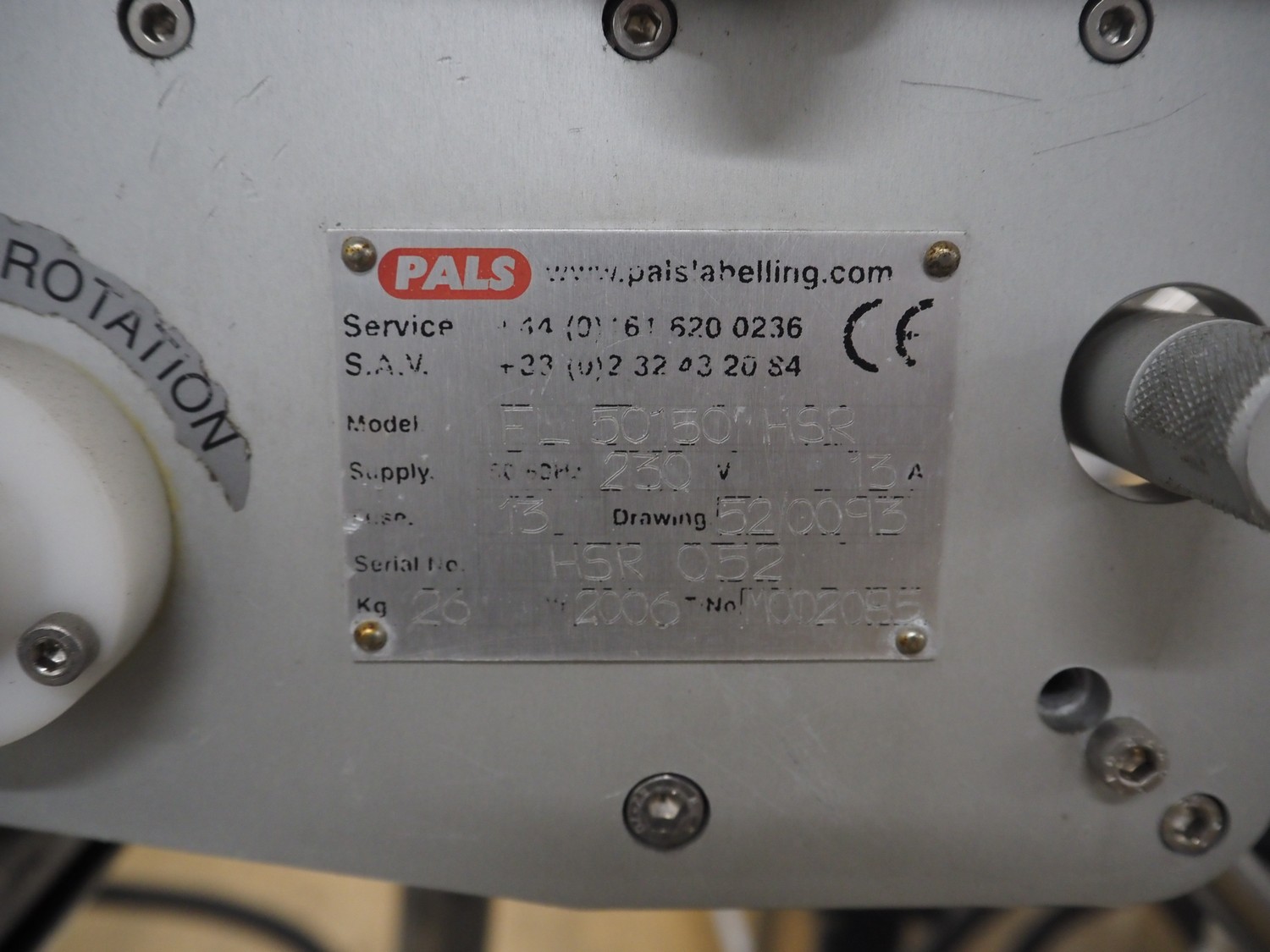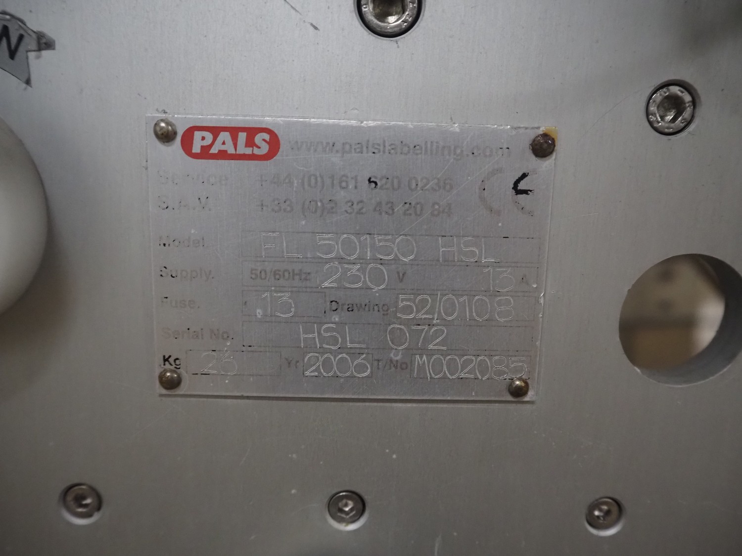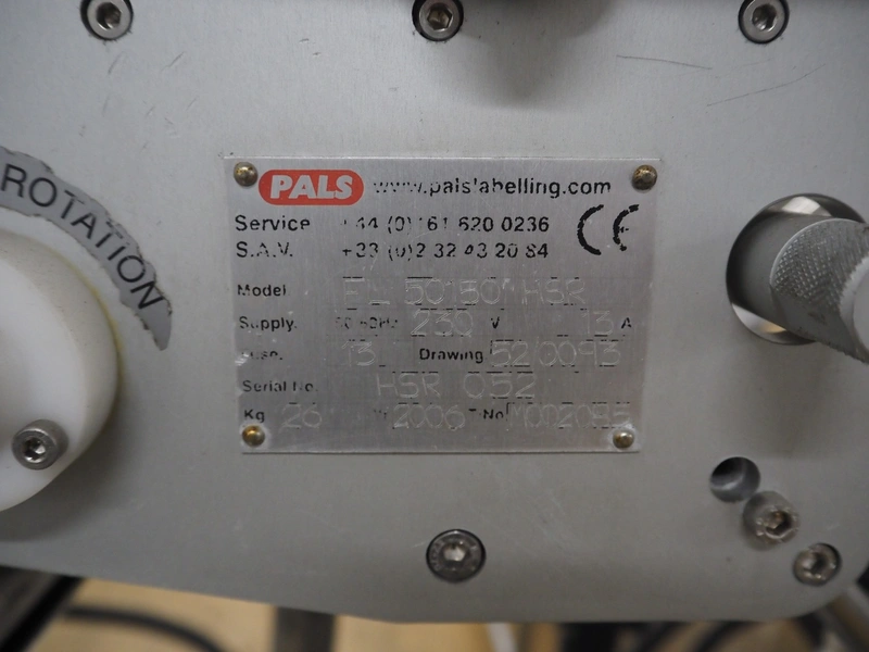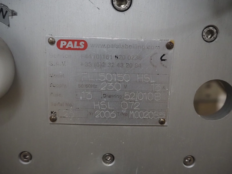 Pals labelling machine, model: FL 50150 HSL, serial number: HSL 072, year of construction: 2006, dimensions: 1500 mm x 800 mm x 1950 mm. Incomplete.