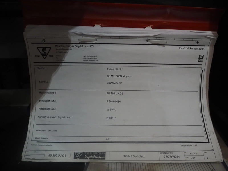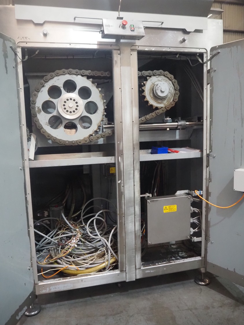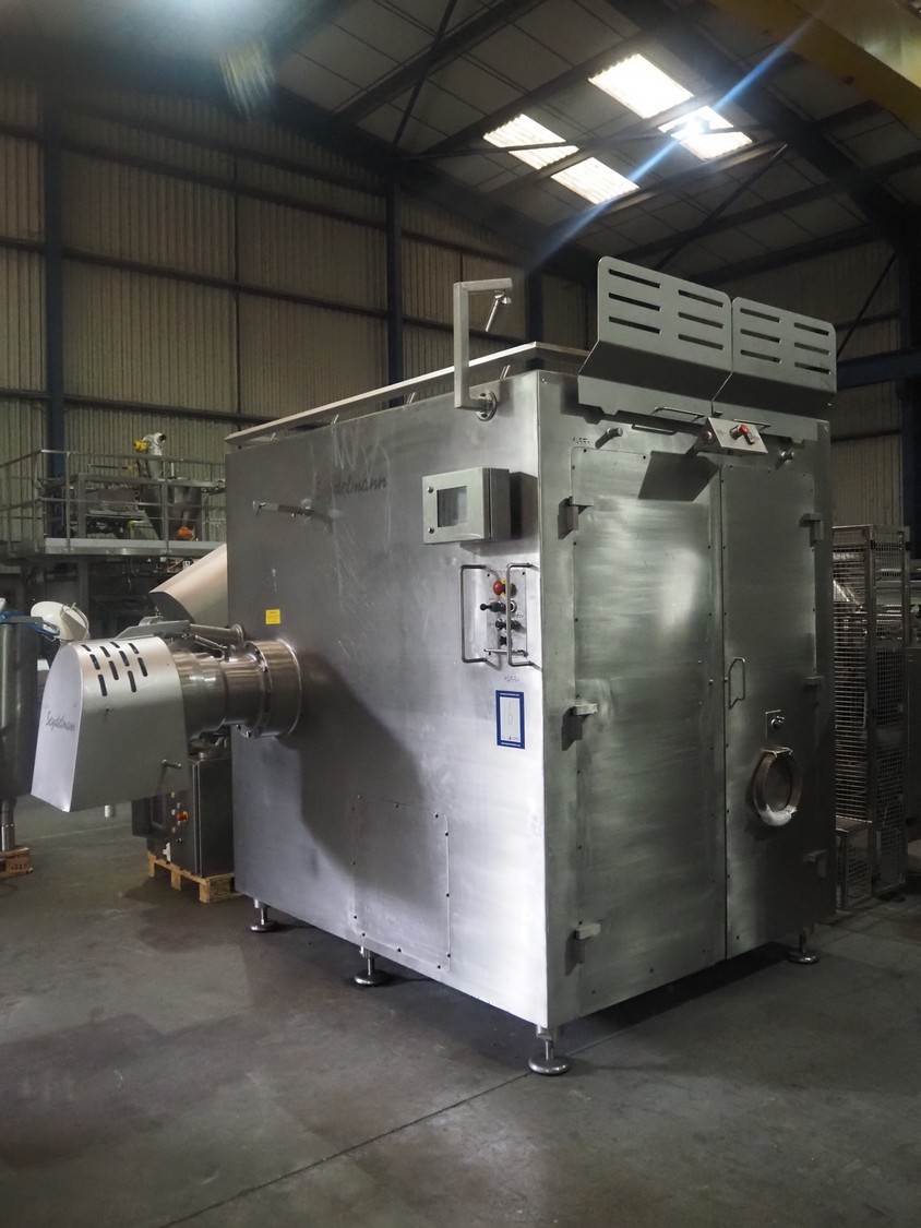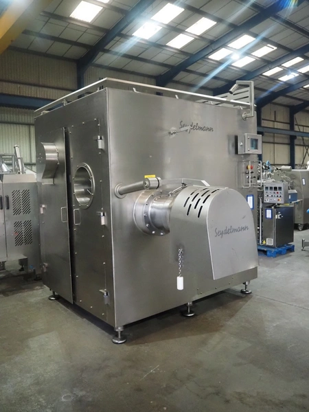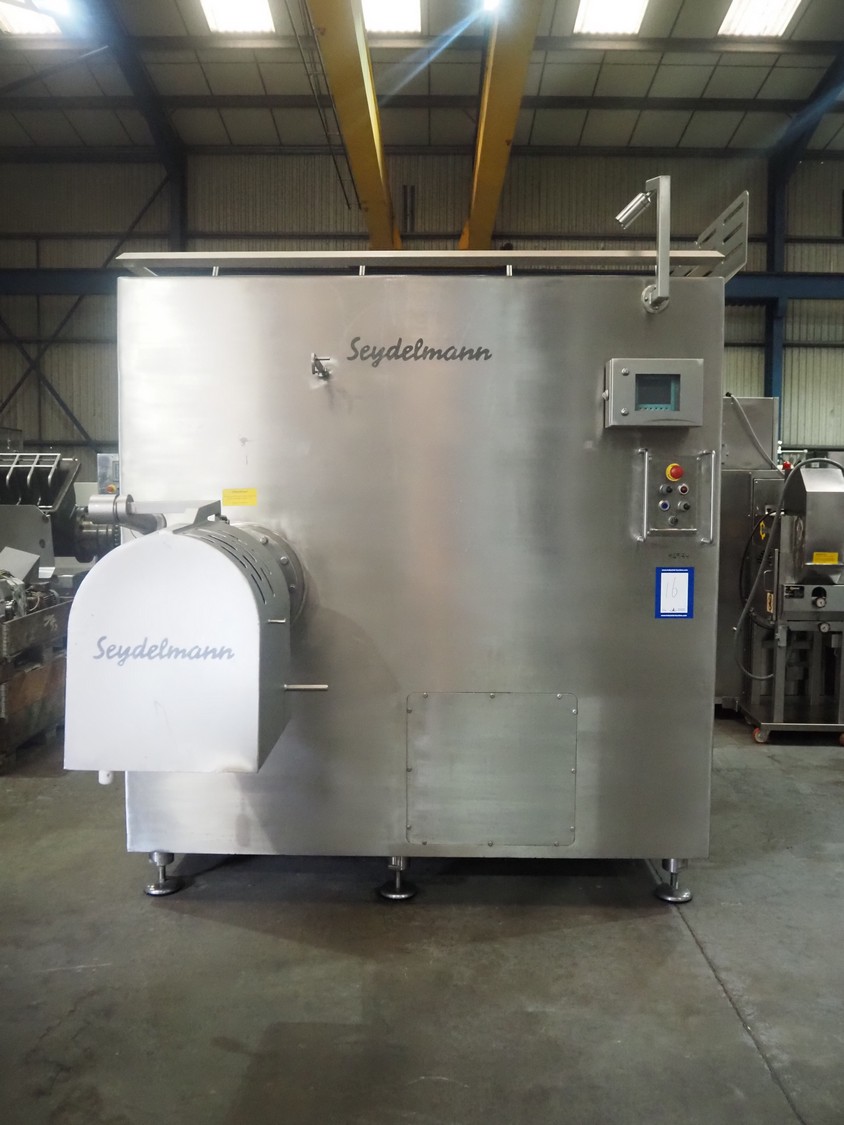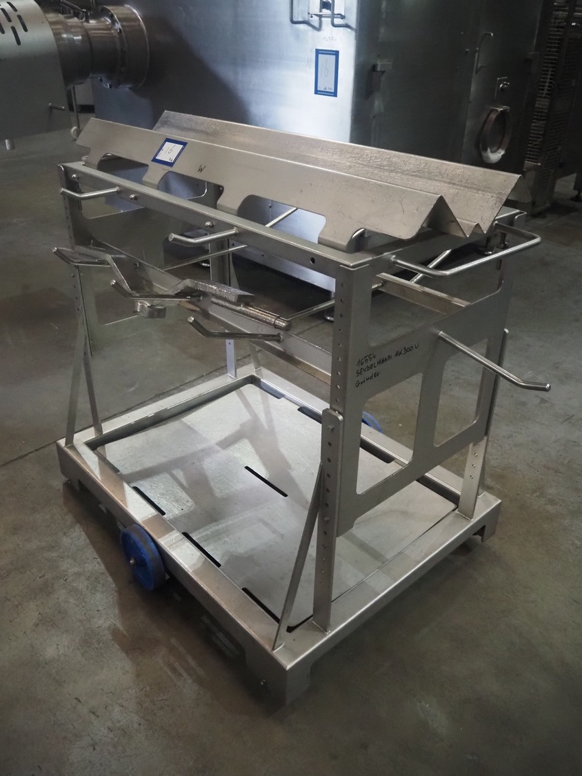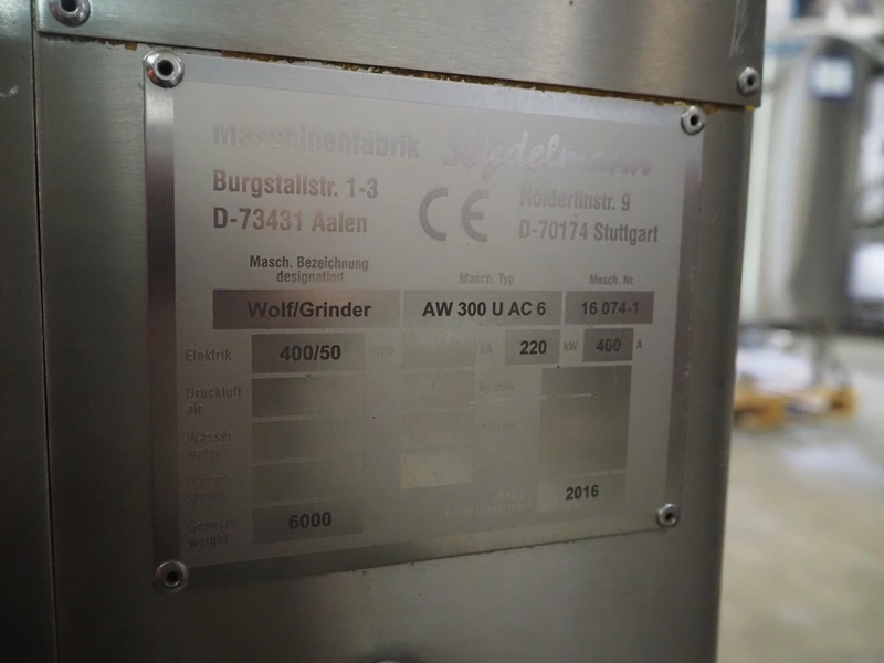Seydelmann grinder, machine type: AW 300 U AC 6, machine number: 16 074-1, year of construction: 2016, 400 V, 50 Hz, 220 kW, 400 A, weight: 6000 kg, plate diameter: 300 mm, total dimensions: 2300 mm x 2900 mm x 2850 mm, including s/s trolley for worm and tools, dimensions: 1800 mm x 900 mm x 1250 mm.