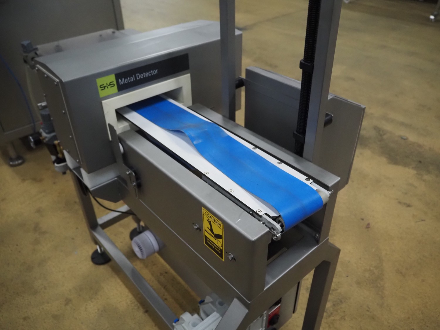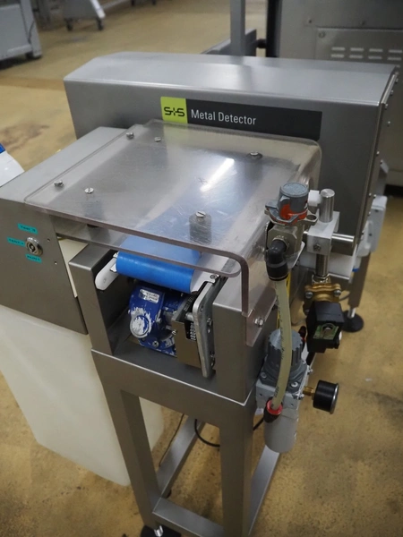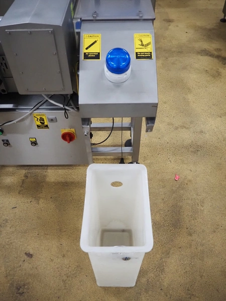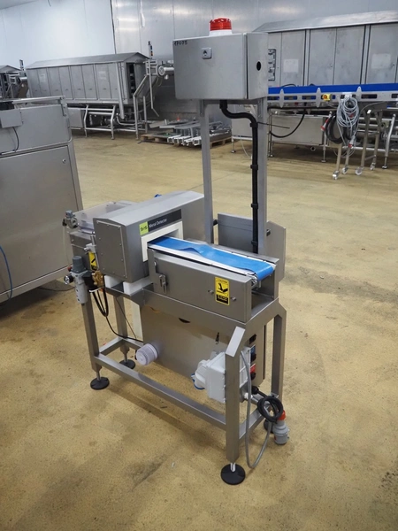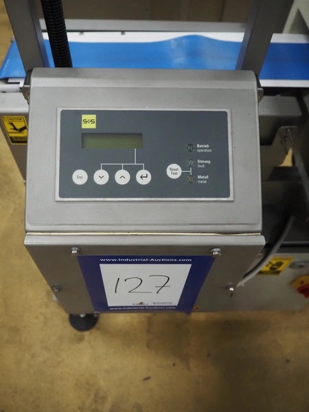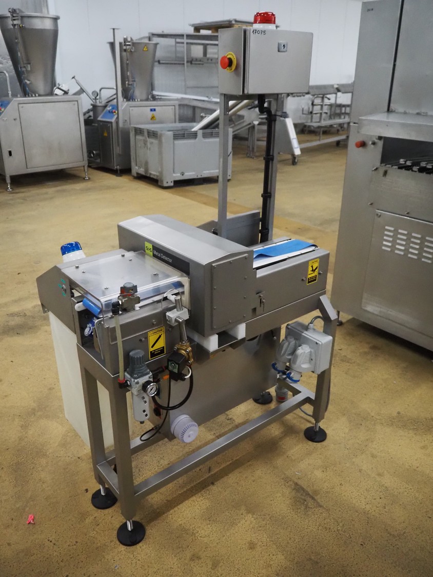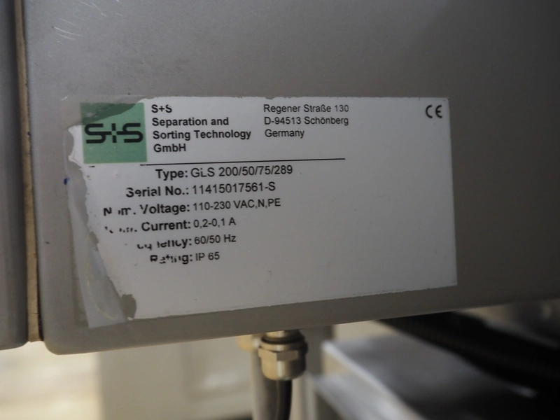 S+S metal detector with rejector, type: GLS 200/50/75/289, serial number: 11415017561-S, 110-230 VAC, 50/60 Hz, 0.2-0.1 A, clearance: 200 mm x 300 mm, plastic belt, belt width: 100 mm, total dimensions: 1050 mm x 700 mm x 1750 mm.