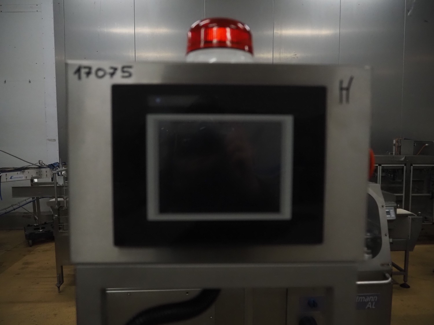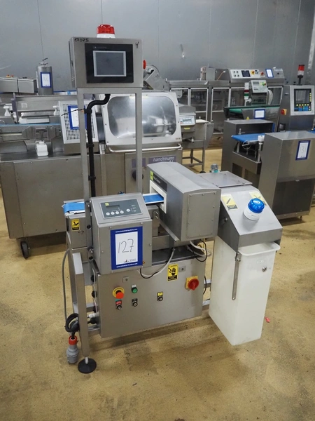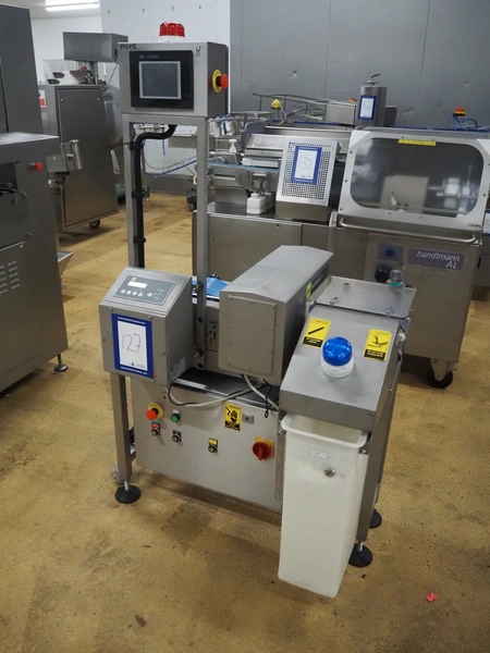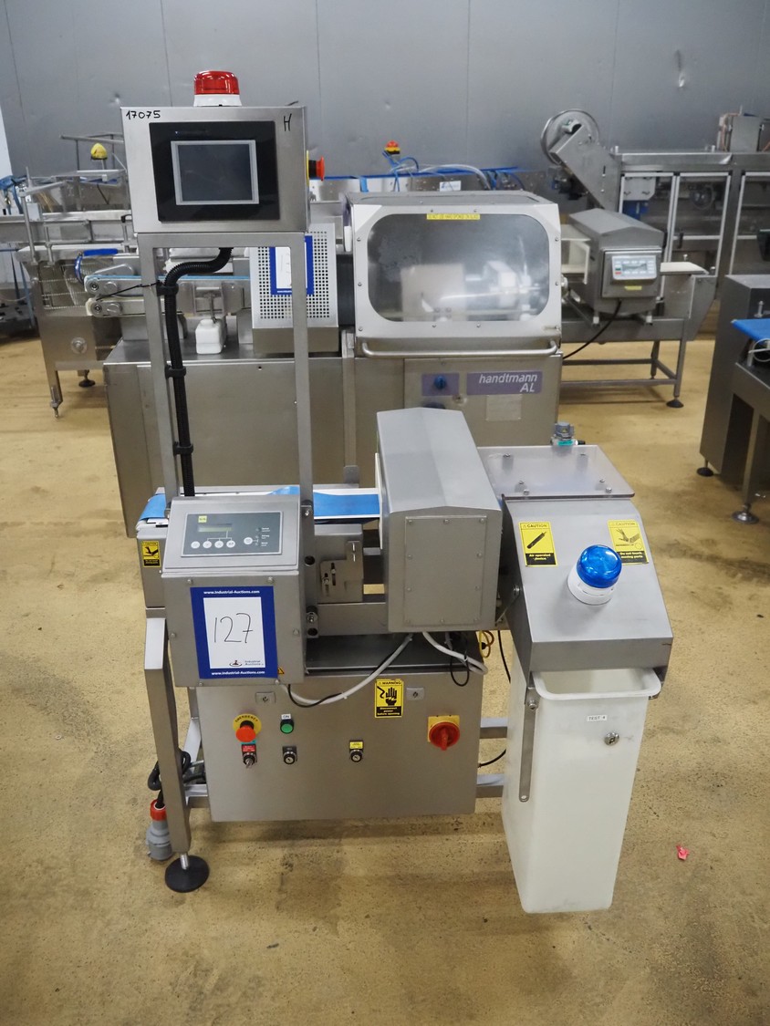 S+S metal detector with rejector, type: GLS 200/50/75/289, serial number: 11415017561-S, 110-230 VAC, 50/60 Hz, 0.2-0.1 A, clearance: 200 mm x 300 mm, plastic belt, belt width: 100 mm, total dimensions: 1050 mm x 700 mm x 1750 mm.