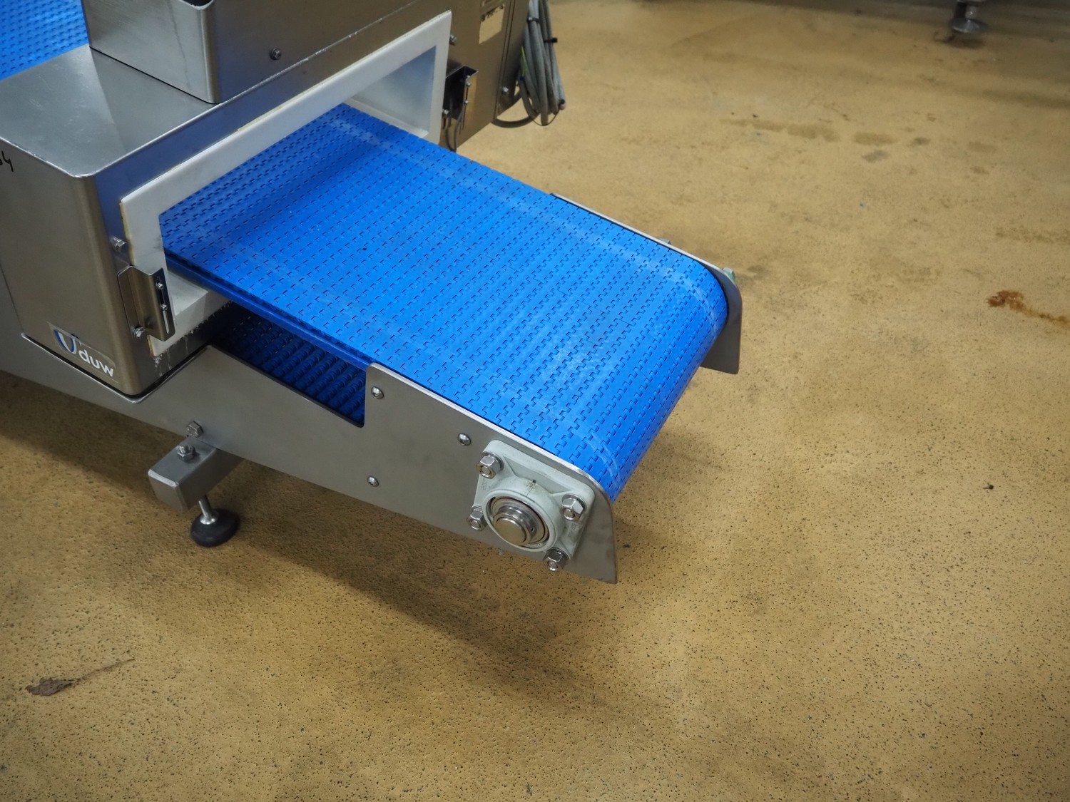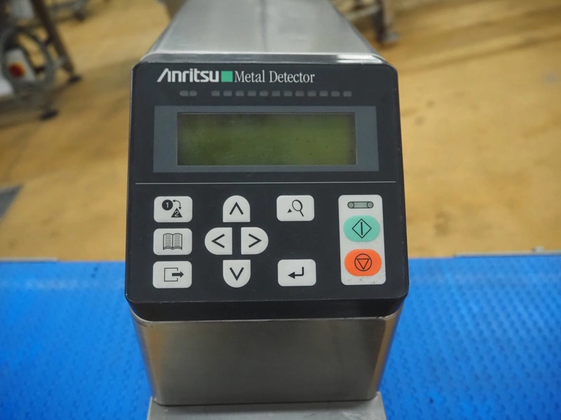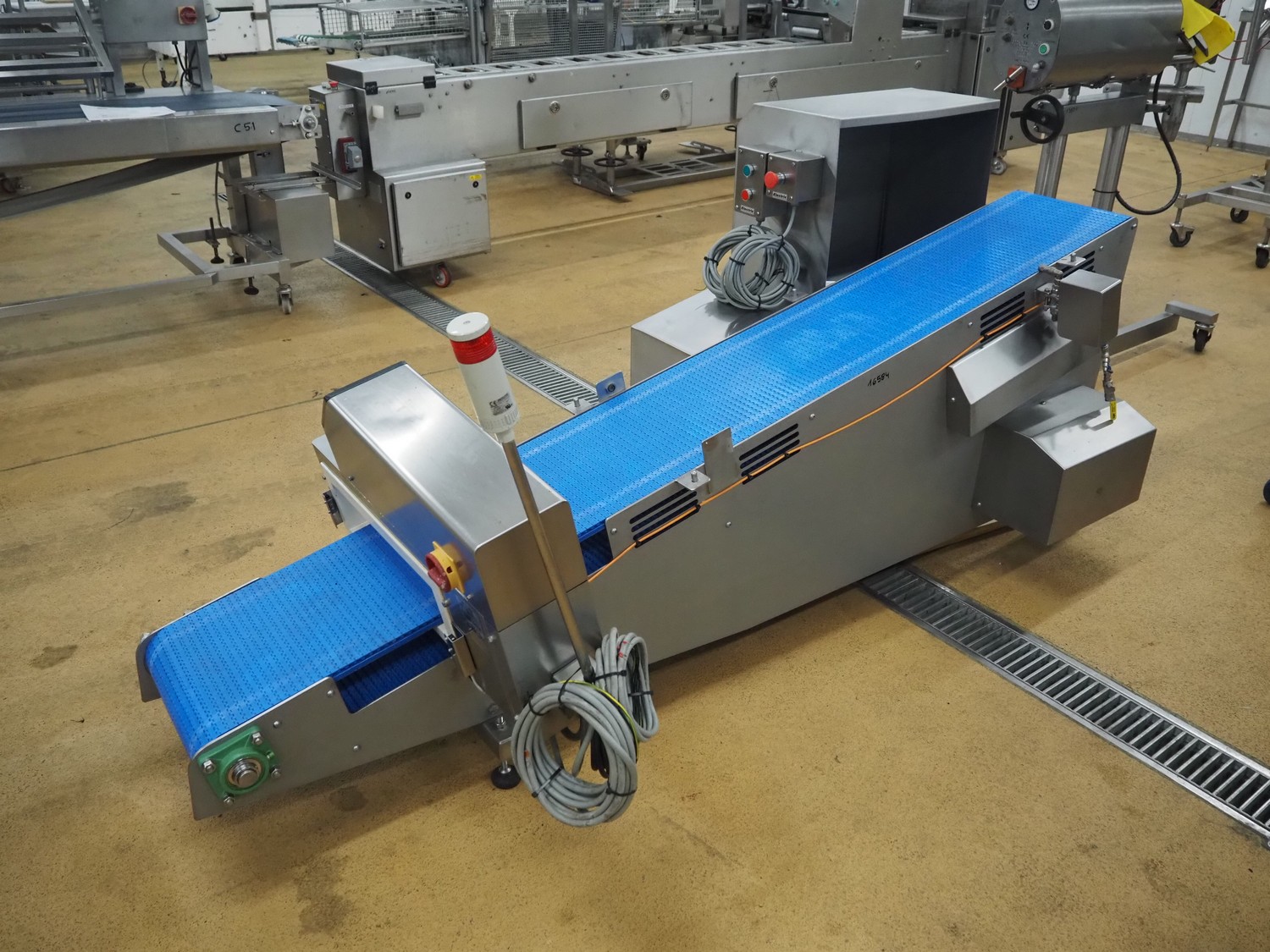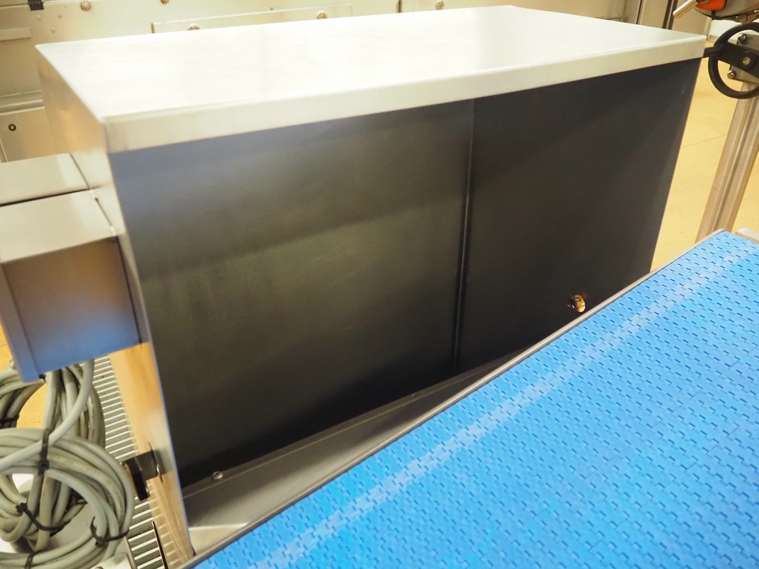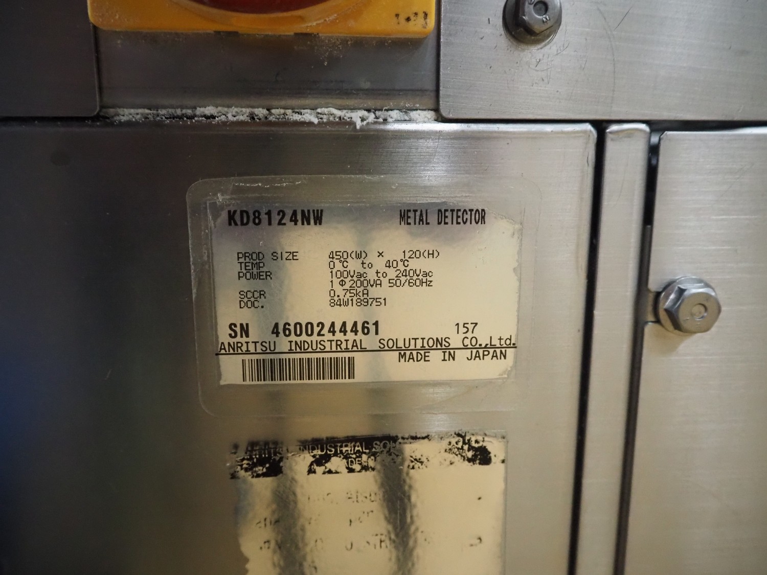 Anritsu elevating metal detector with rejector, type: KD8124NW, serial number: 4600244461, 100-240 Vac, 1 Ph, 50/60 Hz, clearance: 450 mm x 100 mm, plastic belt, belt width: 350 mm, elevating height: 880 mm, total dimensions: 2500 mm x 1100 mm x 1120 mm.