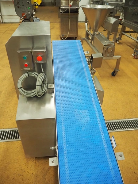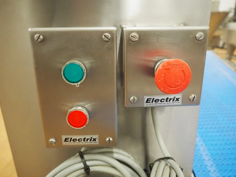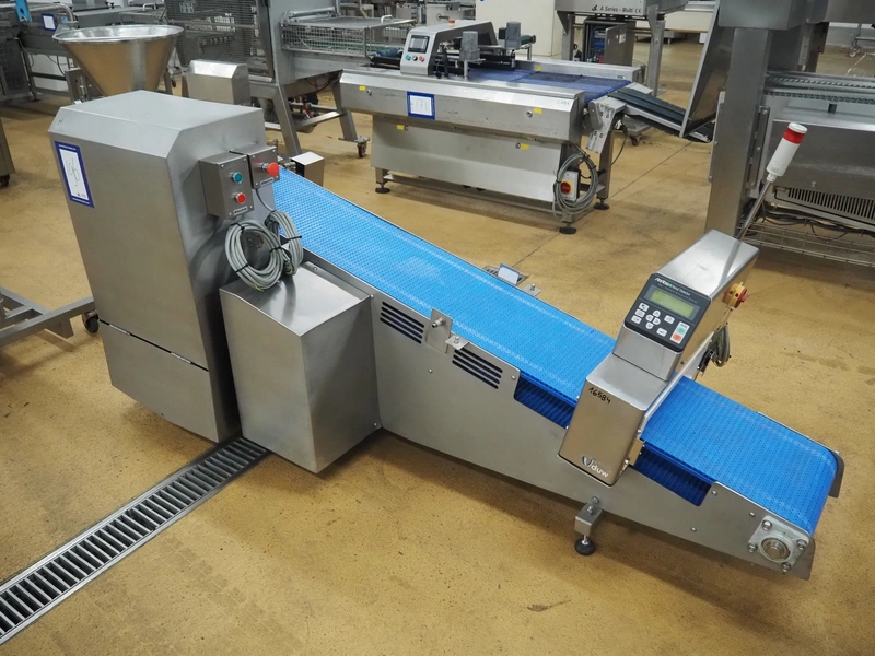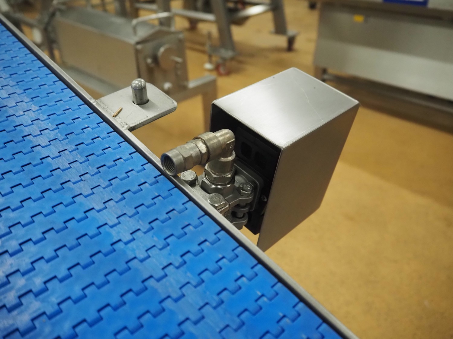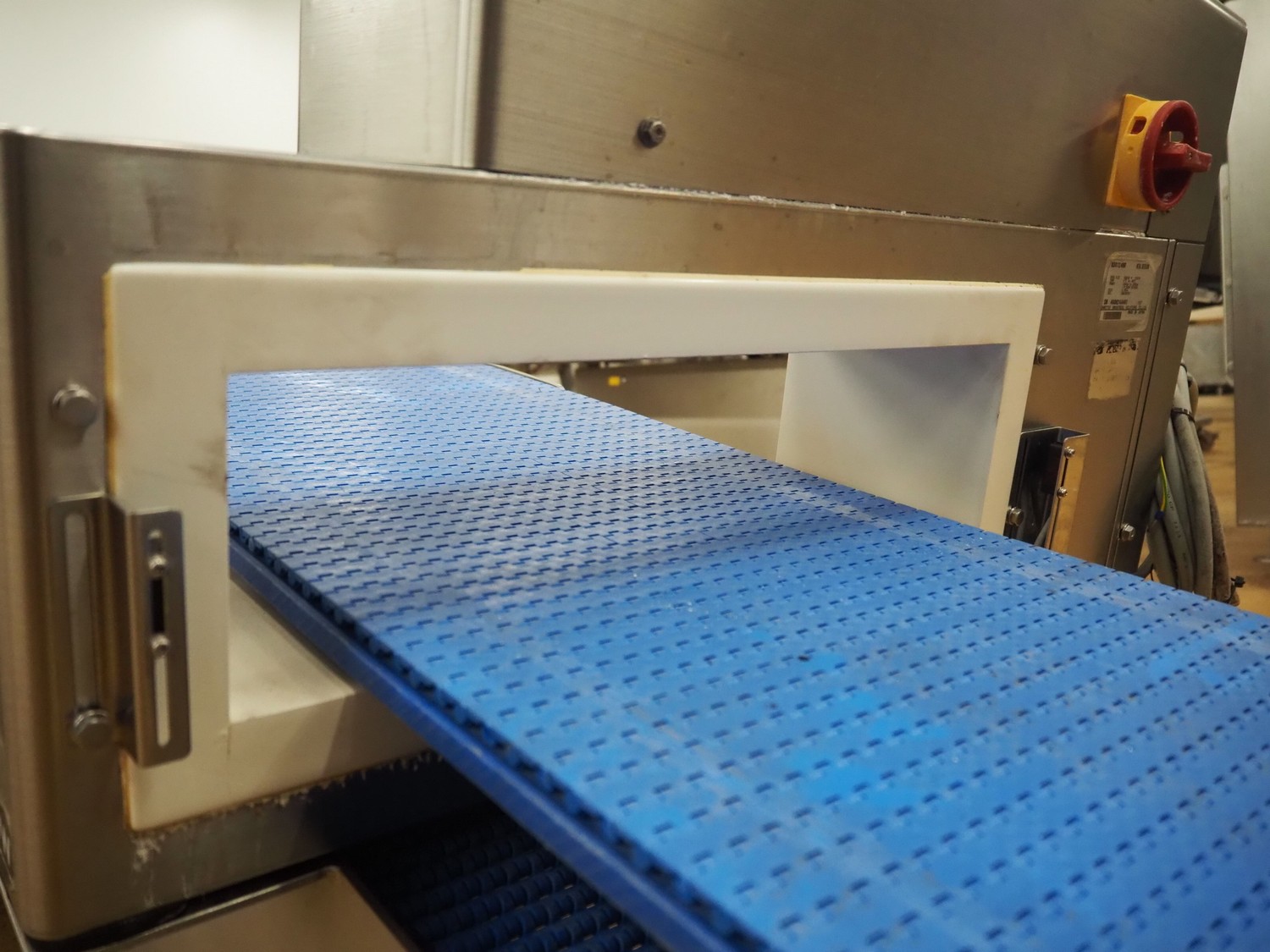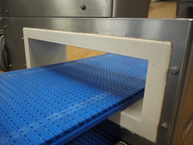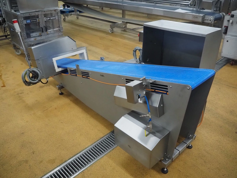 Anritsu elevating metal detector with rejector, type: KD8124NW, serial number: 4600244461, 100-240 Vac, 1 Ph, 50/60 Hz, clearance: 450 mm x 100 mm, plastic belt, belt width: 350 mm, elevating height: 880 mm, total dimensions: 2500 mm x 1100 mm x 1120 mm.