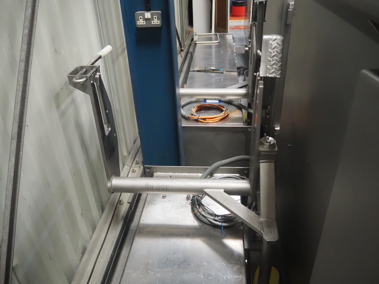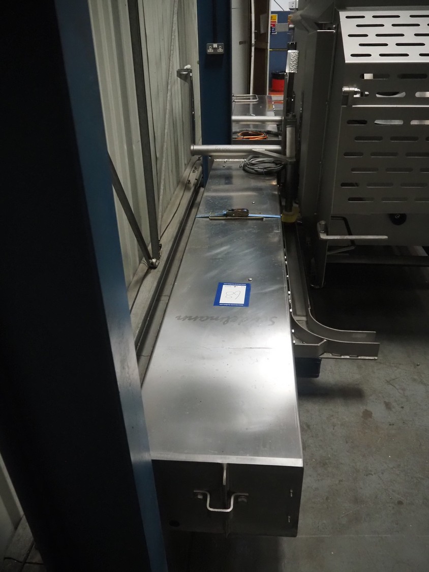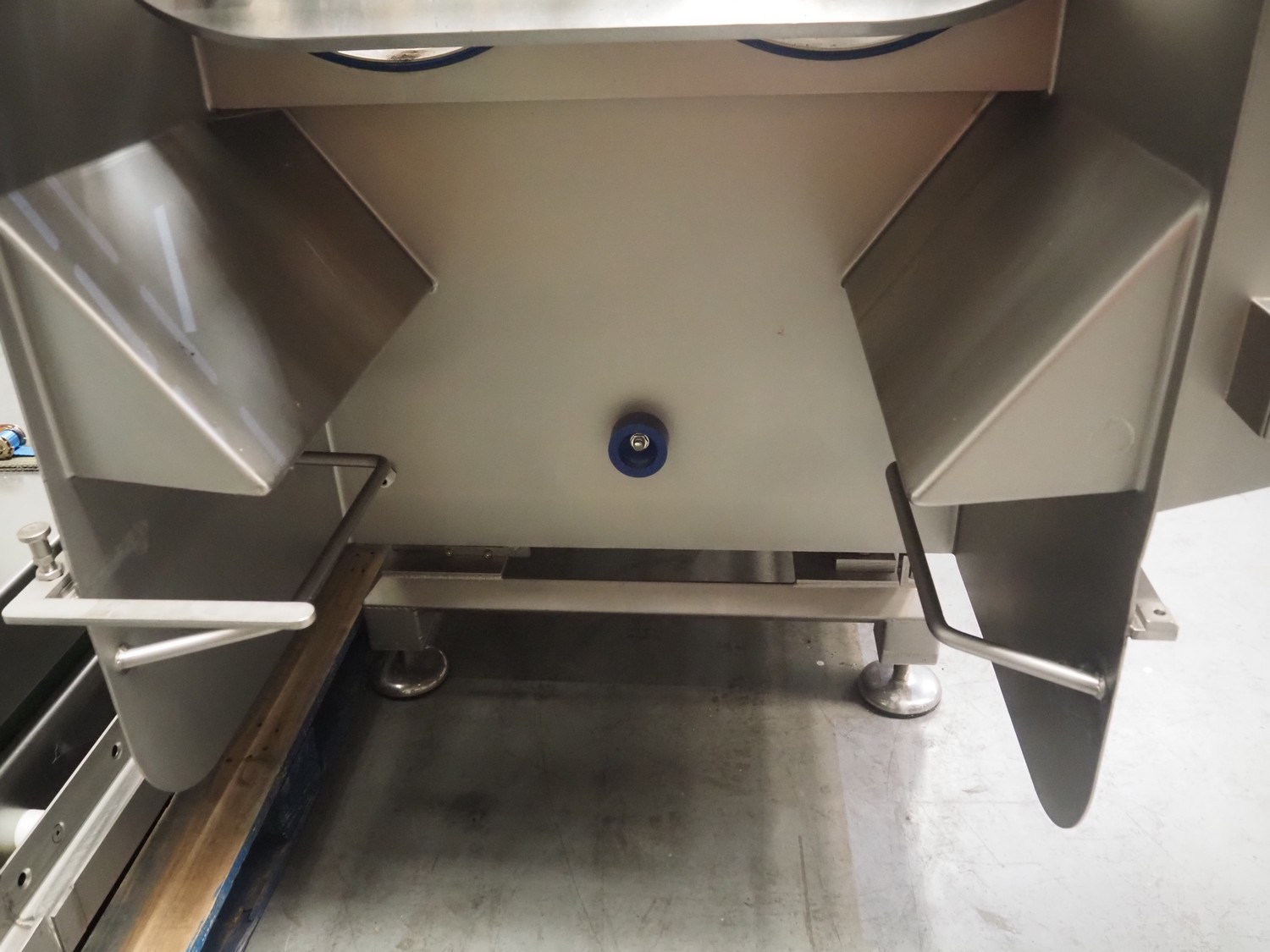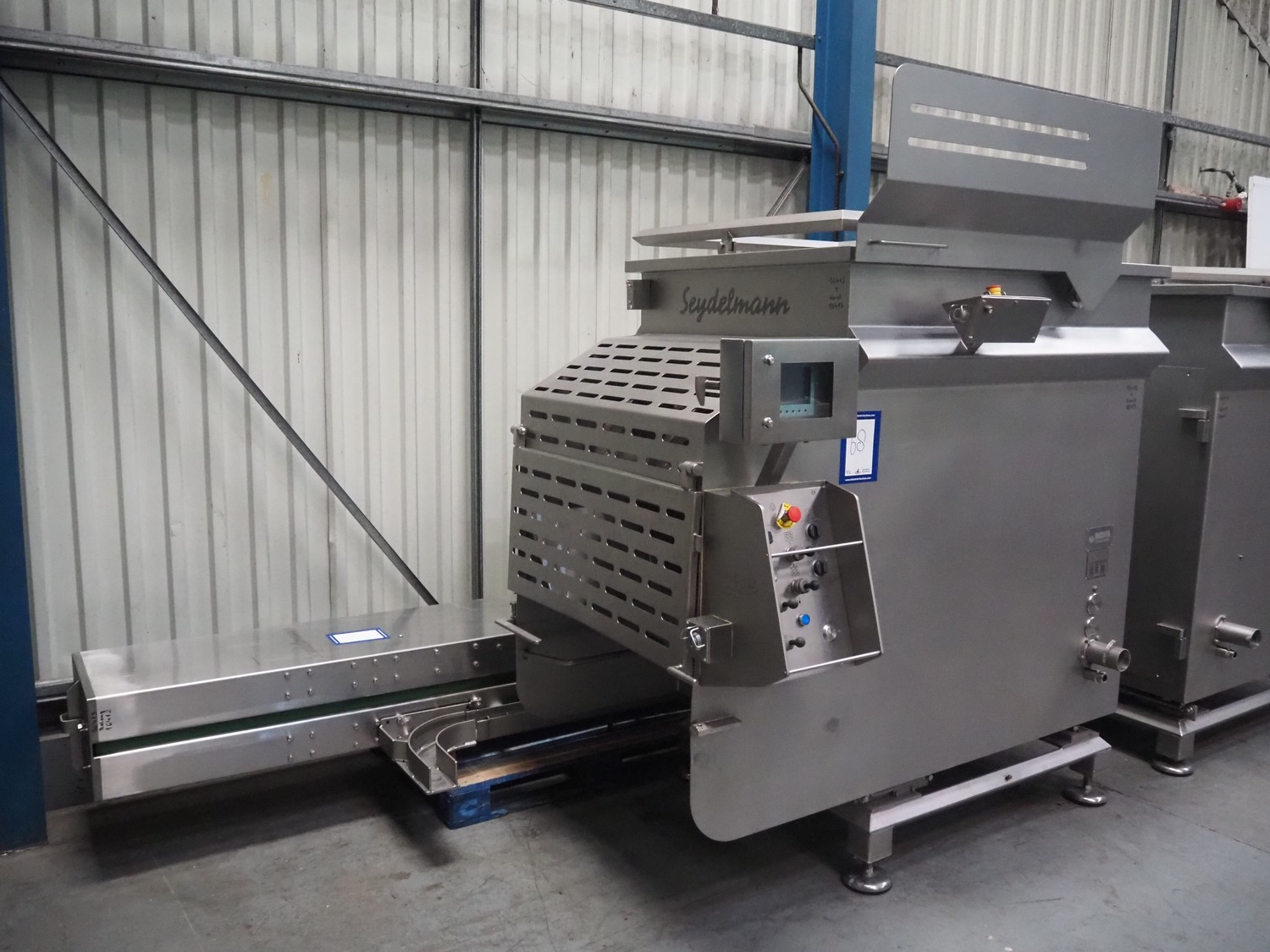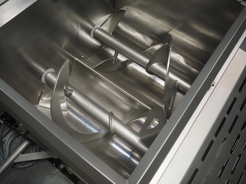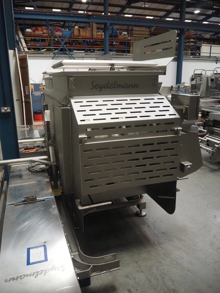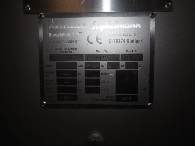 Seydelmann double shaft ribbon mixer on weighing cells, type: MR 600, machine number: 16 633-1, year of construction: 2016, 400 V, 50 Hz, 21 A, 11 kW, weight: 1500 kg, dimensions: 2000 mm x 1400 mm x 2290 mm. With lifter for 200 litres meat bins, dimensions lifter: 3100 mm x 800 mm x 1500 mm.