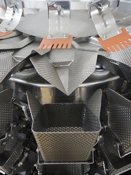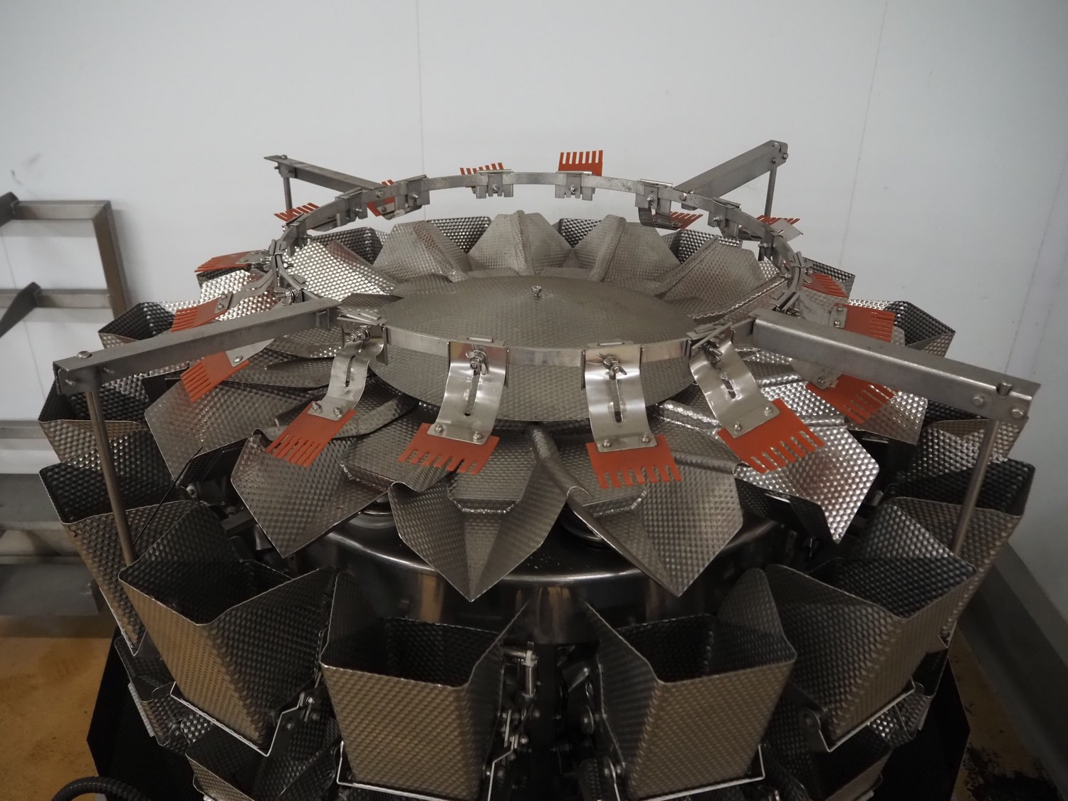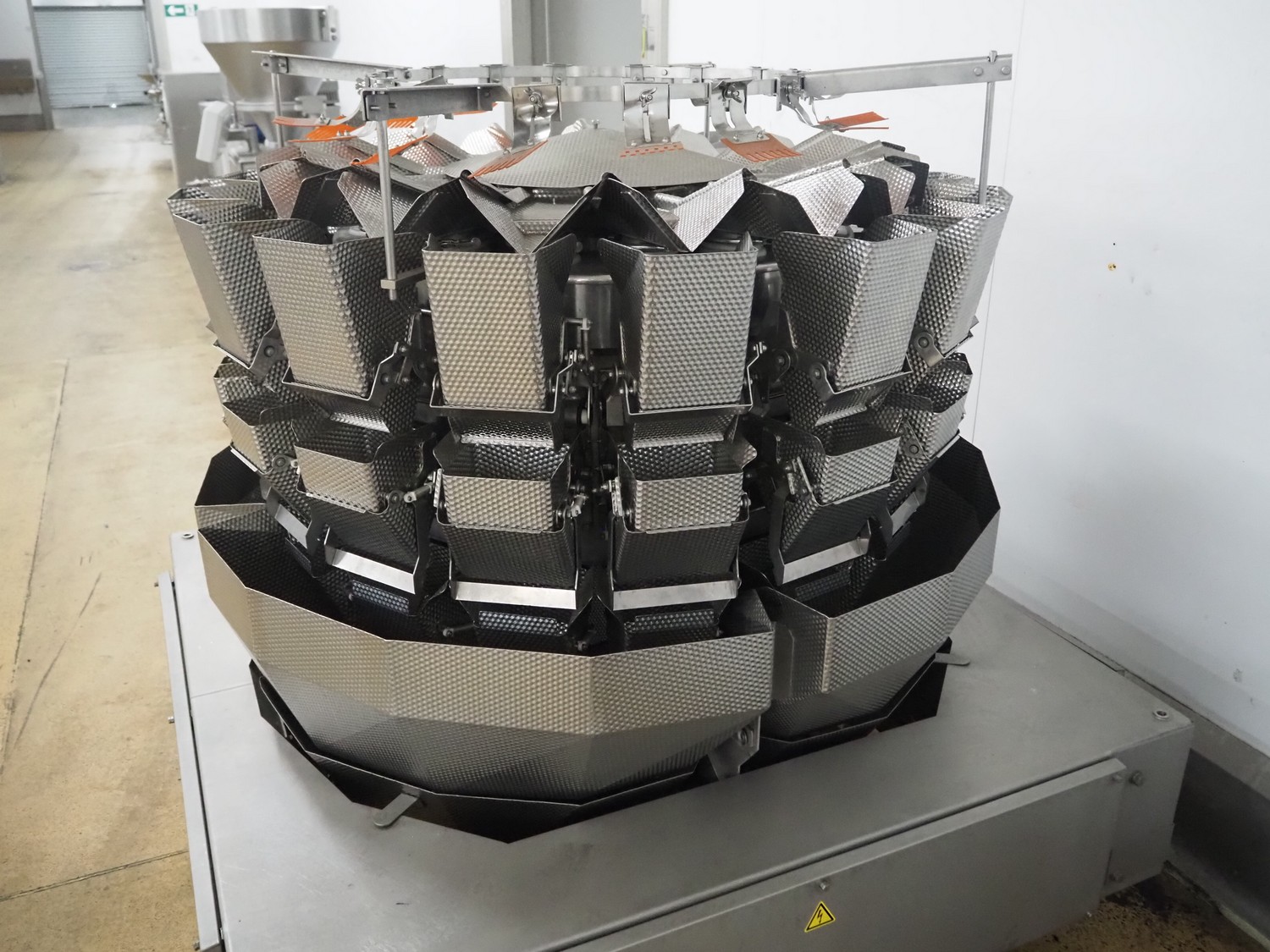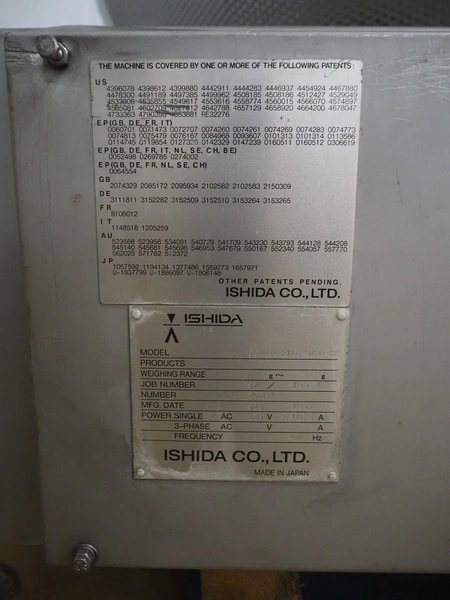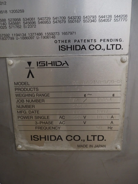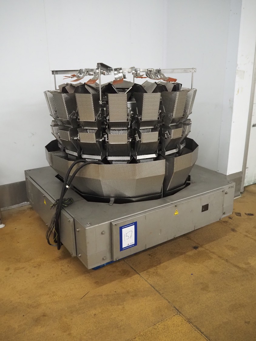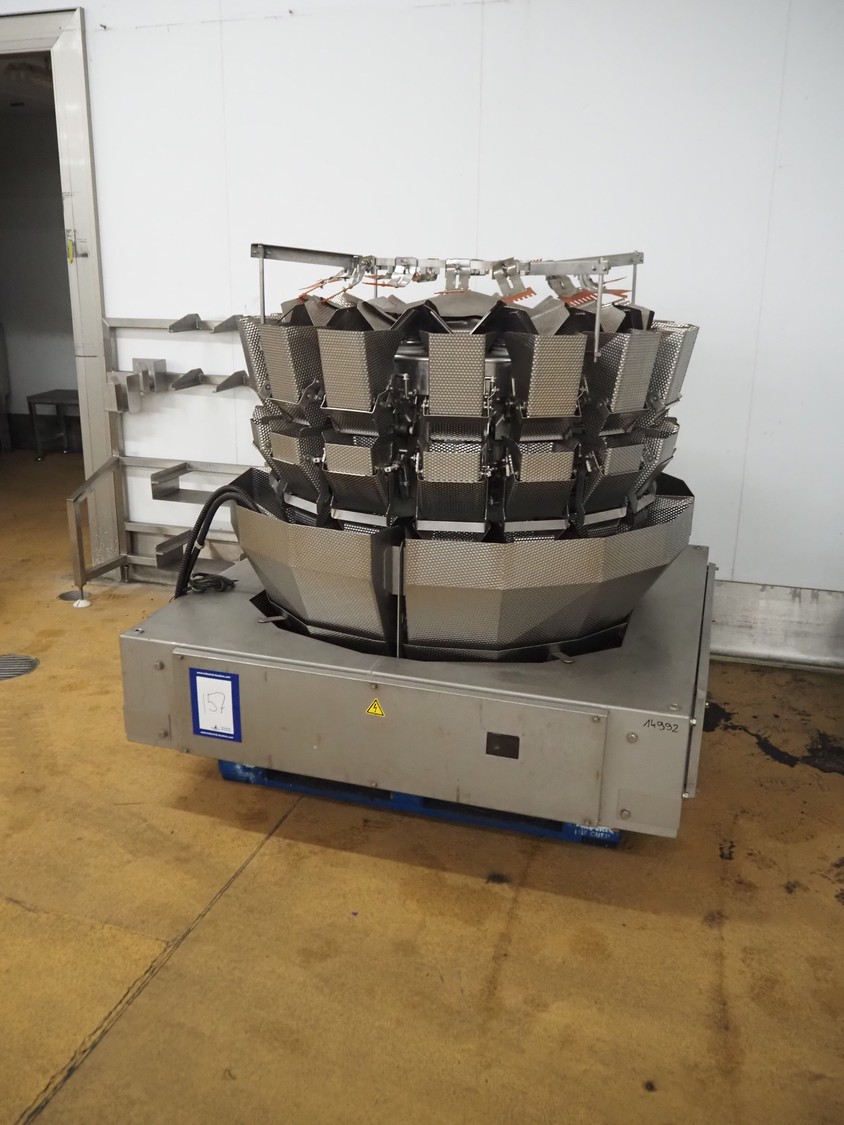 Ishida Co., Ltd multihead weigher, 16-heads, model: CCW-RZ-216B-D/20-CR, number: 26281, year of construction: 1997, 220 V, 3 Ph, 50 Hz, 10.3 A, dimensions: 1550 mm x 1550 mm x 1650 mm.