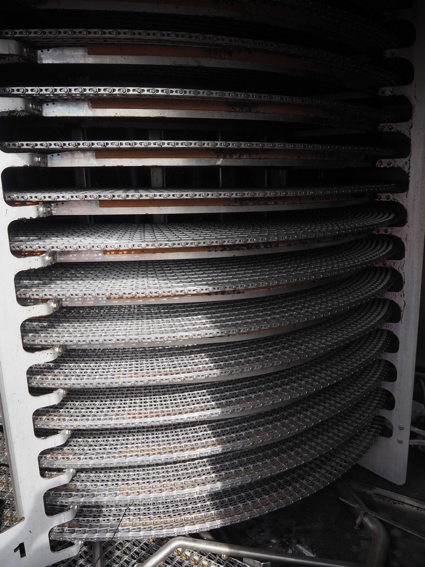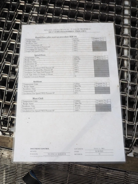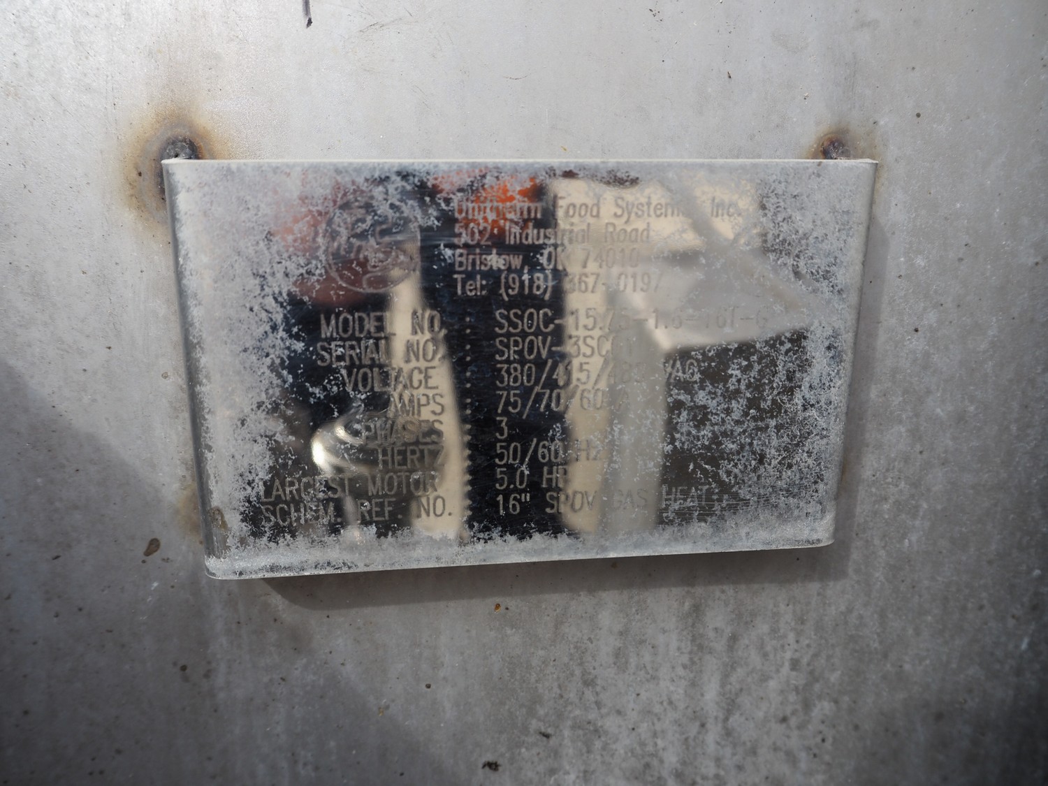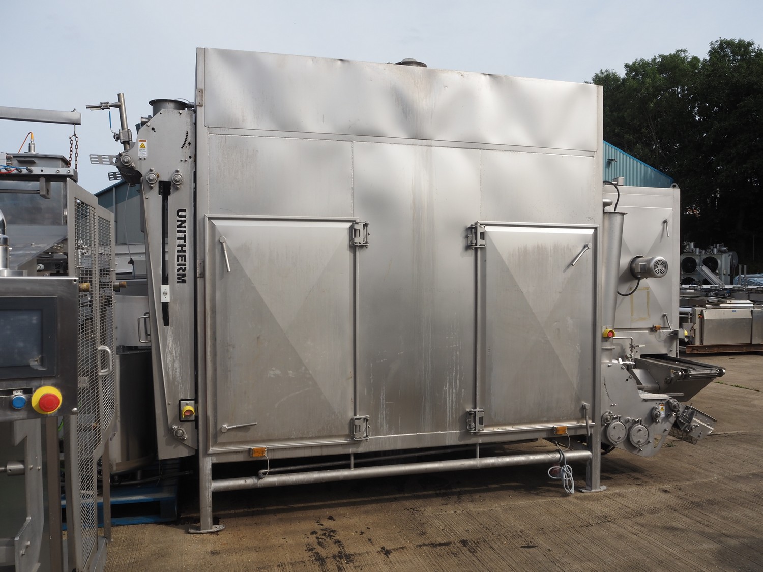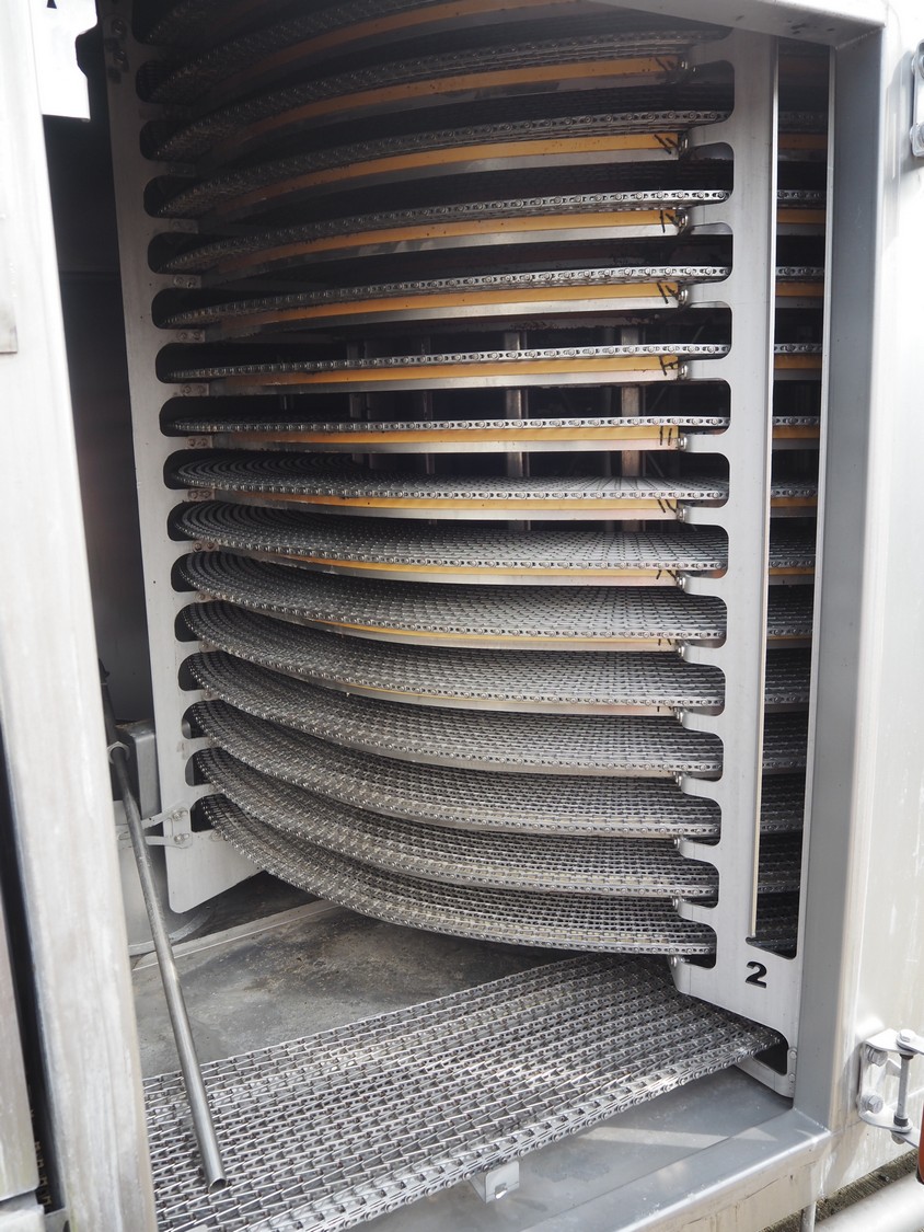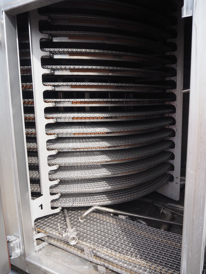 Unitherm Food Systems, Inc gas heated spiral oven, model number: SSOC-15.75-1.6-16/-G, serial number: SPOV-3SC01, 380/415/480 VAC, 3 Ph, 50/60 Hz, 75/70/60 A, 16 floors, s/s belt width: 400 mm, tier: 80 mm, infeed height: 700 mm, outfeed height: 2500 mm, Z-N clockwise rotation, total dimensions: 4500 mm x 2500 mm x 3150 mm.