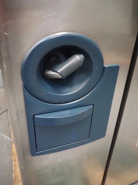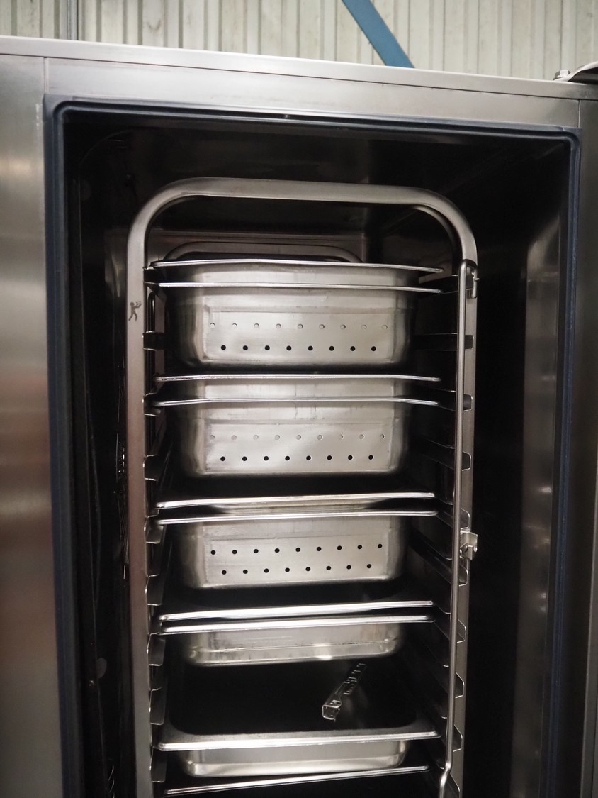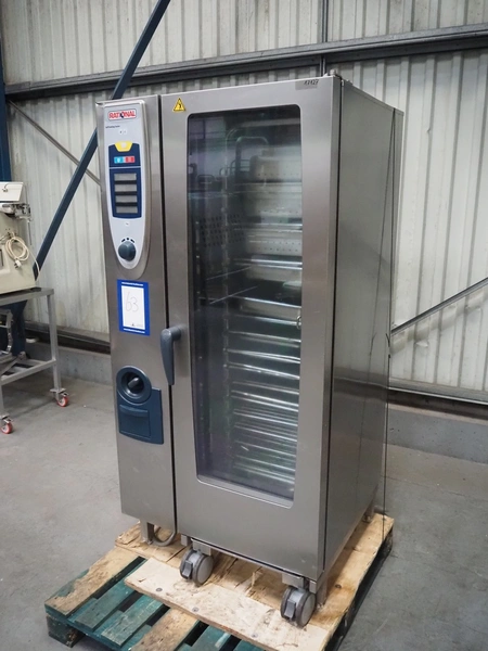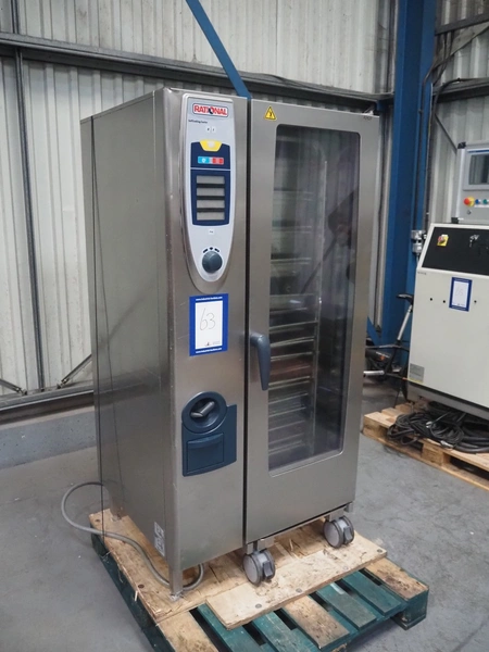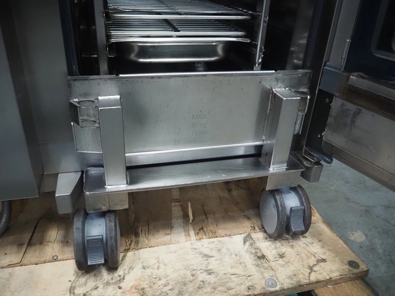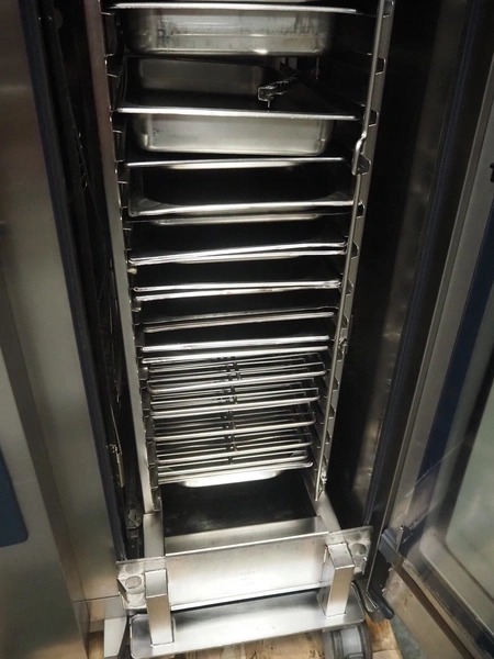 Rational combi steamer, dimensions: 900 mm x 860 mm x 1800 mm. Including s/s trolley, 20 floors, dimensions floors: 530 mm x 330 mm.