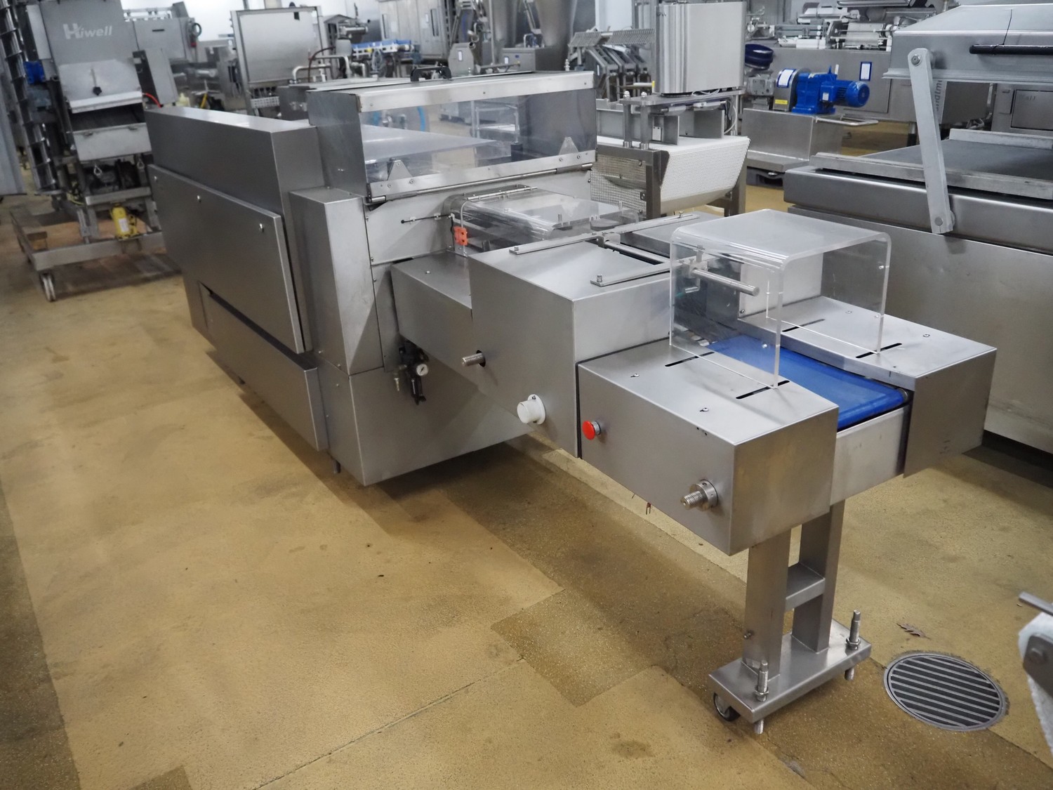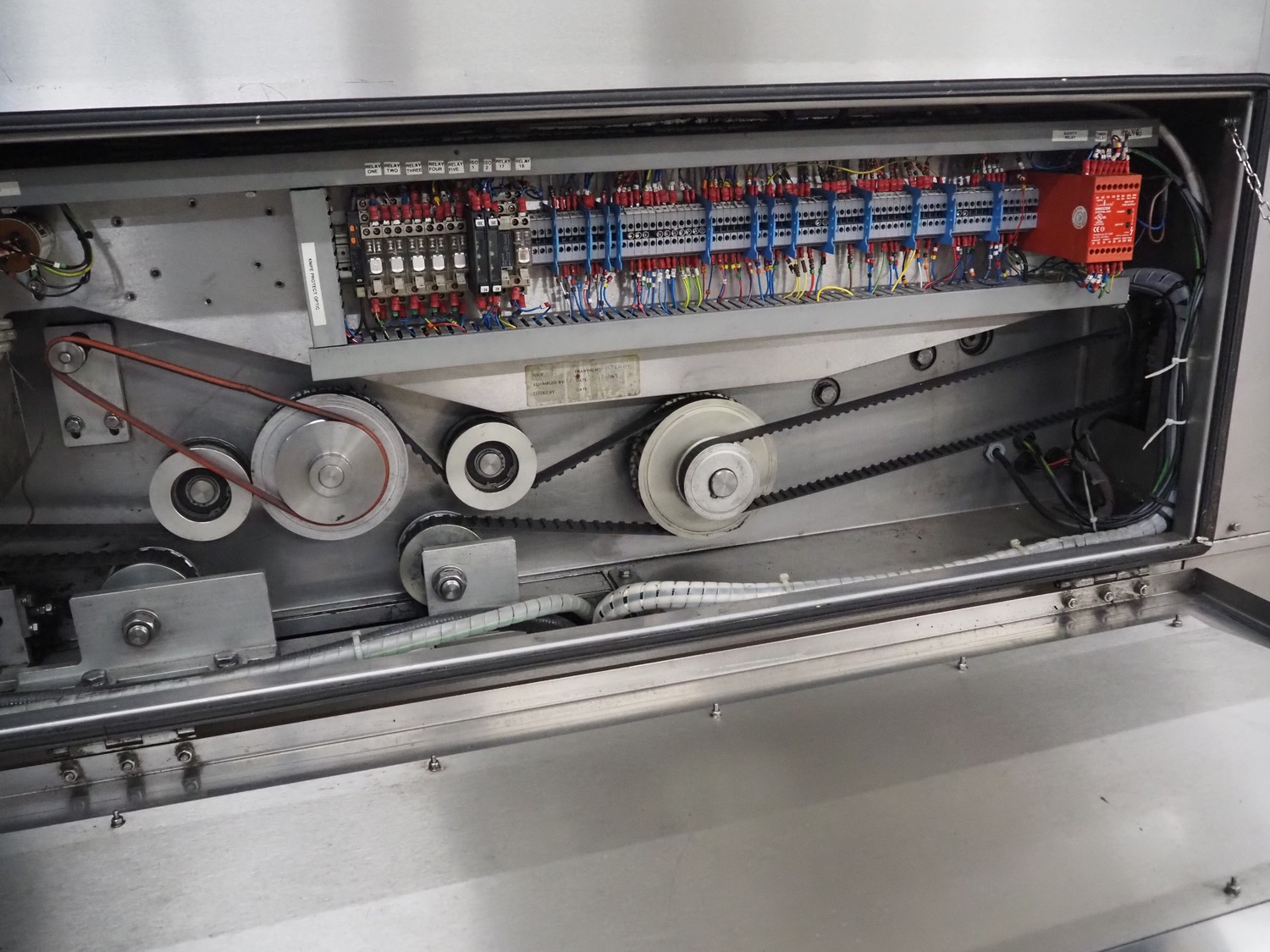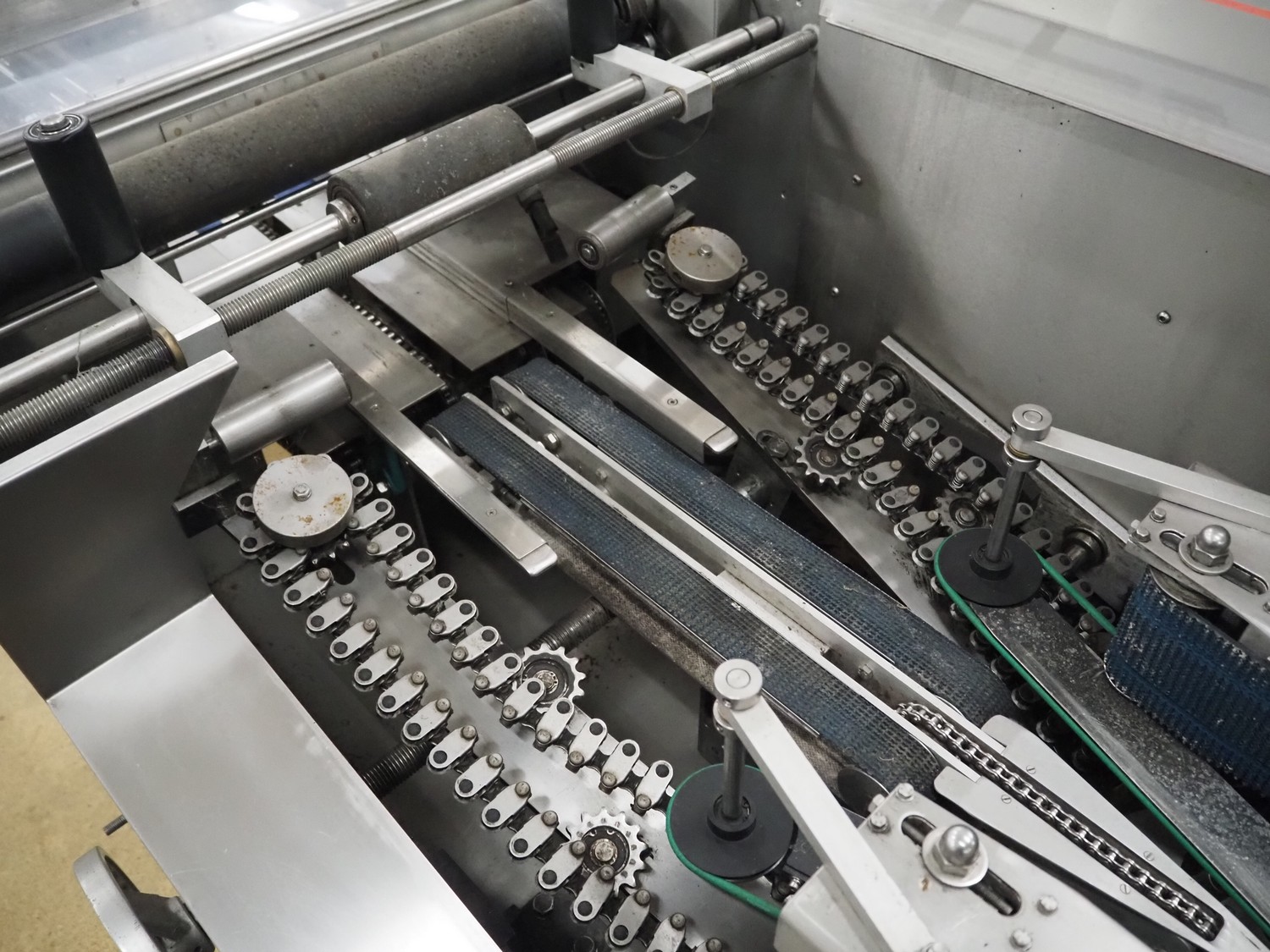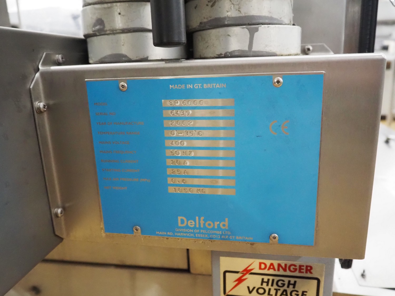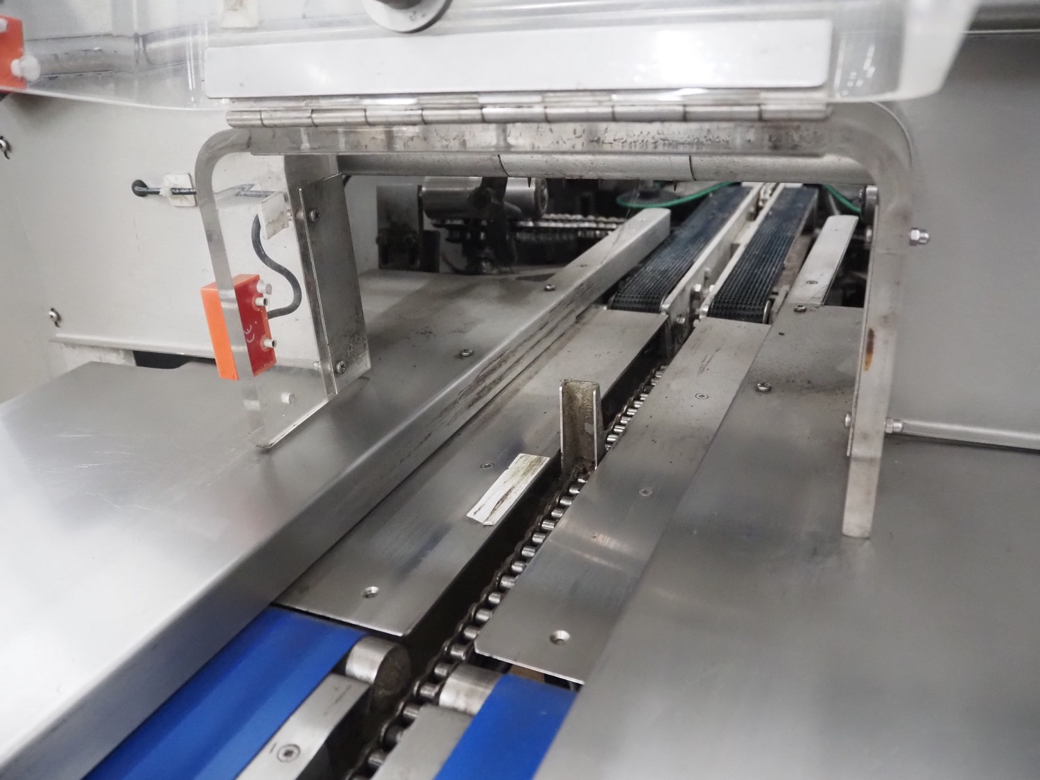 Delford flowpacker, model: SP 6000, serial number: 6439, year of construction: 2002, 400 V, 50 Hz, 20 A, temperature range: 0°C-35°C, weight: 1050 kg, plastic infeed belts, belt width: (2x) 60 mm, 200 mm, plastic outfeed belt, belt width: 240 mm, total dimensions: 4450 mm x 1050 mm x 1370 mm.