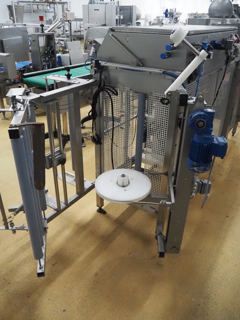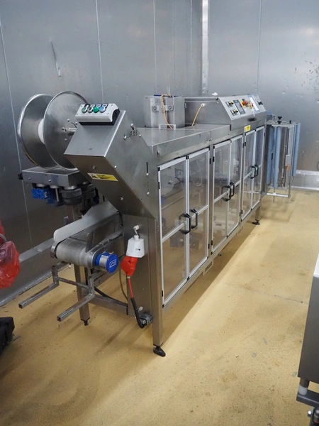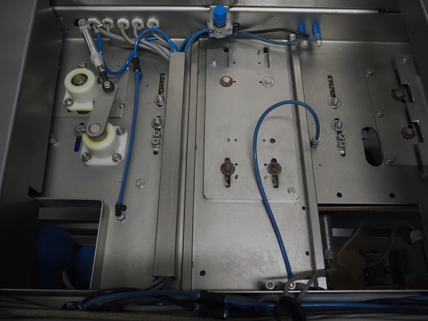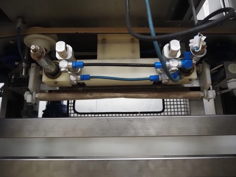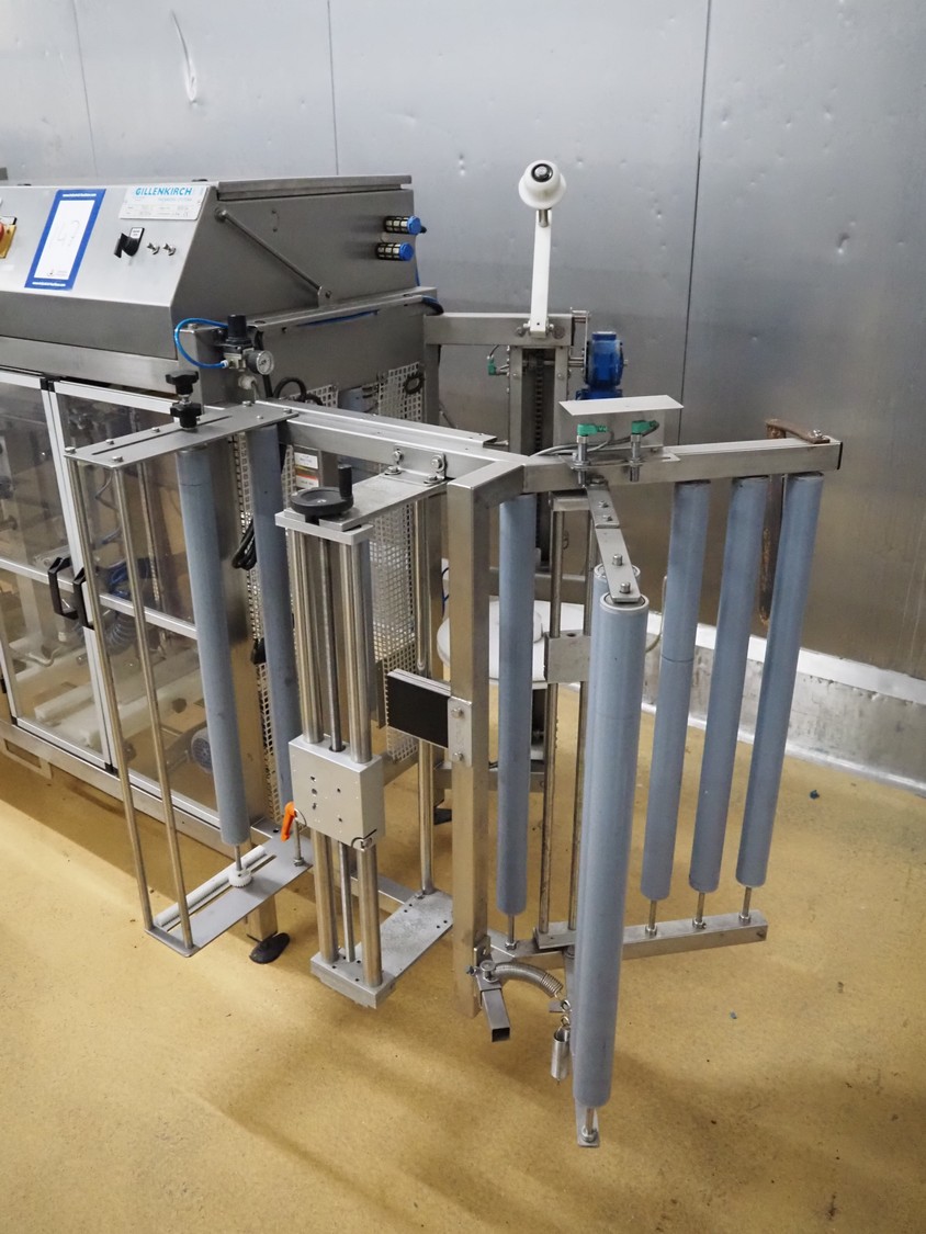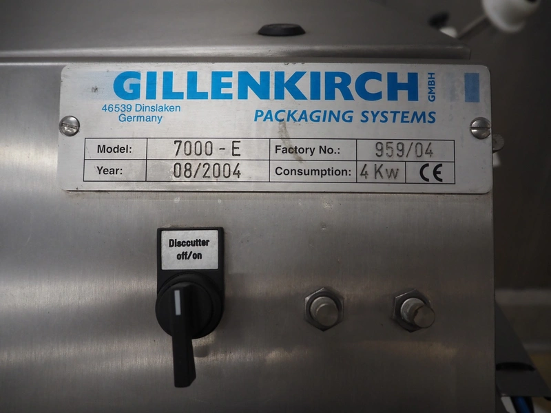 Gillenkirch Packaging Systems GmbH vertical and horizontal sealing machine for vegetables, model: 7000-E, factory number: 959/04, year of construction: 08/2004, 4 kW, seal length: 600 mm, plastic outfeed belt, belt width: 250 mm, total dimensions: 3750 mm x 1700 mm x 1630 mm.