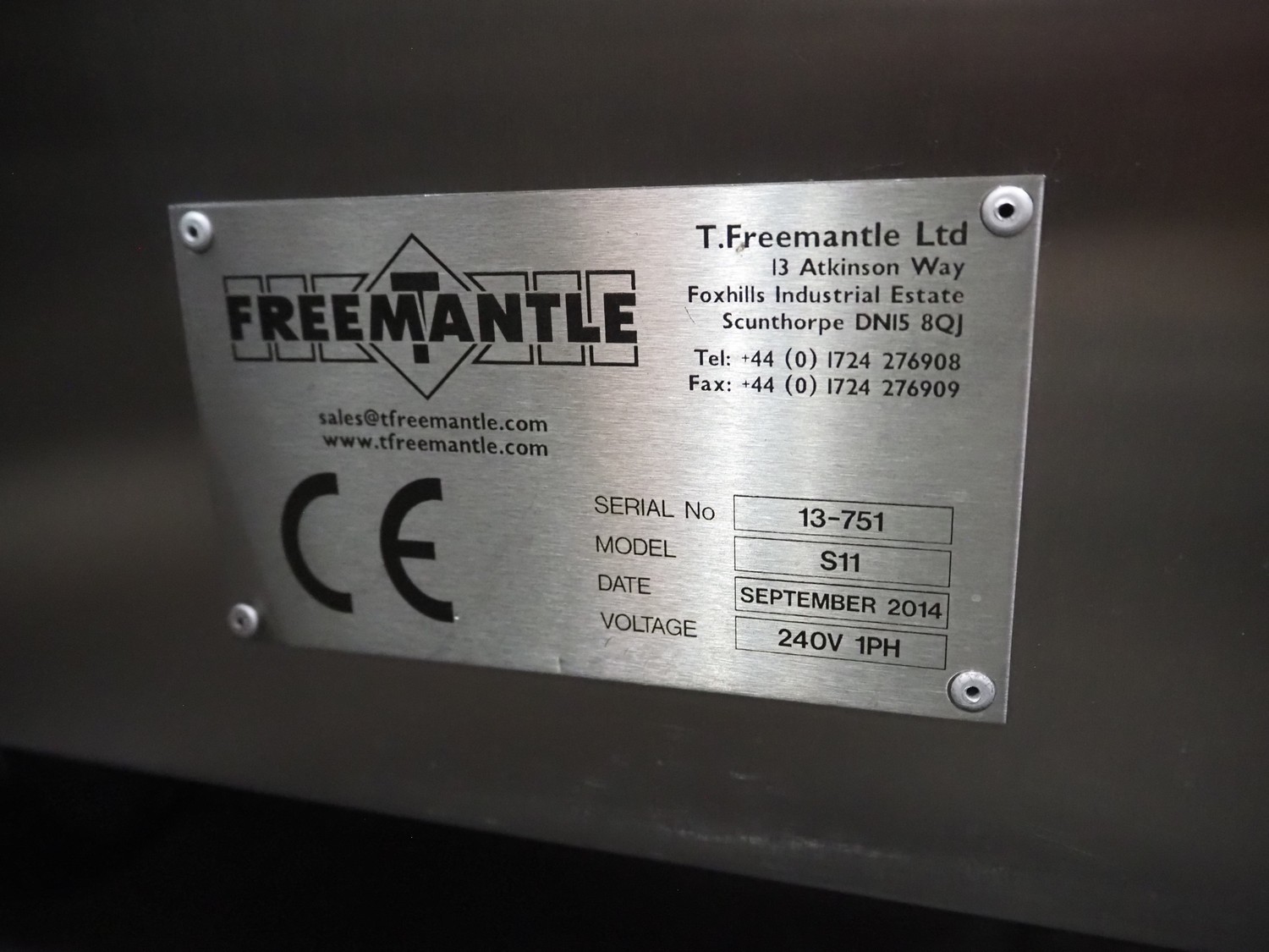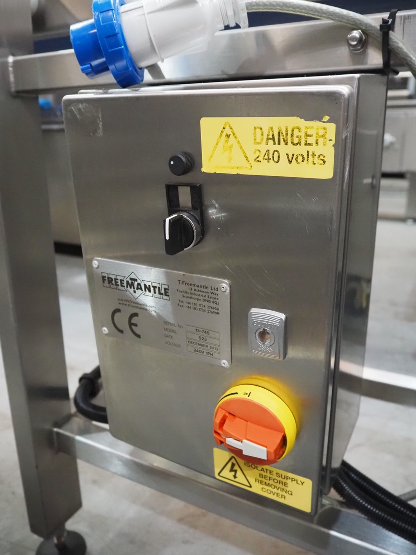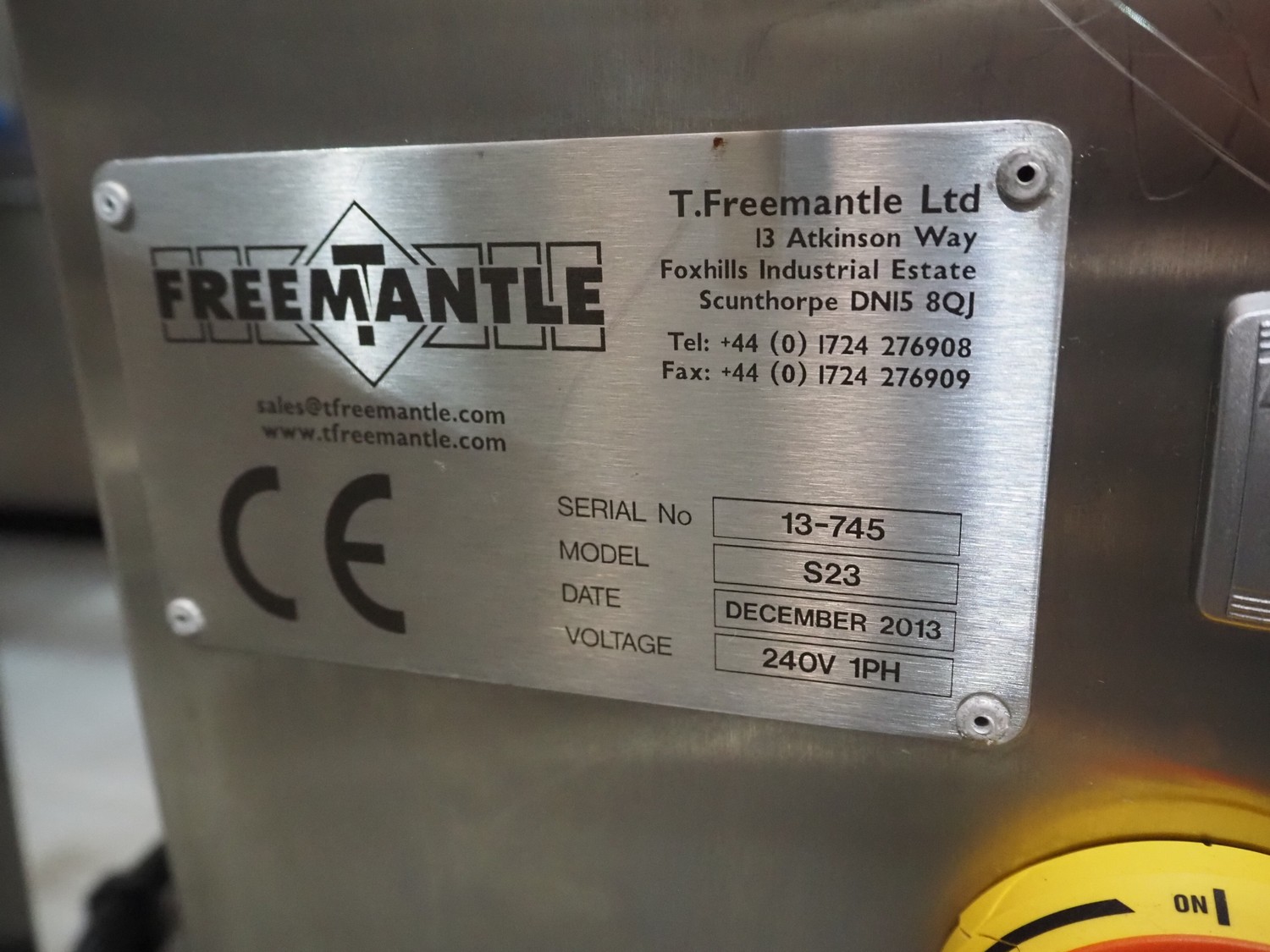 Freemantle sleever, model: S23, serial number: 13-745, year of construction: 2013, 240 V, 1 Ph, maximum box dimensions: 150 mm x 130 mm x 80 mm, plastic belt, belt width: 300 mm, total dimensions: 4700 mm x 1350 mm x 1650 mm.