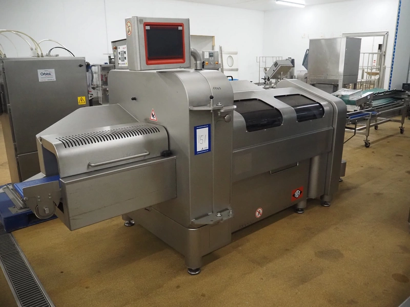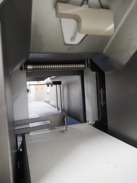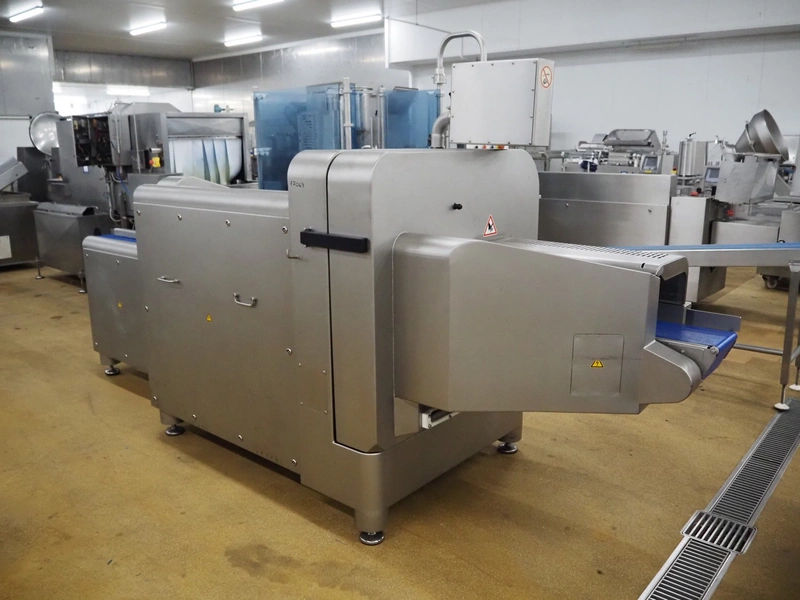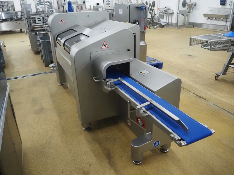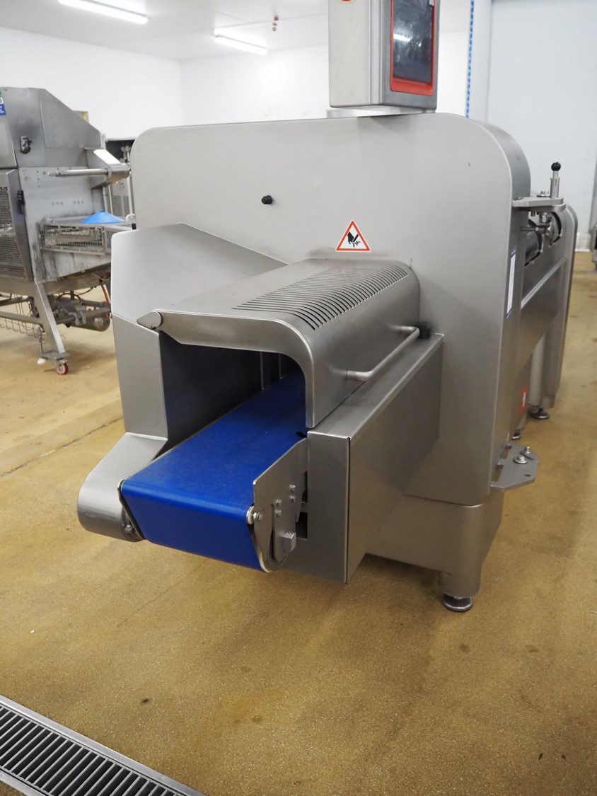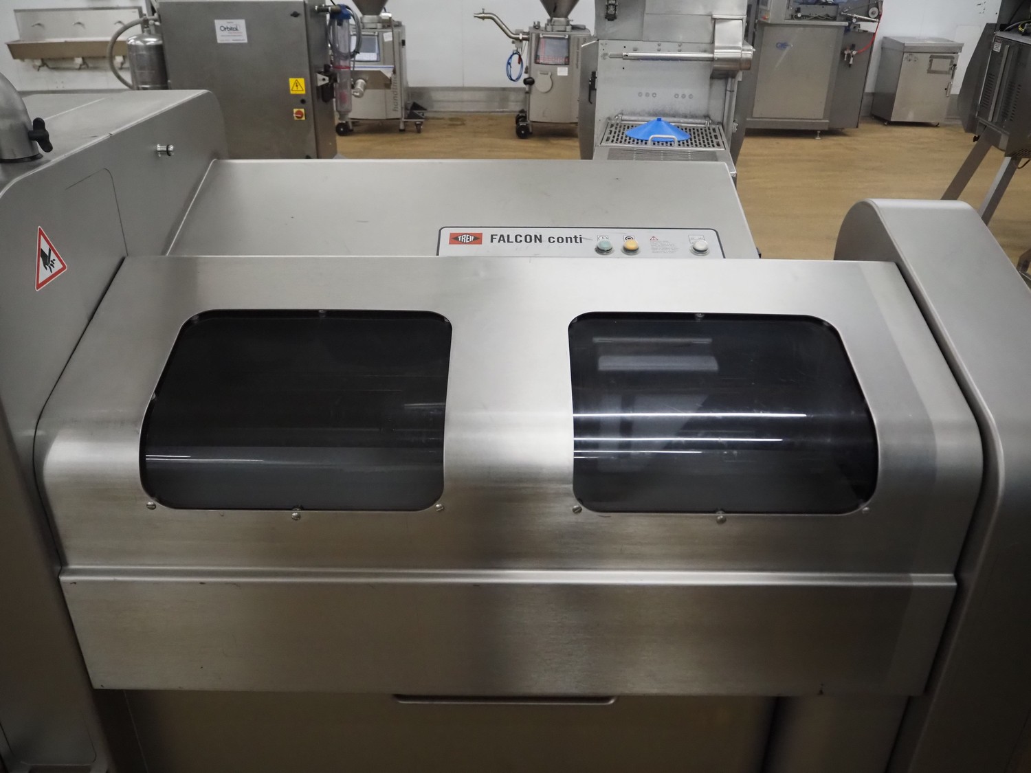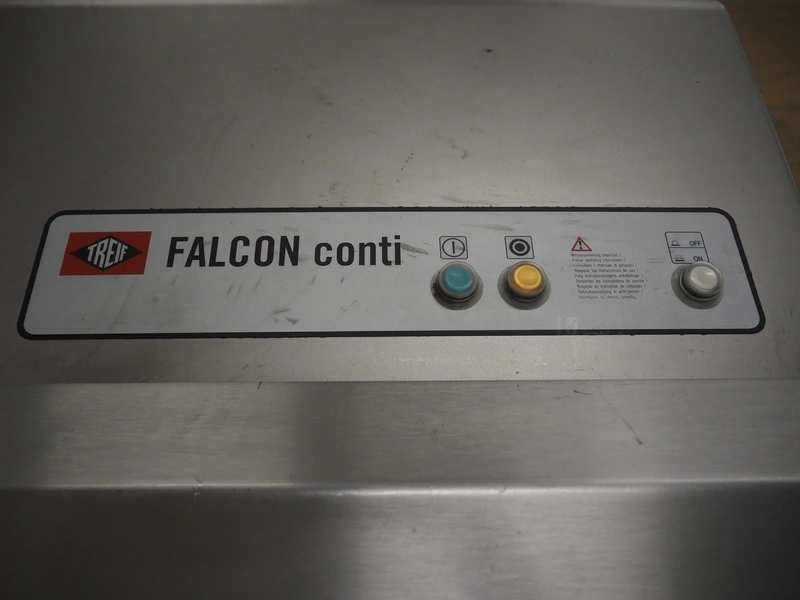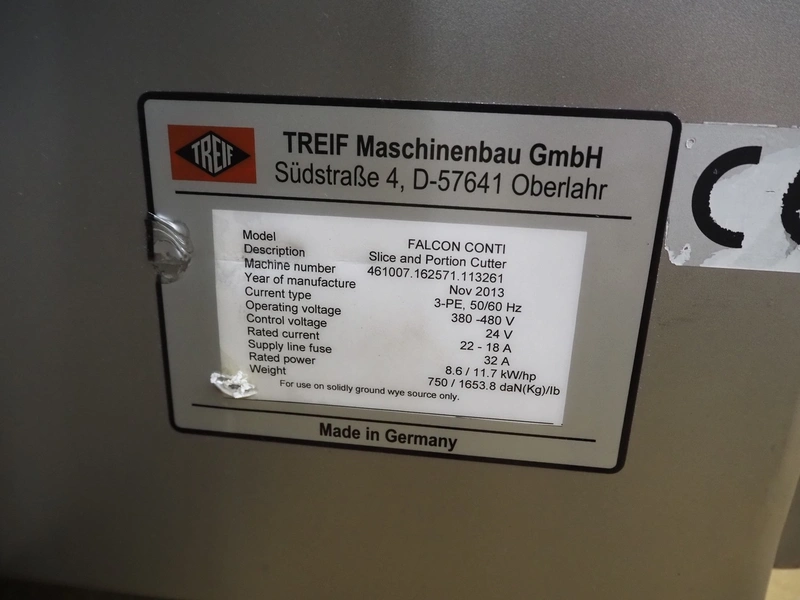 Treif Maschinenbau GmbH slicer and portion cutter, model: FALCON CONTI, machine number: 461007.162571.113261, year of construction: November 2013, 380-480 V, 3 Ph, 50/60 Hz, 22-18 A, 8.6/11.7 kW, weight: 750 kg, plastic belt, belt width: 220 mm, total dimensions: 4520 mm x 1300 mm x 1850 mm.