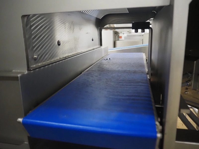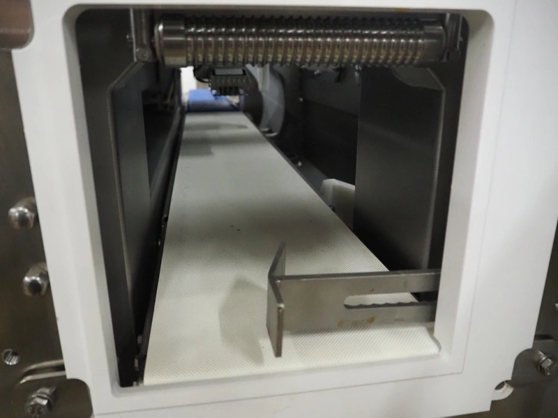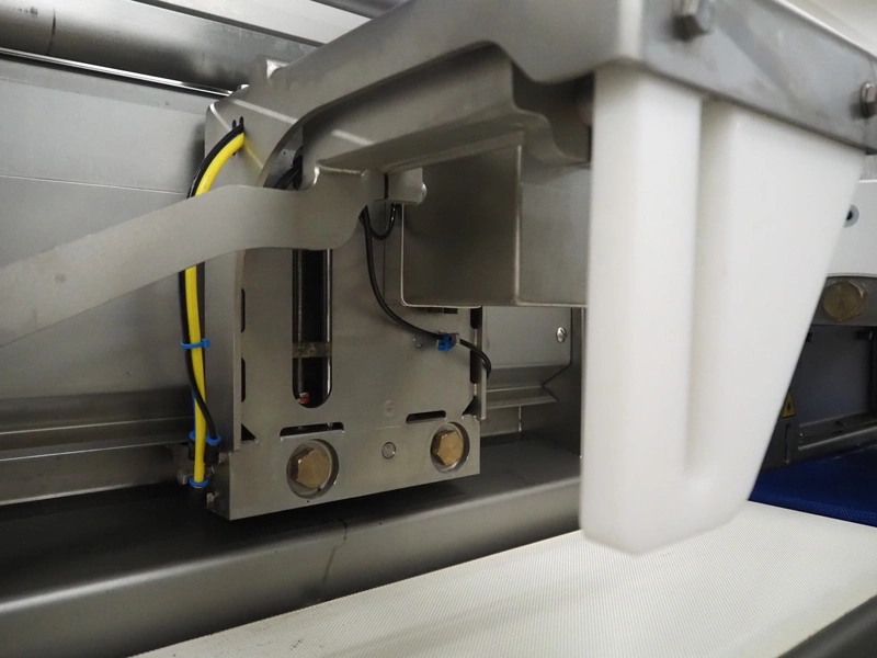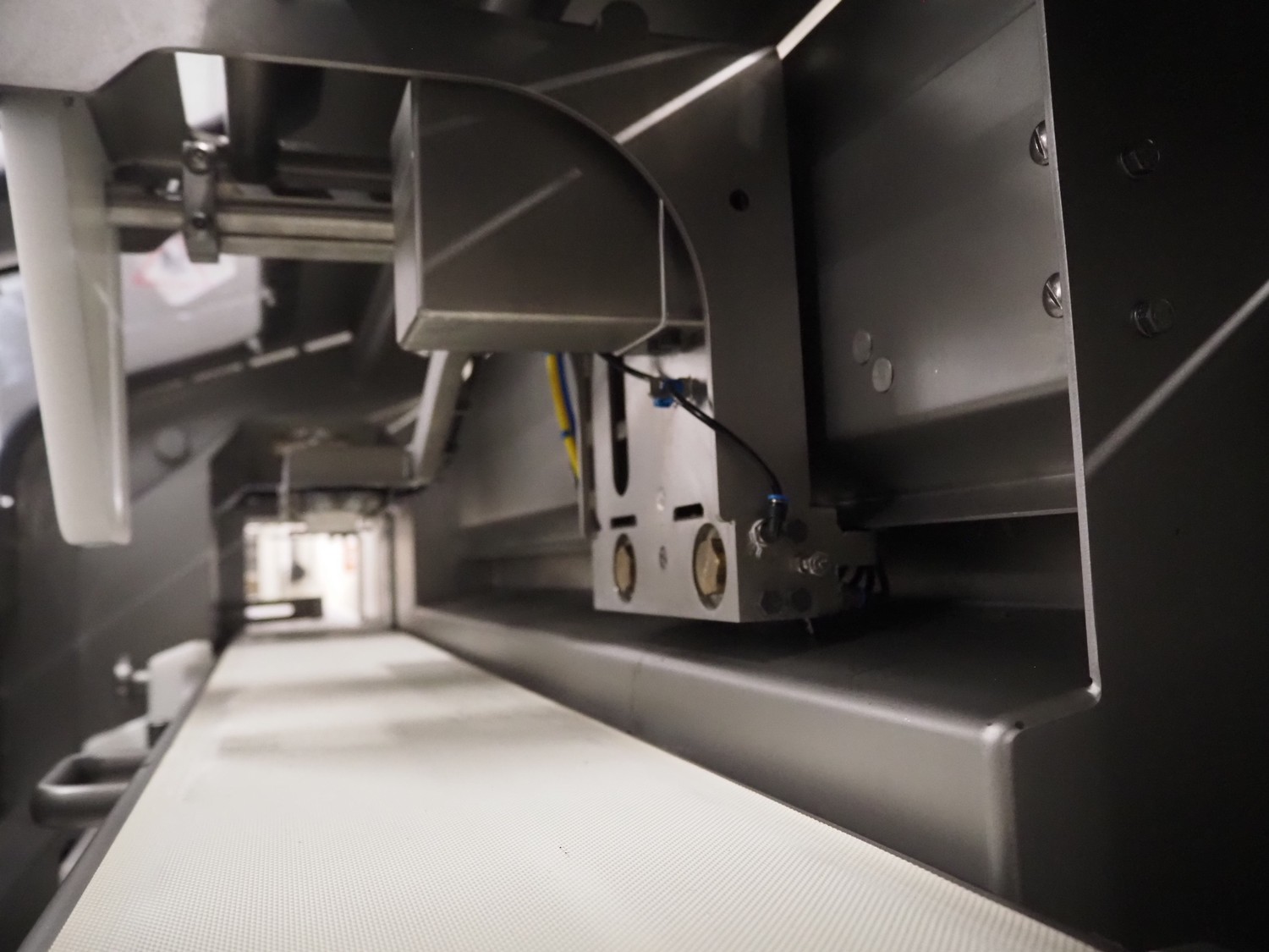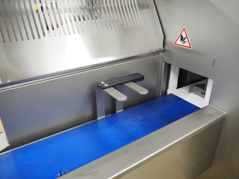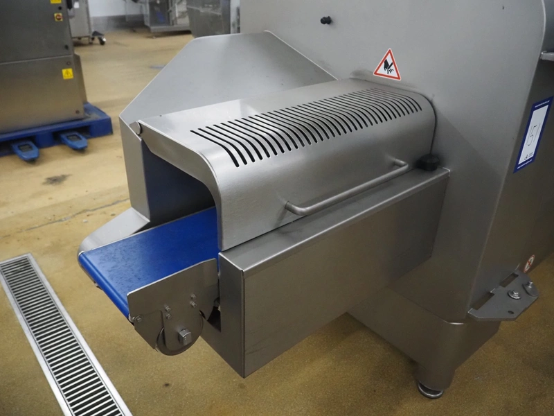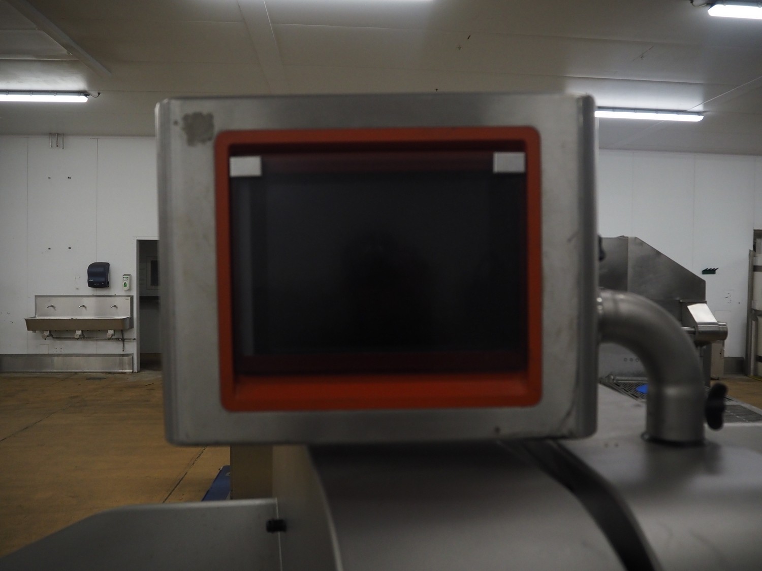Treif Maschinenbau GmbH slicer and portion cutter, model: FALCON CONTI, machine number: 461007.162571.113261, year of construction: November 2013, 380-480 V, 3 Ph, 50/60 Hz, 22-18 A, 8.6/11.7 kW, weight: 750 kg, plastic belt, belt width: 220 mm, total dimensions: 4520 mm x 1300 mm x 1850 mm.
