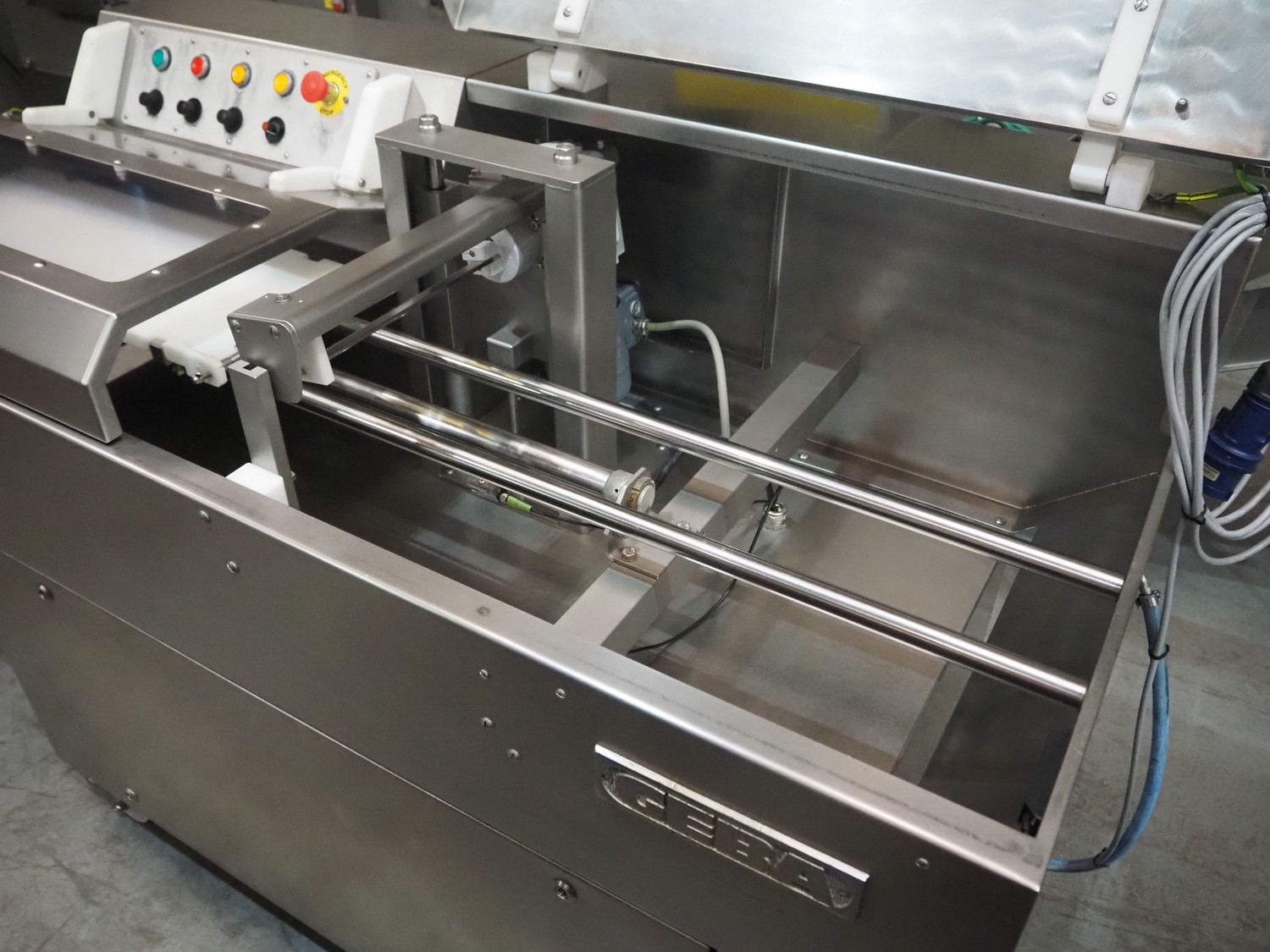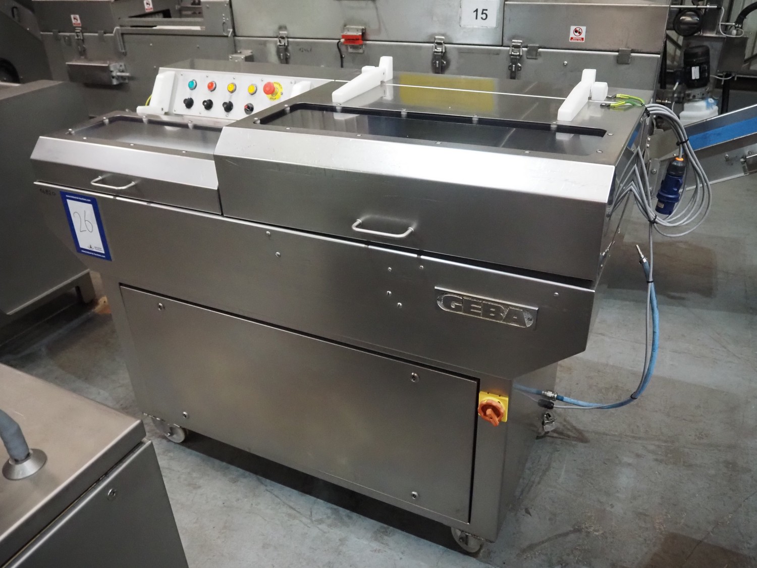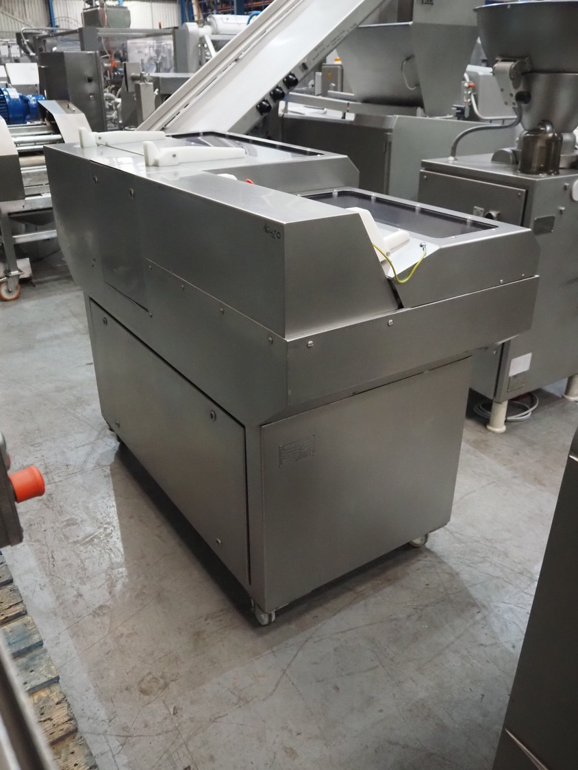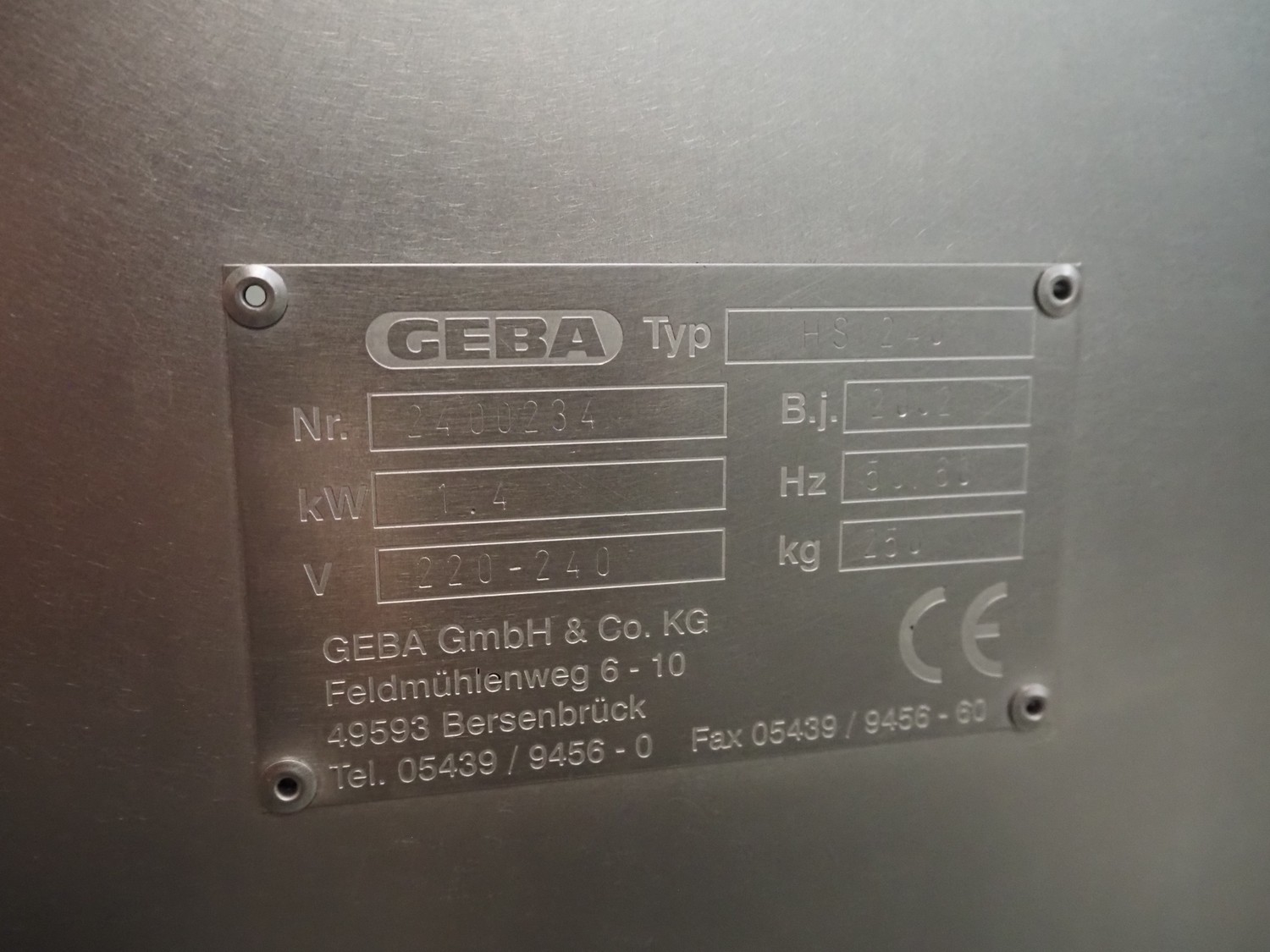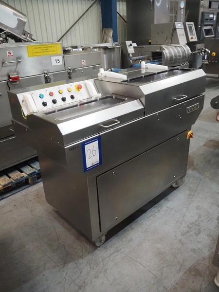 GEBA GmbH & Co. KG salmon slicer, type: HS 240, number: 2400234, year of construction: 2002, 220-240 V, 50/60 Hz, 1.4 kW, weight: 250 kg, working width: 250 mm, total dimensions: 1580 mm x 800 mm x 1250 mm.