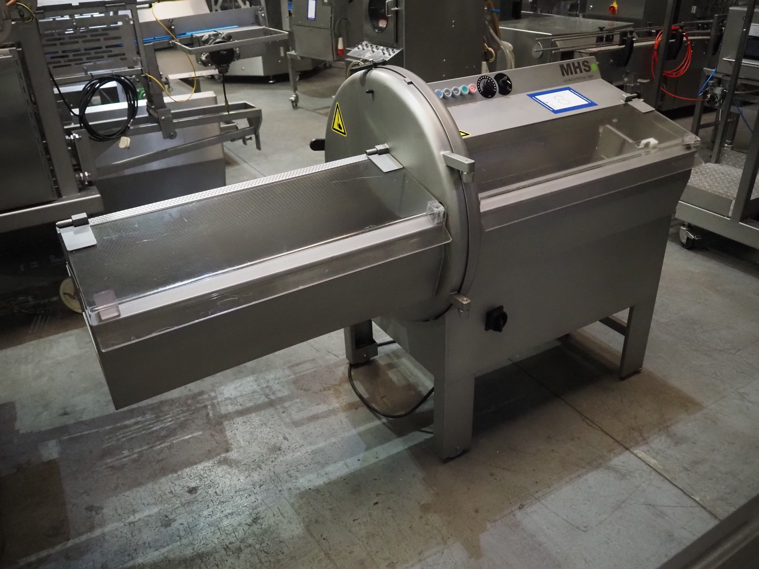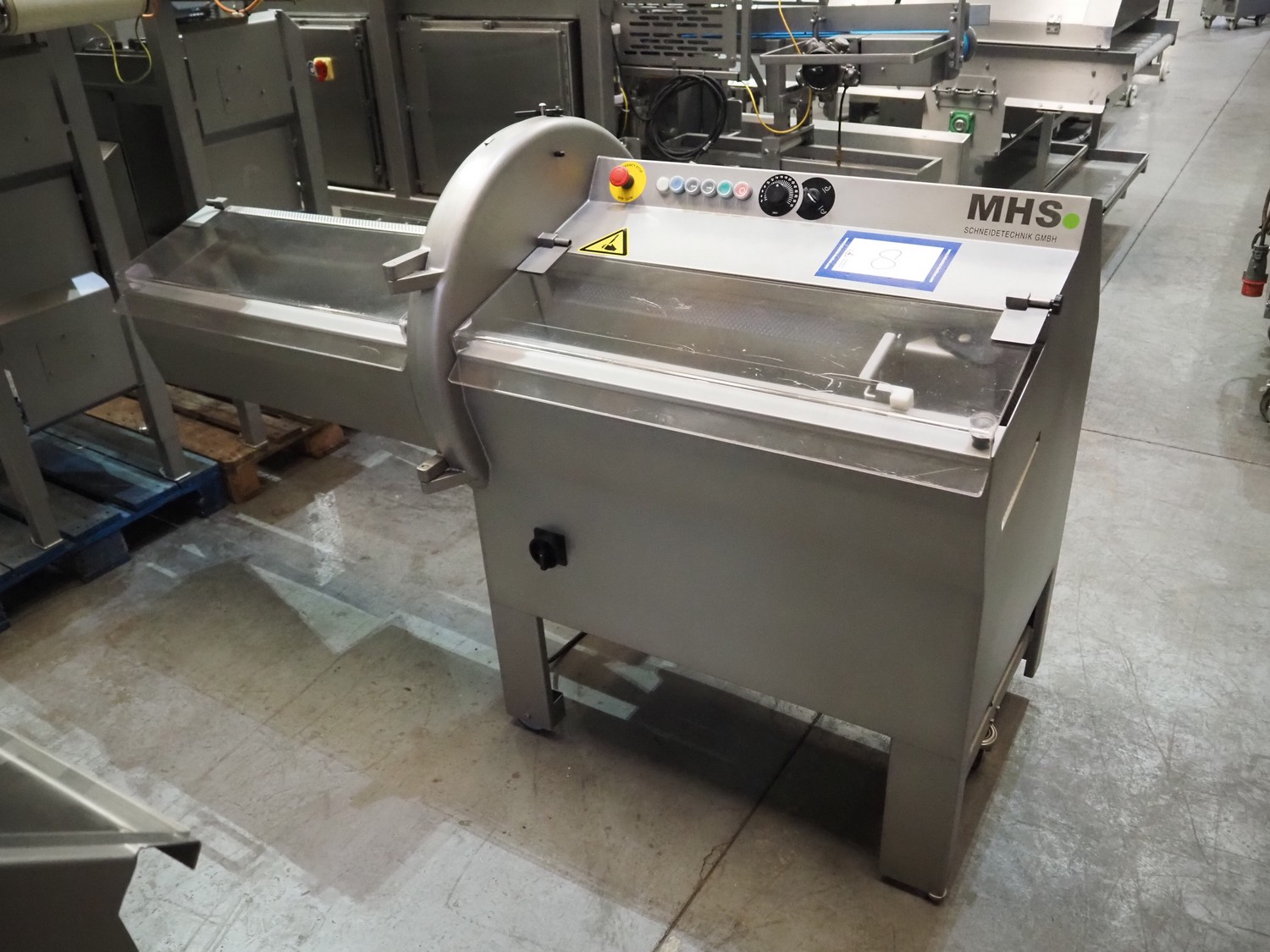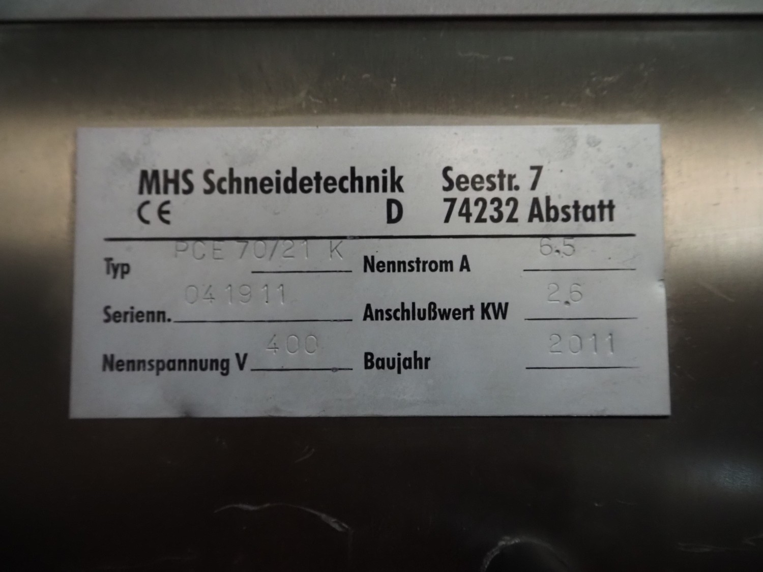 MHS Schneidetechnik slicer, type: PCE 70/21 K, serial number: 041911, year of construction: 2011, 400 V, 6.5 A, 2.6 kW, dimensions chamber: 200 mm x 200 mm, total dimensions: 1850 mm x 800 mm x 1250 mm.