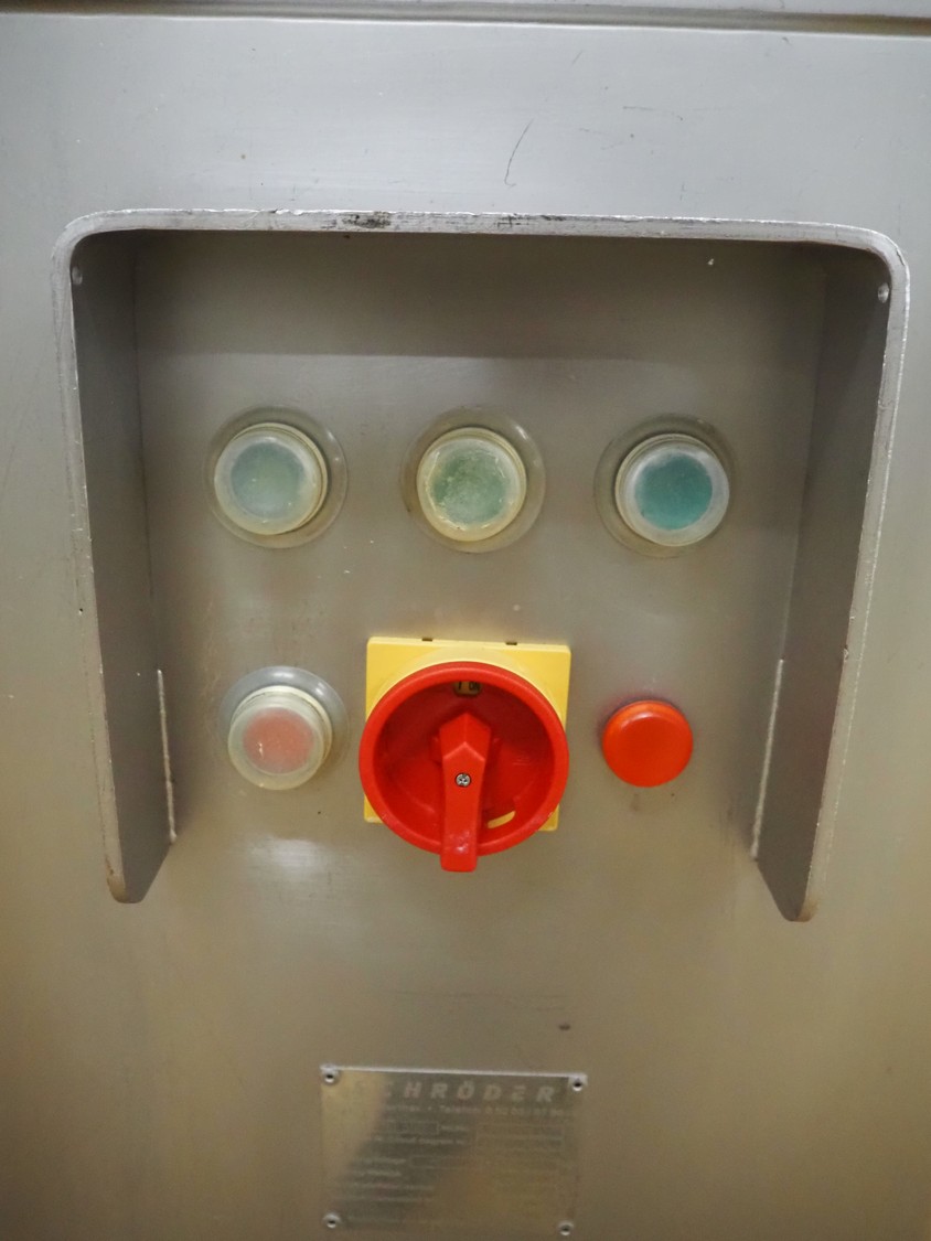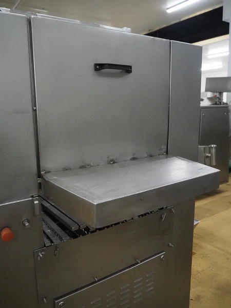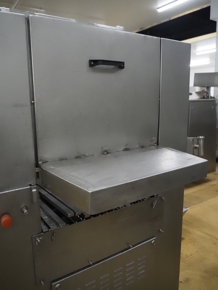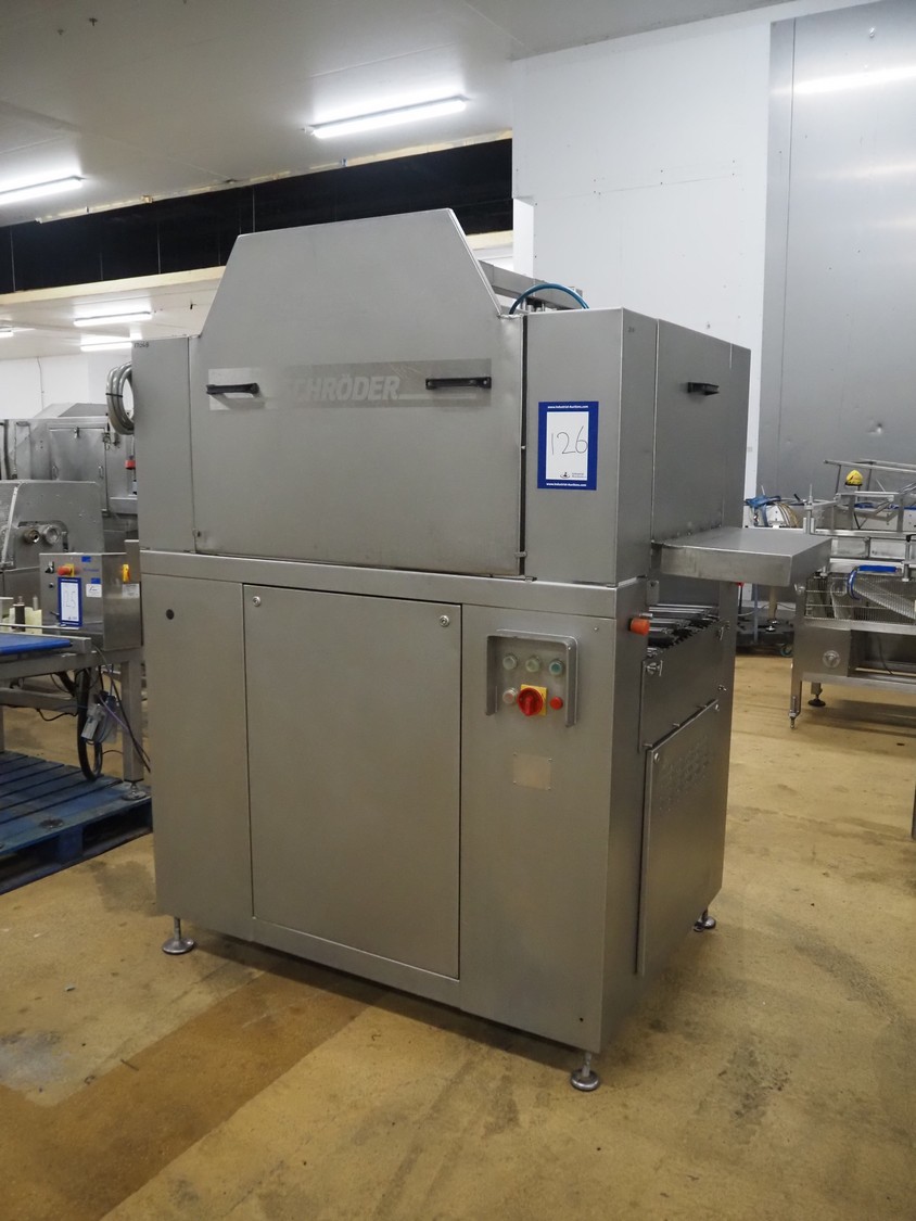 Schröder tenderiser, type: NT 350, number: 35028802, year of construction: 2000, 400 V, 50 Hz, 19 A, 5 kW, s/s walking beam, total belt width: 640 mm, 476 needles, total dimensions: 2050 mm x 1300 mm x 2100 mm.