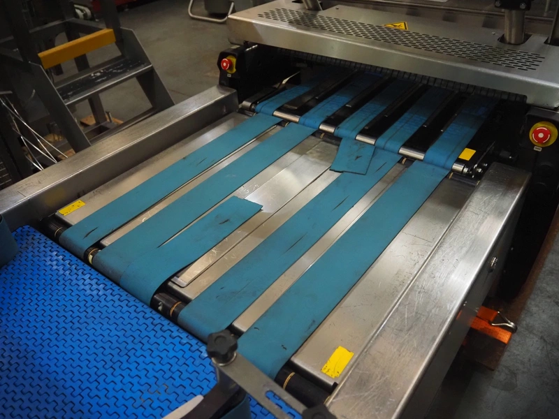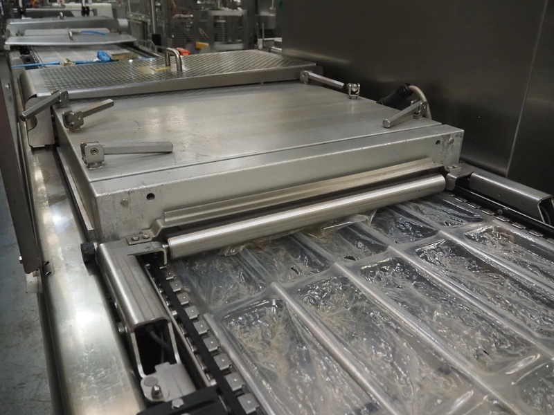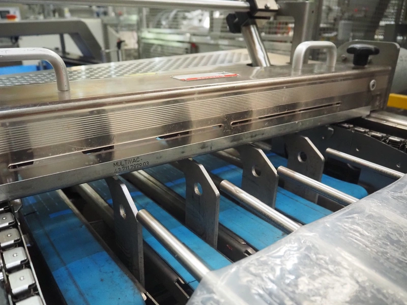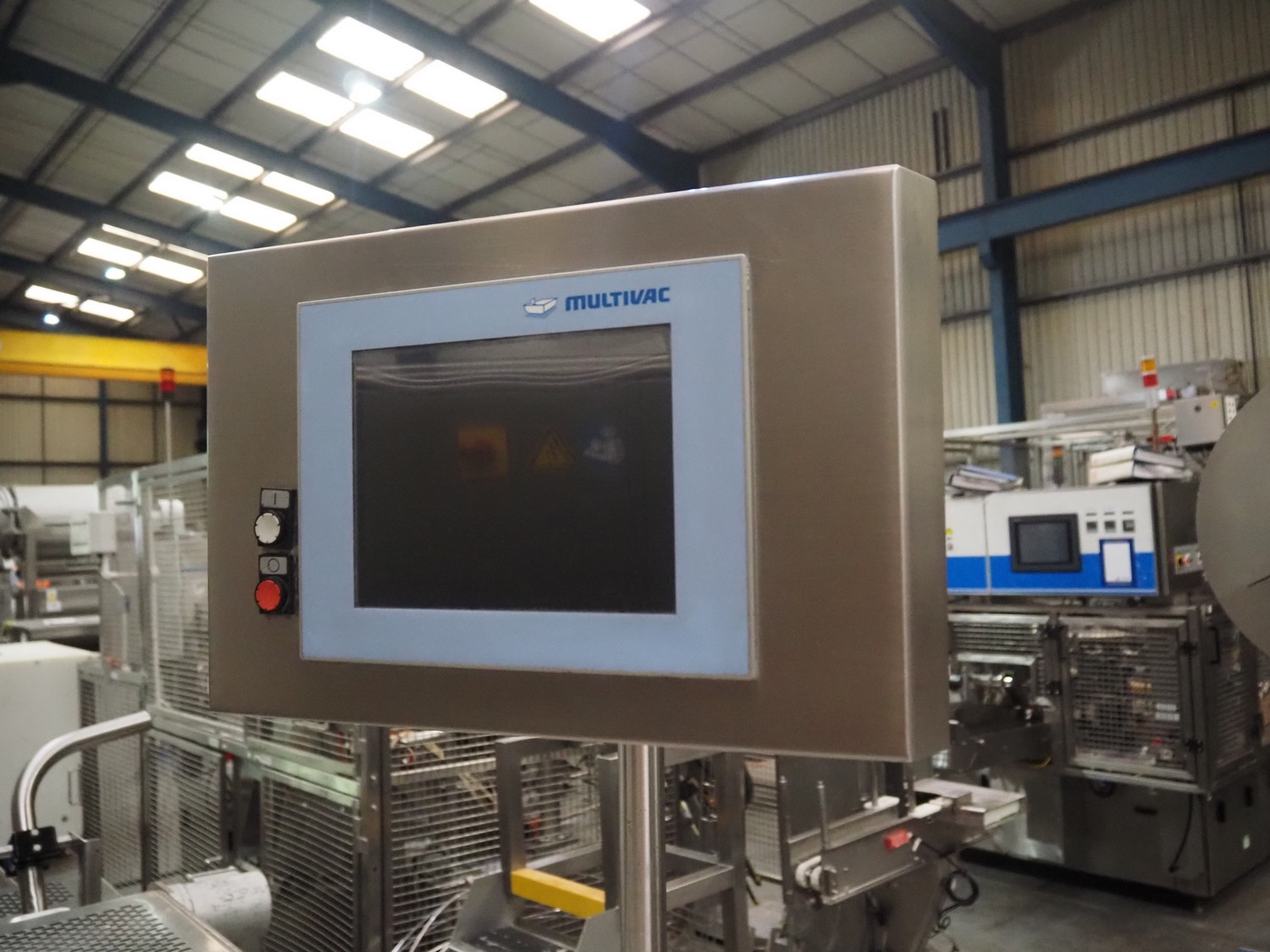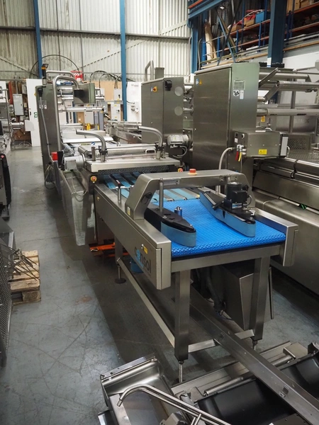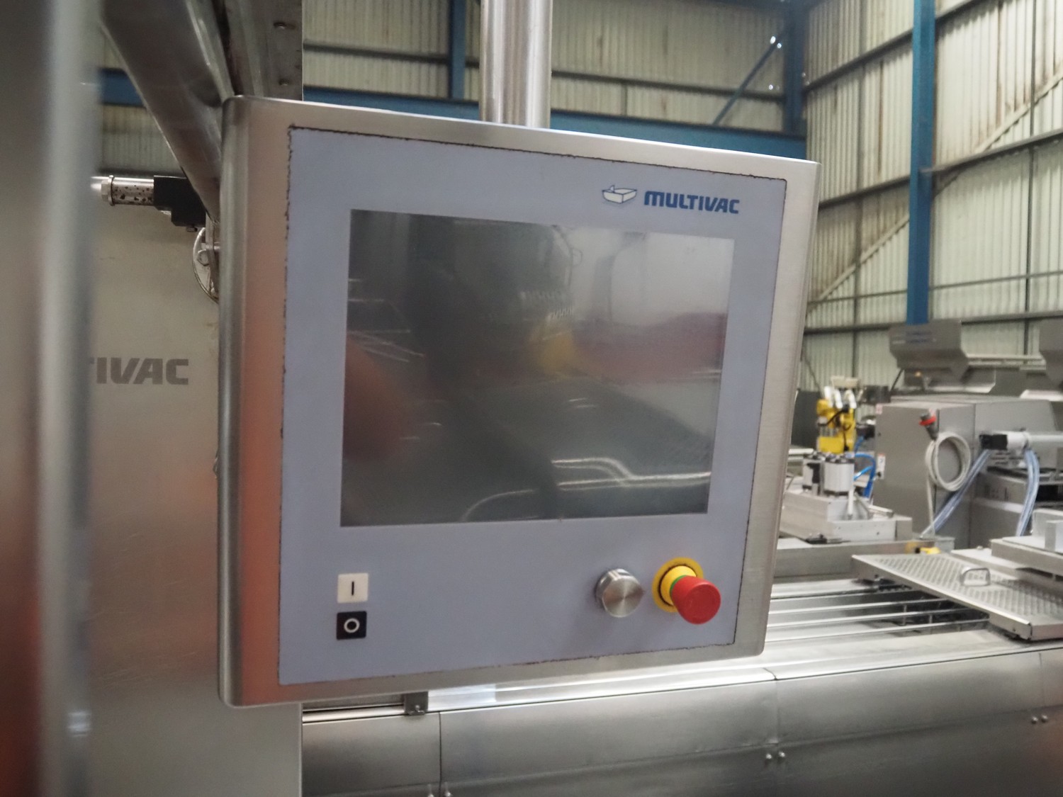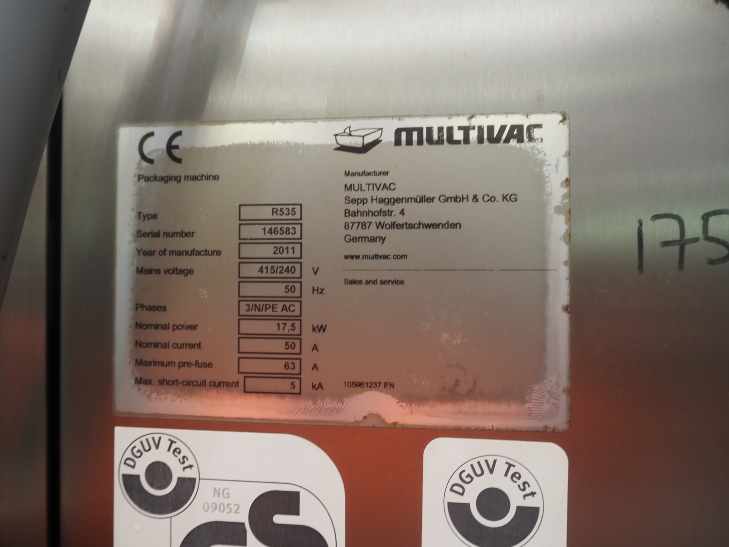 Multivac thermoformer with outfeed lane divider, type: R535, serial number: 146583, year of construction: 2011, 415 V, 3 Ph, 50 Hz, 50 A, 17.5 kW, film width: 570 mm, dimensions dye: (10x) 243 mm x 93 mm, with lane divider, plastic belt, belt width: (5x) 80 mm, 680 mm, dimensions thermoformer: 8200 mm x 1300 mm x 2300 mm, dimensions lane divider: 1500 mm x 1200 mm x 600 mm. Including pallet with parts.