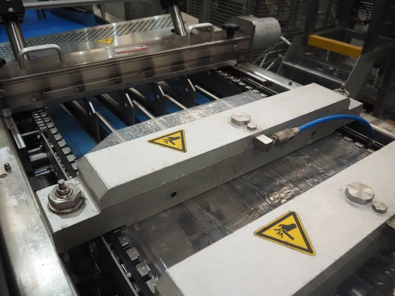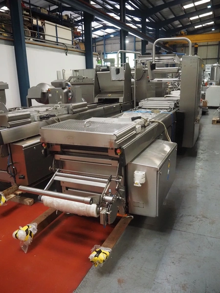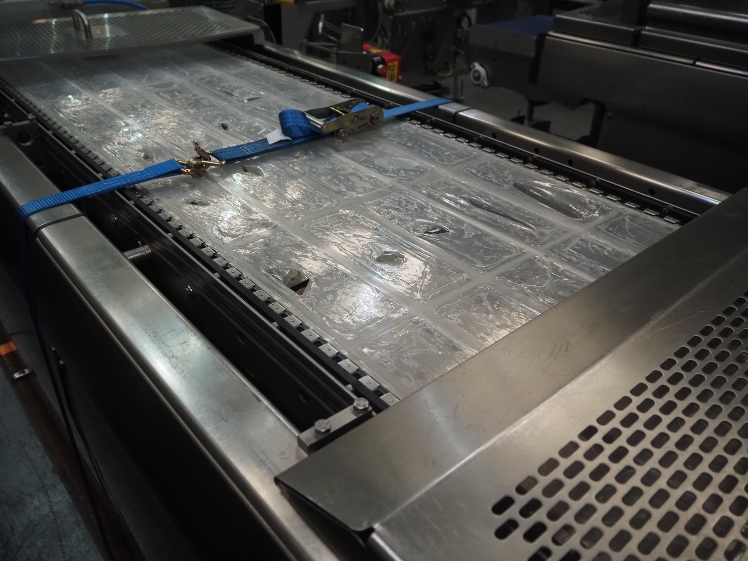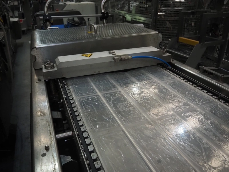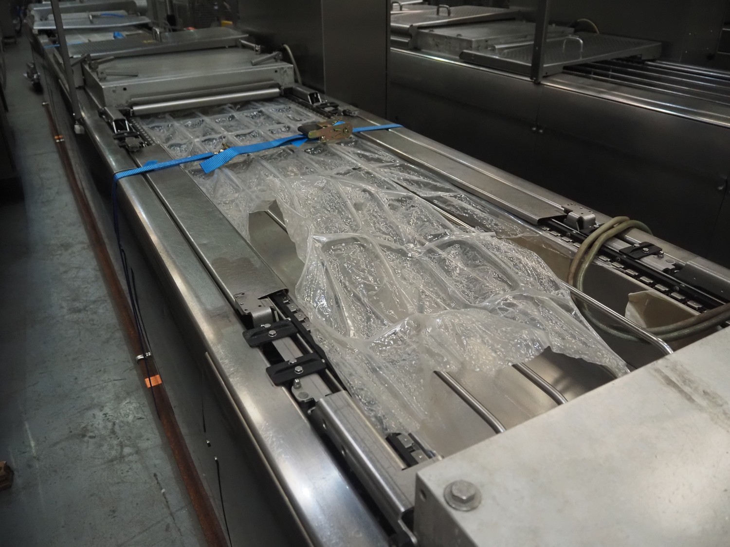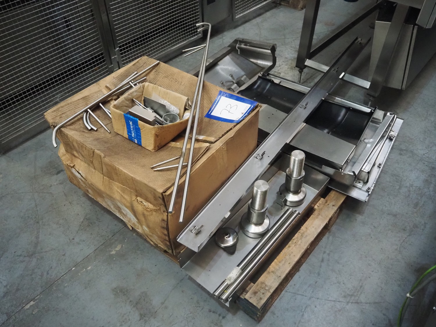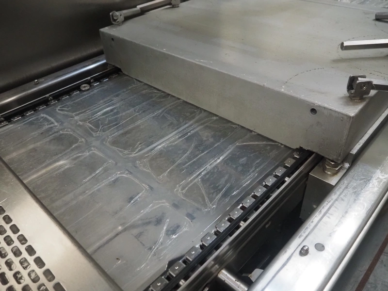 Multivac thermoformer with outfeed lane divider, type: R535, serial number: 146583, year of construction: 2011, 415 V, 3 Ph, 50 Hz, 50 A, 17.5 kW, film width: 570 mm, dimensions dye: (10x) 243 mm x 93 mm, with lane divider, plastic belt, belt width: (5x) 80 mm, 680 mm, dimensions thermoformer: 8200 mm x 1300 mm x 2300 mm, dimensions lane divider: 1500 mm x 1200 mm x 600 mm. Including pallet with parts.