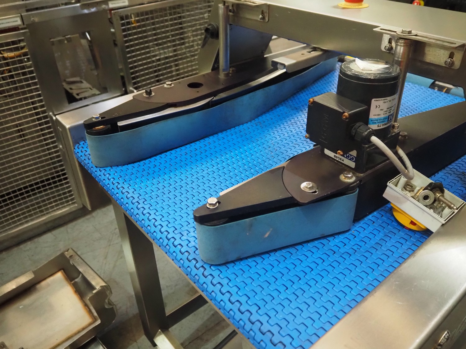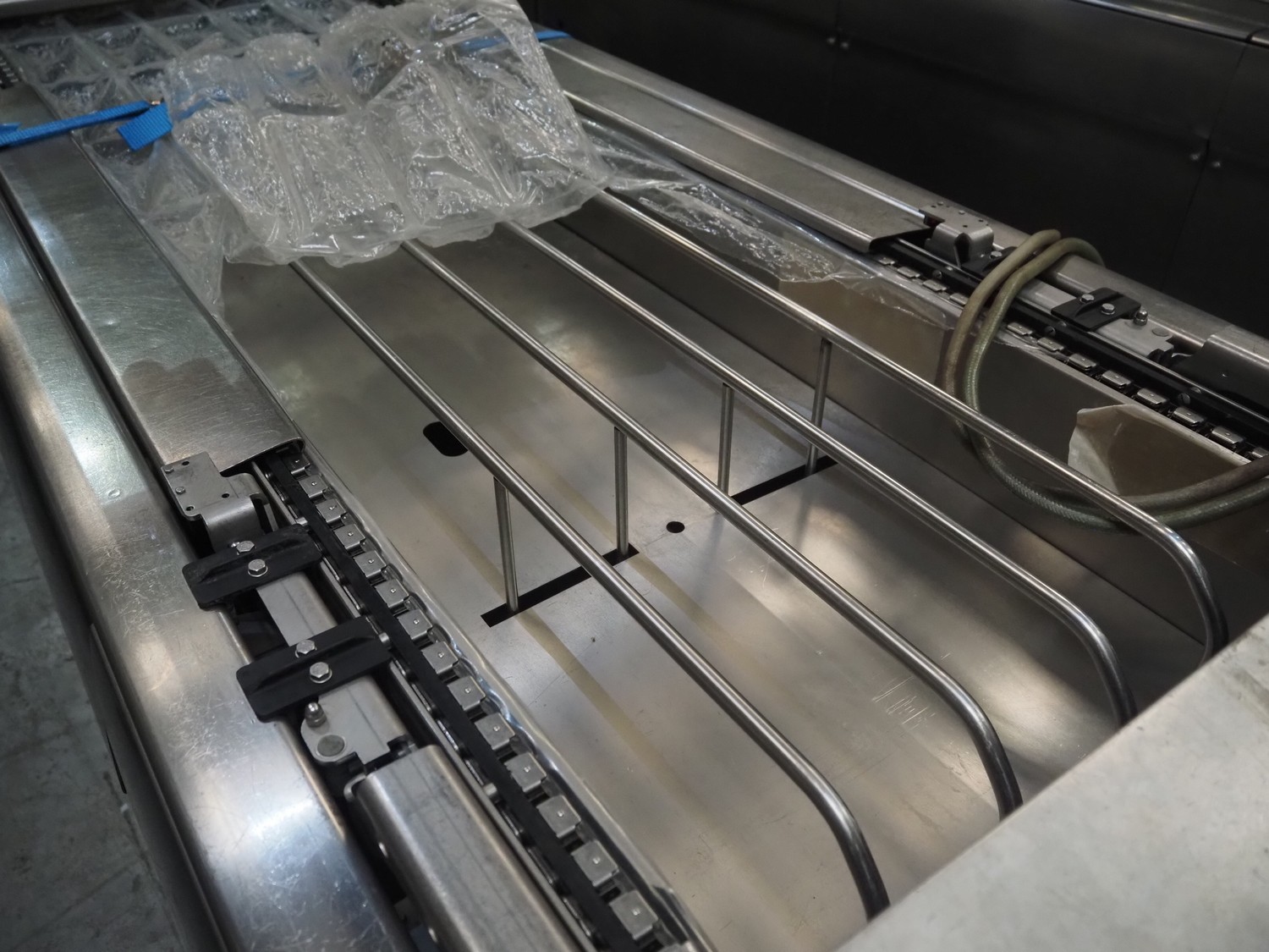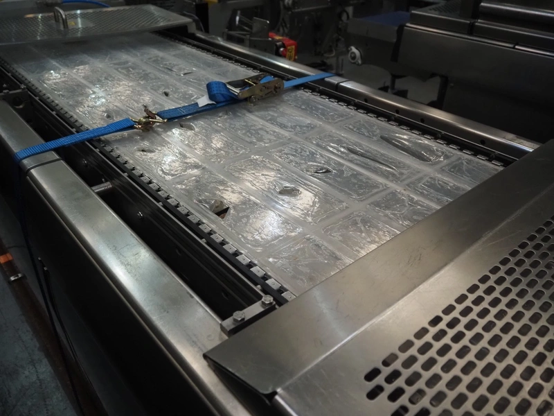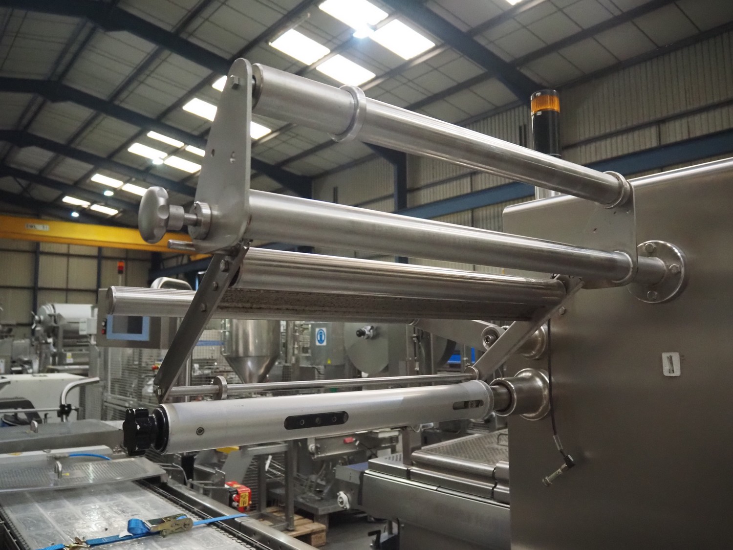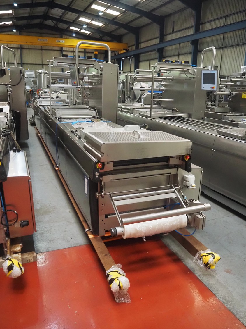 Multivac thermoformer with outfeed lane divider, type: R535, serial number: 146583, year of construction: 2011, 415 V, 3 Ph, 50 Hz, 50 A, 17.5 kW, film width: 570 mm, dimensions dye: (10x) 243 mm x 93 mm, with lane divider, plastic belt, belt width: (5x) 80 mm, 680 mm, dimensions thermoformer: 8200 mm x 1300 mm x 2300 mm, dimensions lane divider: 1500 mm x 1200 mm x 600 mm. Including pallet with parts.