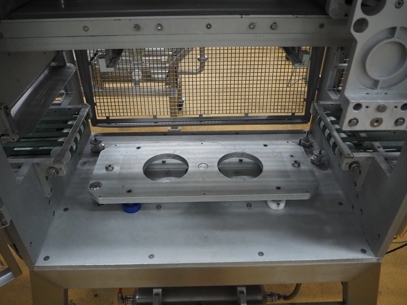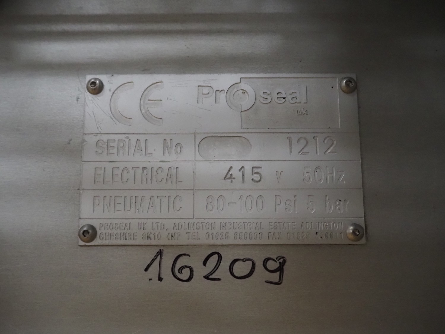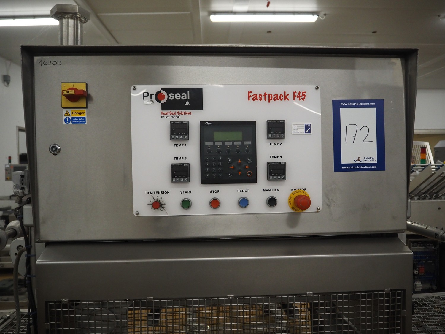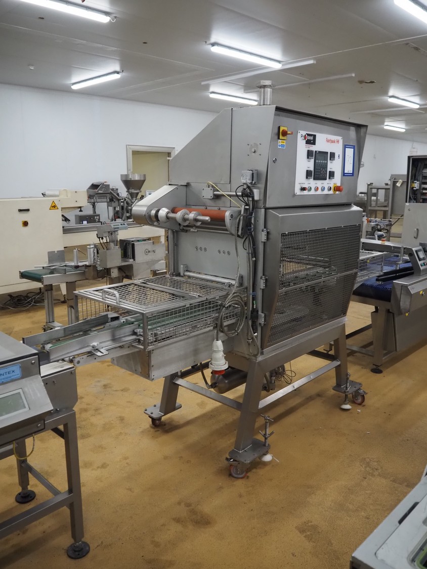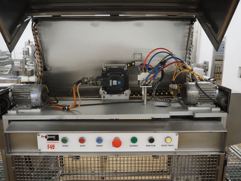 Proseal UK Ltd. mobile rotary traysealer, type: Fastpack F45, serial number: 1212, 415 V, 50 Hz, plastic wire belt, belt width: 180 mm, total dimensions: 1850 mm x 900 mm x 2150 mm. Without dye.