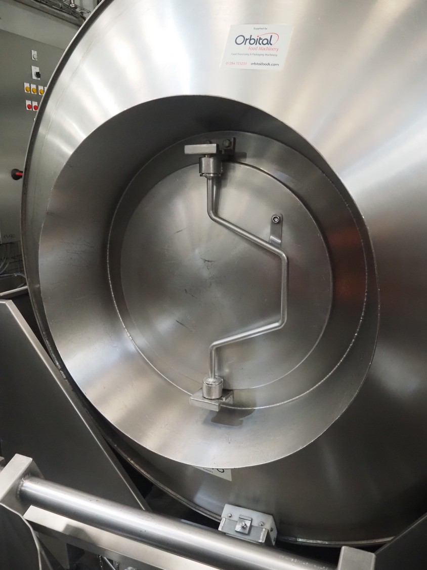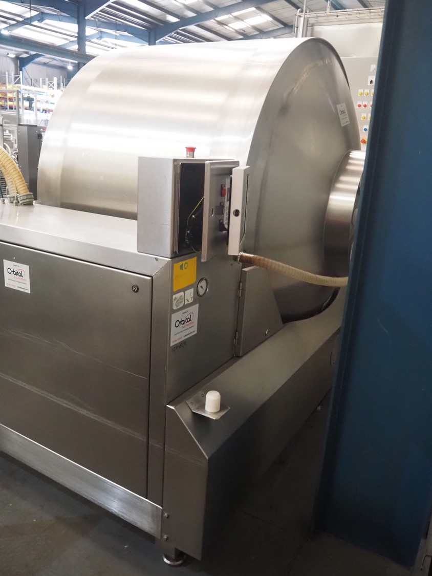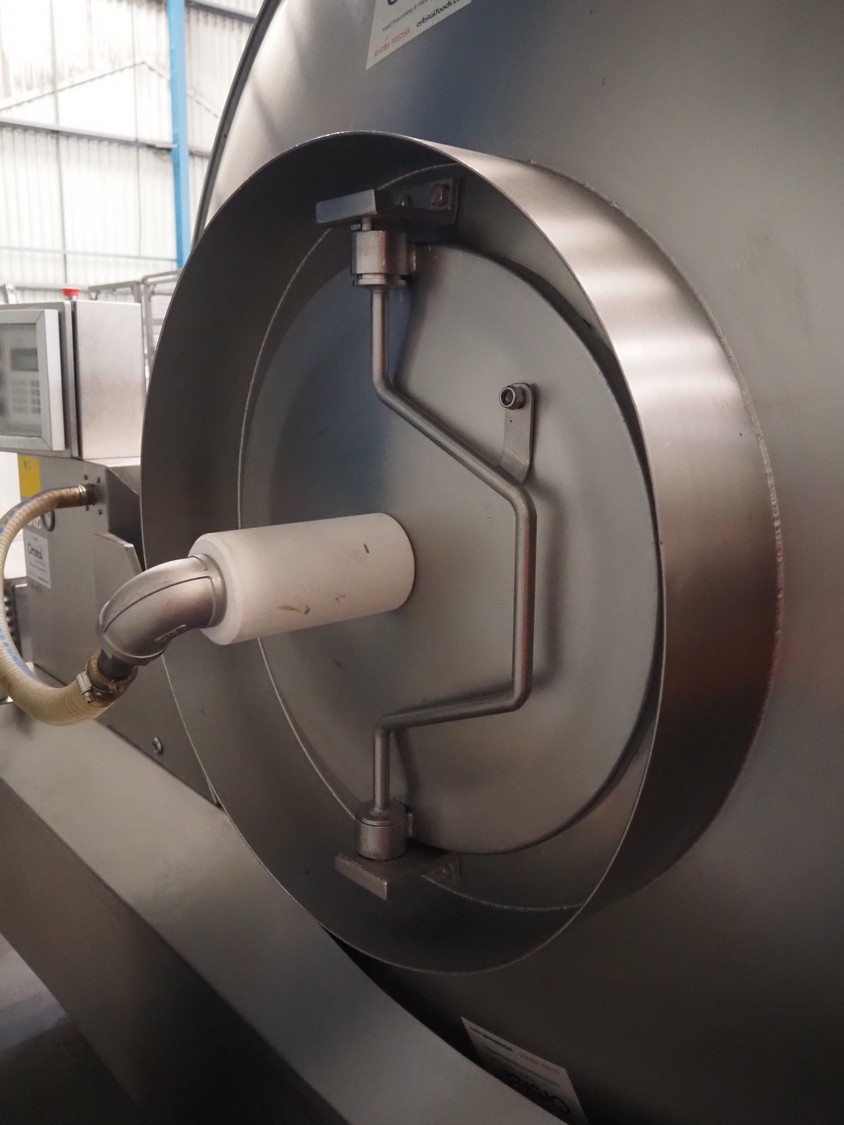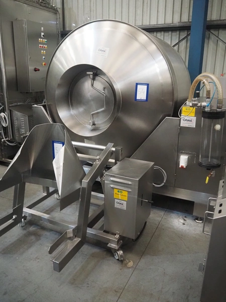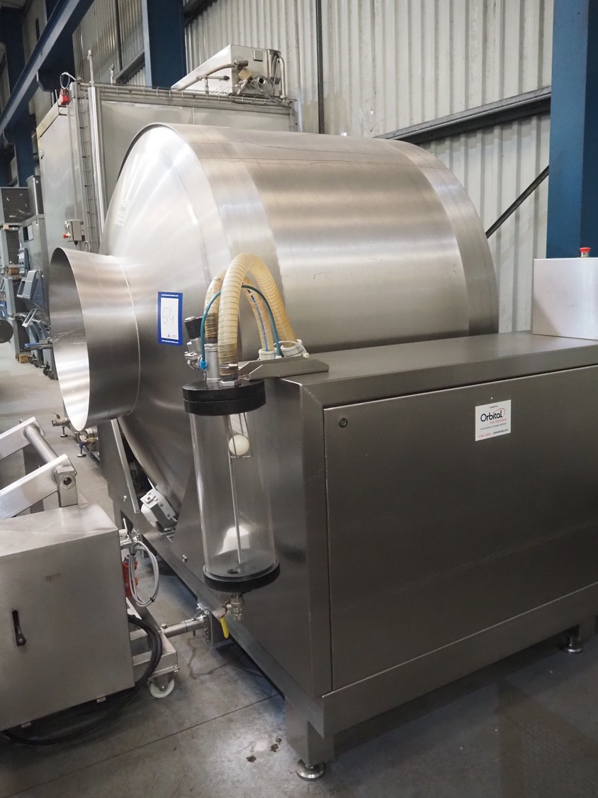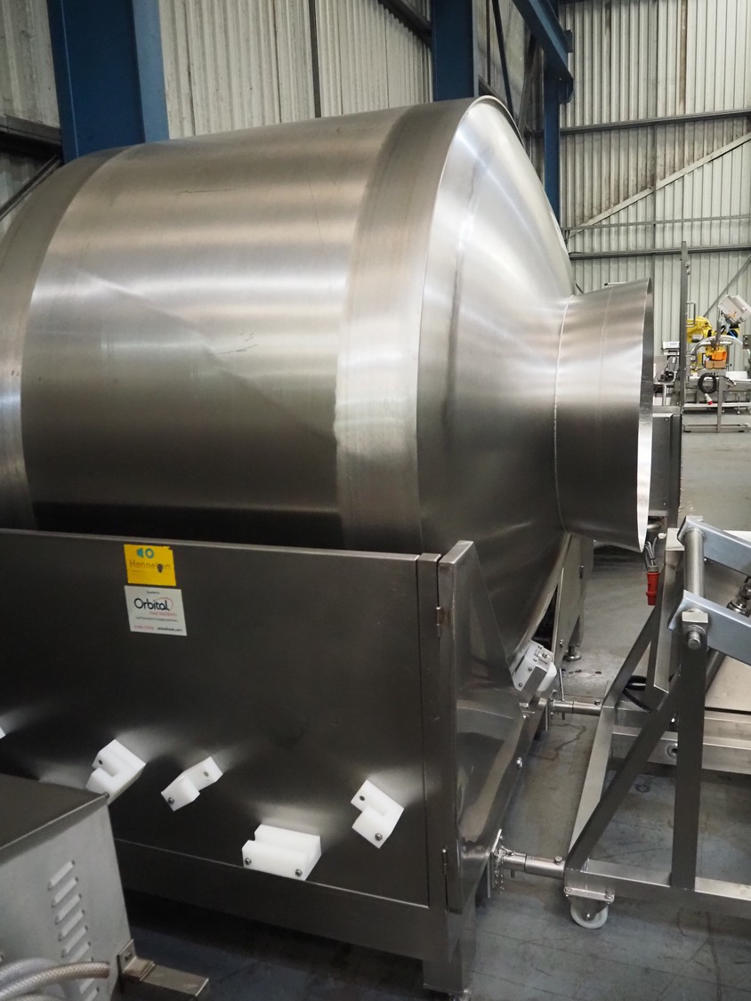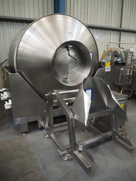 Henneken vacuum tumbler with lifter for 200 litres meat bins, model: C2, volume: 3650 litres, Busch vacuum pump, type: RC 0063 E, serial number: 03047677, capacity: 63 m³/h, dimensions: 3050 mm x 2550 mm x 2300 mm.