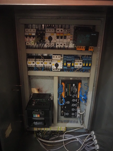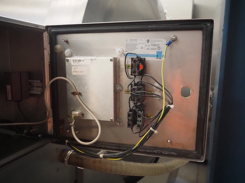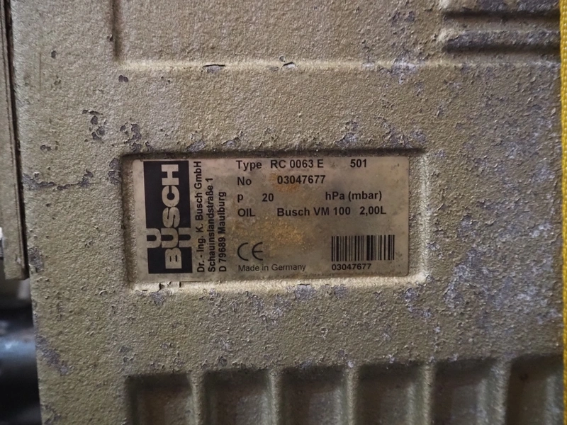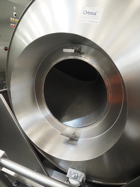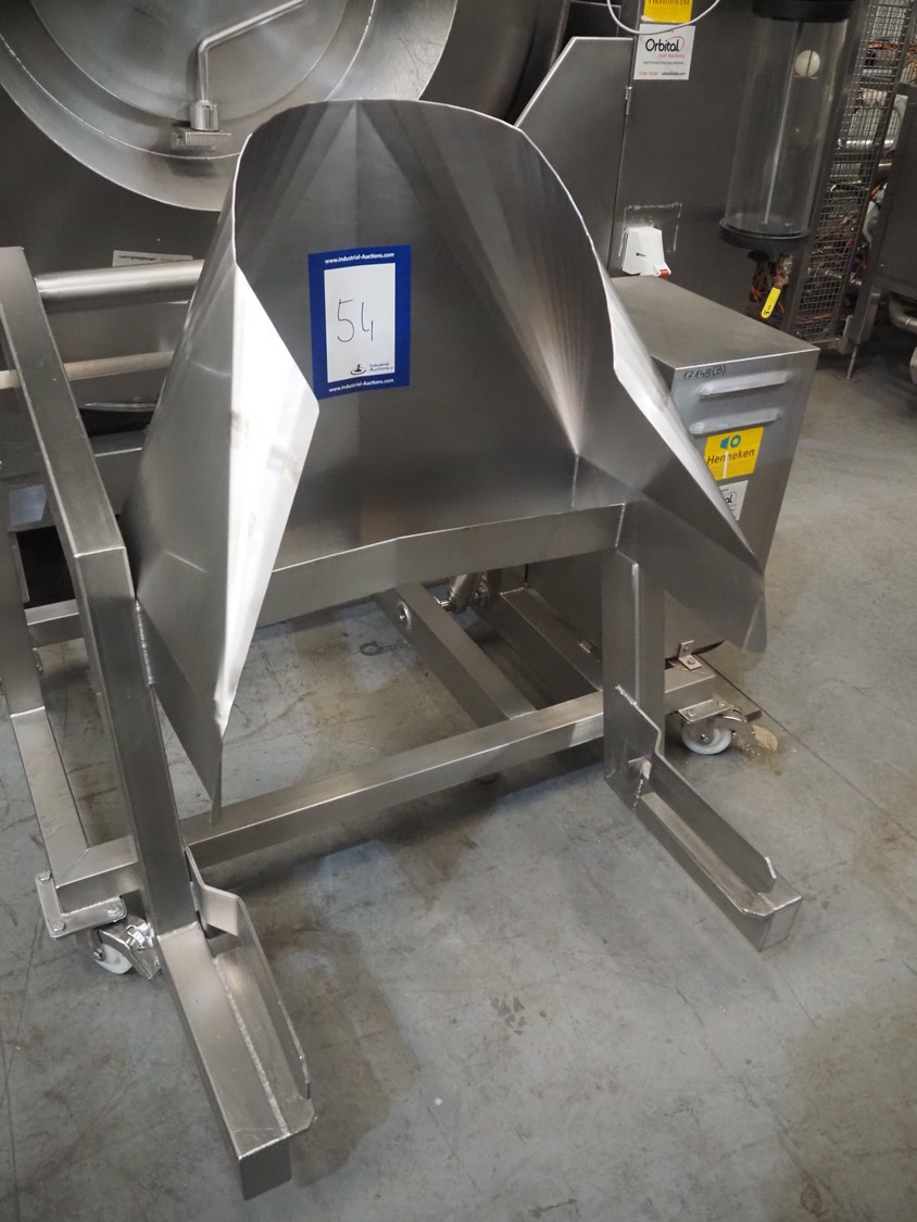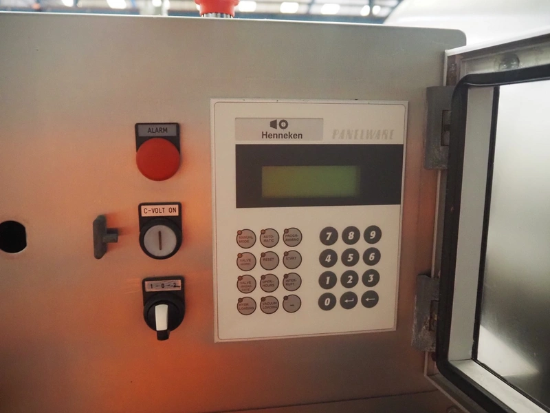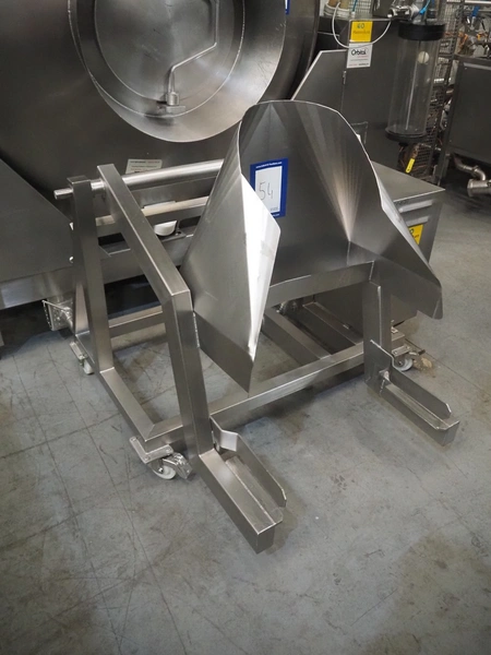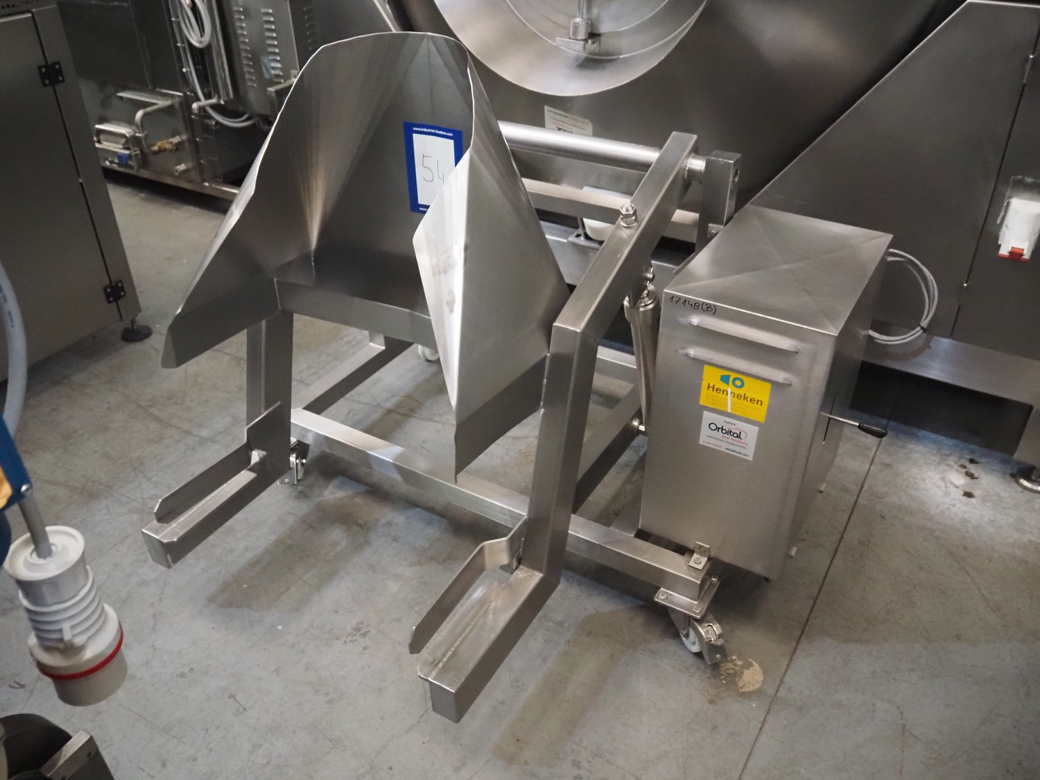 Henneken vacuum tumbler with lifter for 200 litres meat bins, model: C2, volume: 3650 litres, Busch vacuum pump, type: RC 0063 E, serial number: 03047677, capacity: 63 m³/h, dimensions: 3050 mm x 2550 mm x 2300 mm.