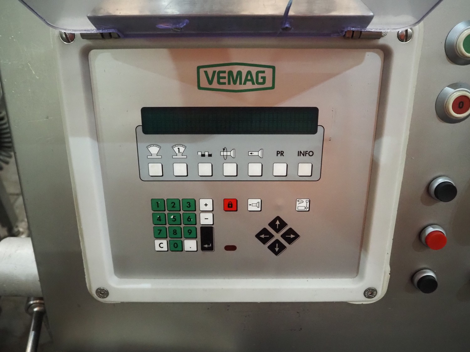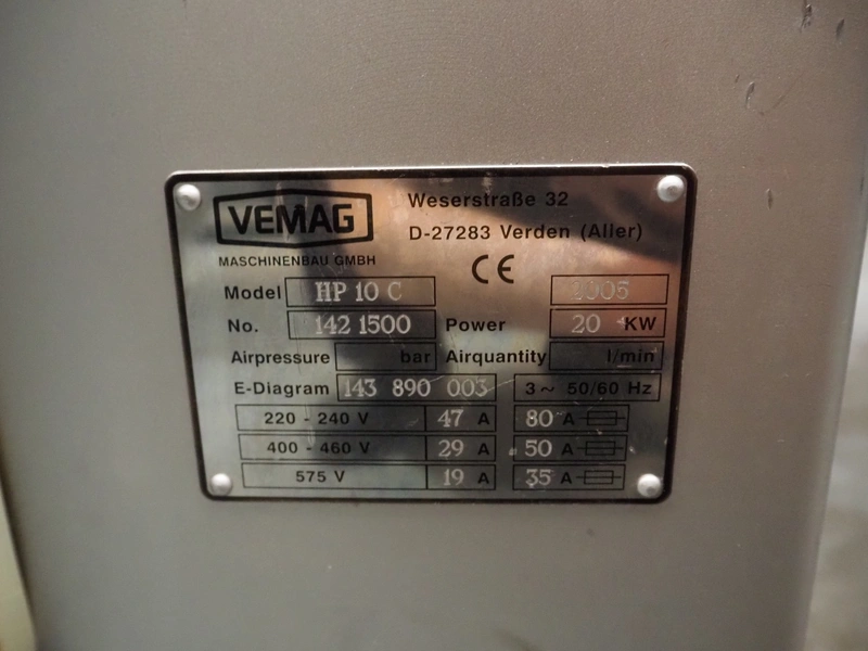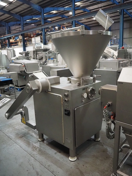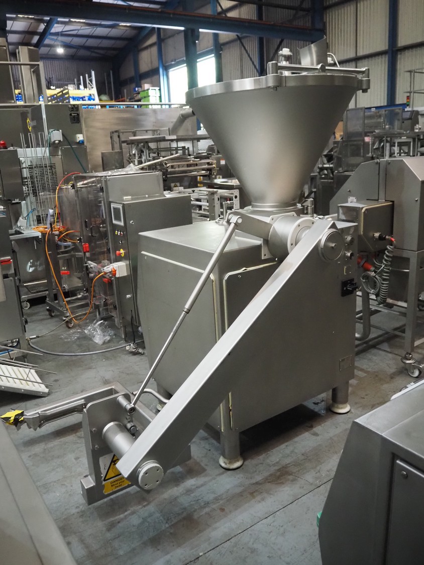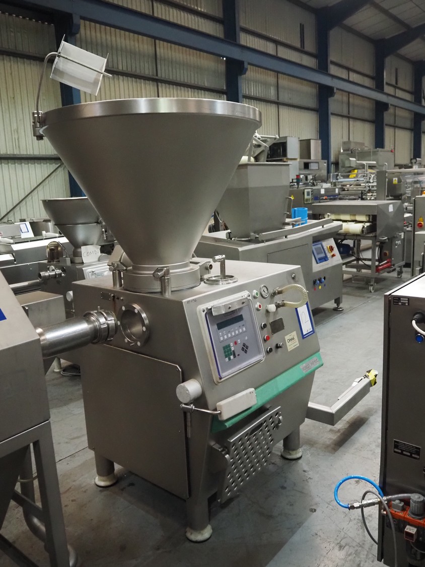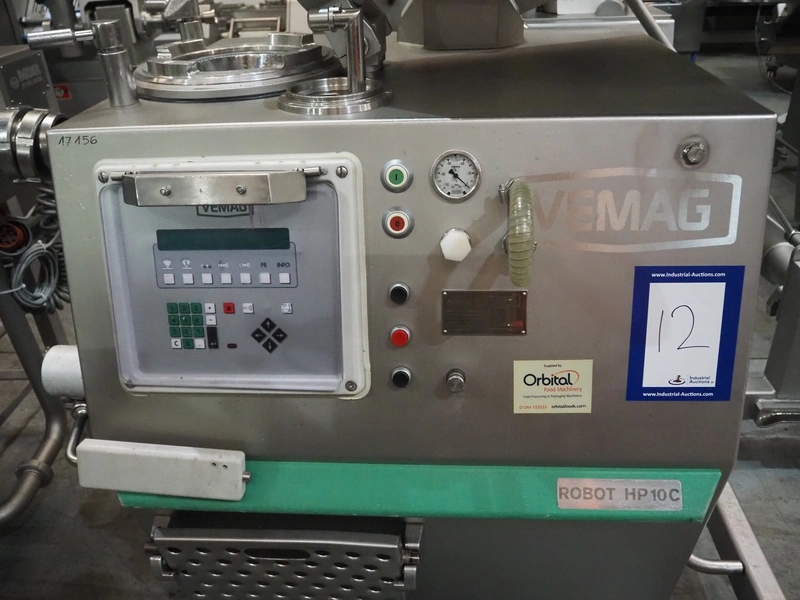 Vemag vacuum filling machine with lifter for 200 litre meat bins, model: HP 10 C, number: 142 1500, year of construction: 2005, 400-460 V, 3 Ph, 50/60 Hz, 29 A, 20 kW, dimensions: 2000 mm x 1300 mm x 2150 mm. Without augers.