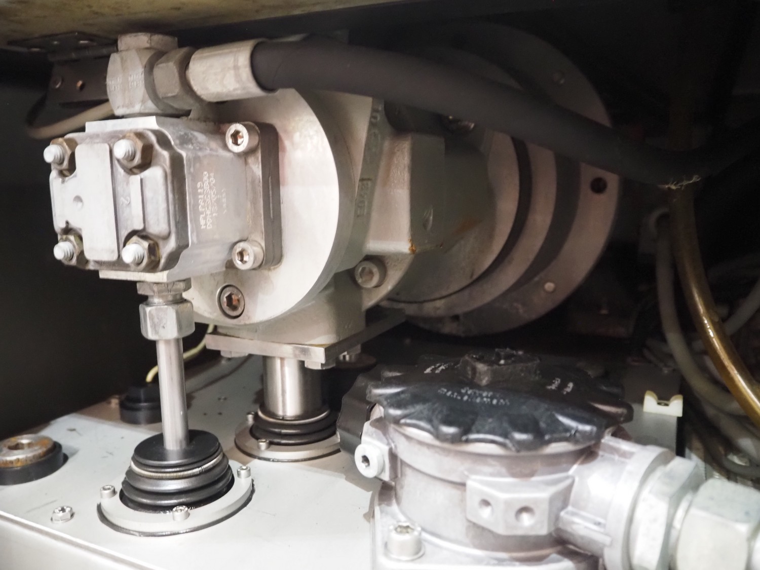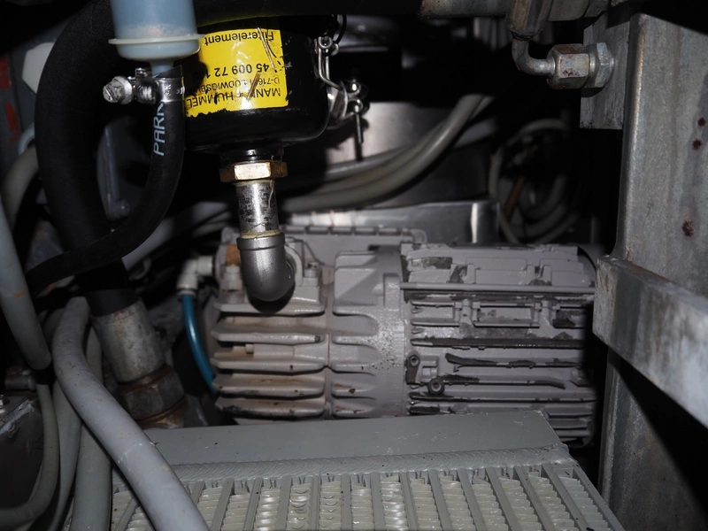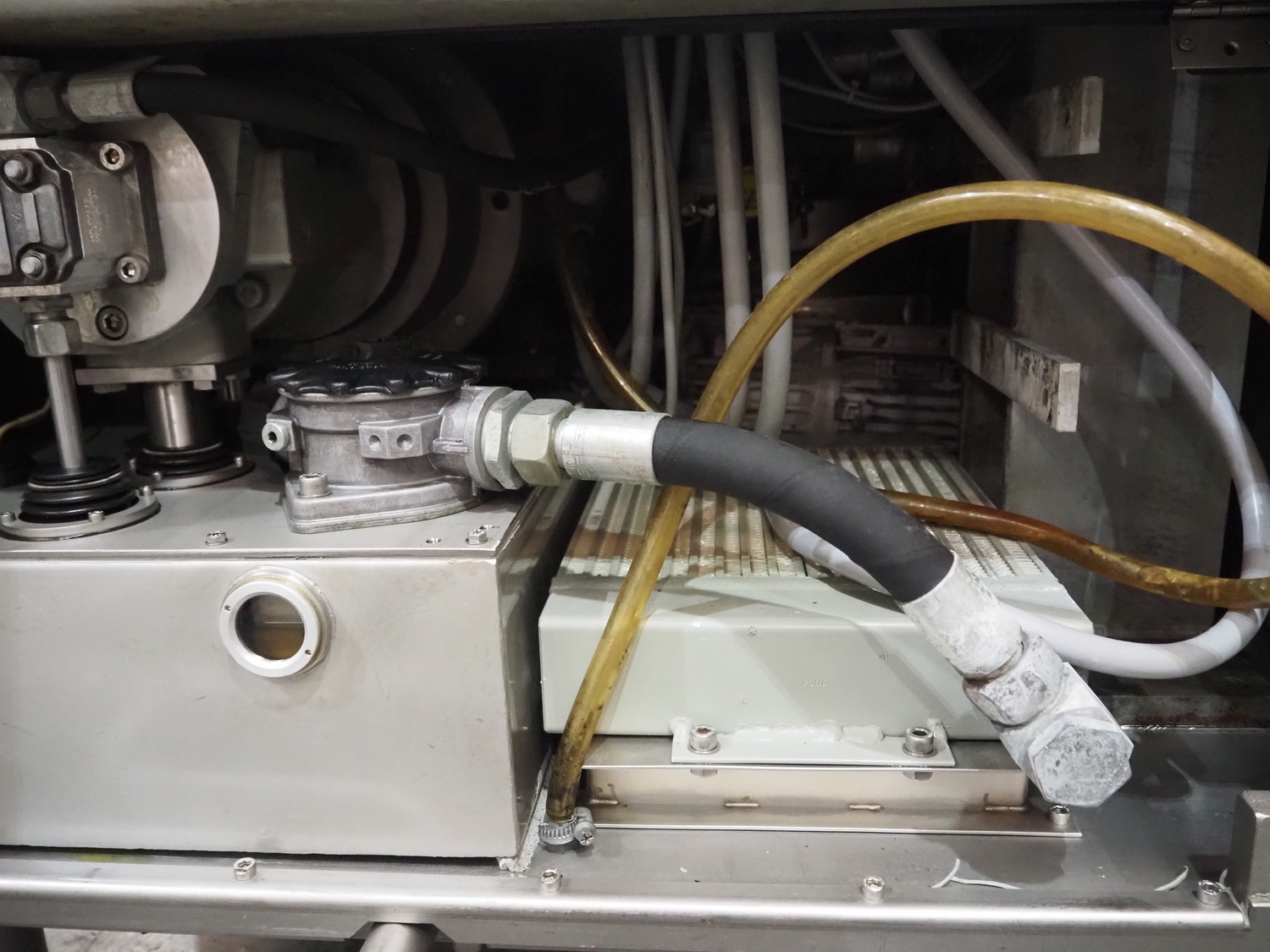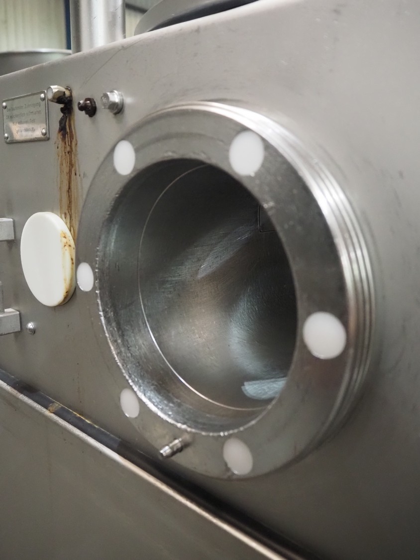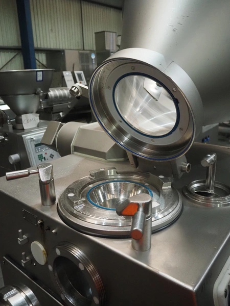 Vemag vacuum filling machine with lifter for 200 litre meat bins, model: HP 10 C, number: 142 1500, year of construction: 2005, 400-460 V, 3 Ph, 50/60 Hz, 29 A, 20 kW, dimensions: 2000 mm x 1300 mm x 2150 mm. Without augers.