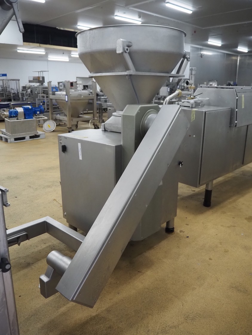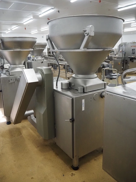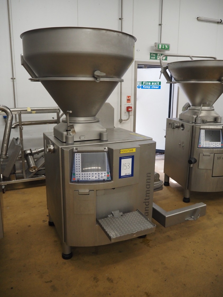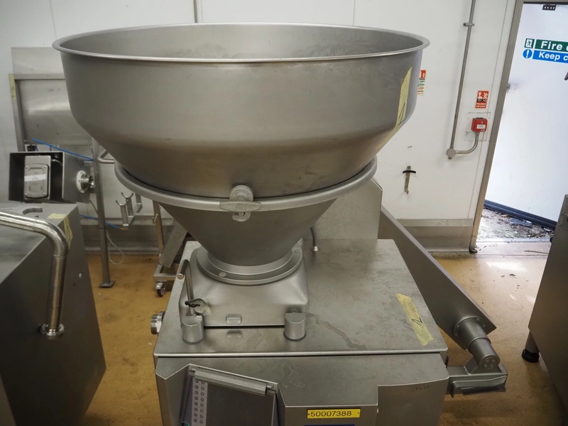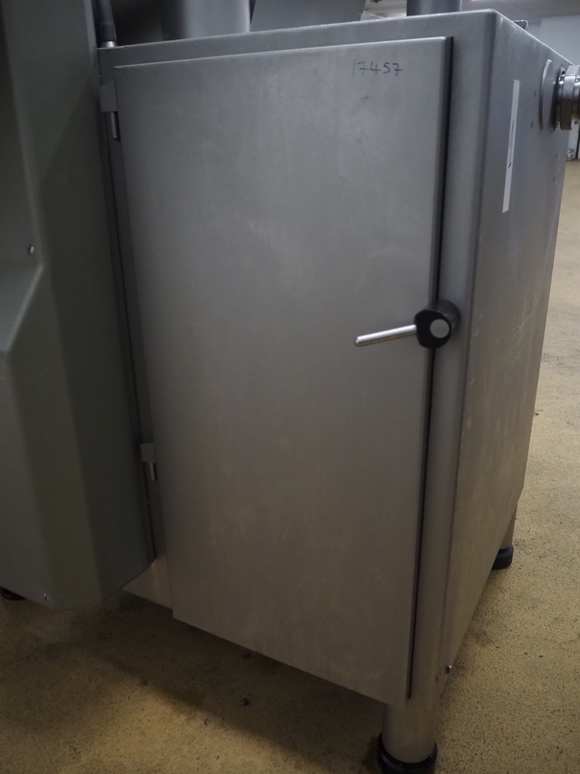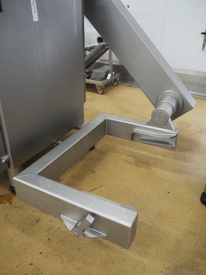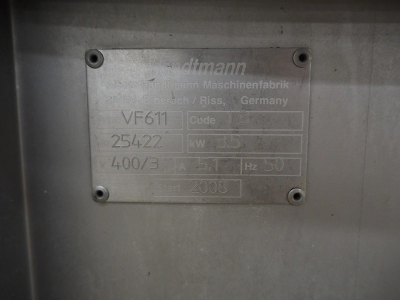 Handtmann vacuum filling machine with lifter for 200 litres meat bins, model: VF611, number: 25422, year of construction: 2008, 400 V, 3 Ph, 50 Hz, 5.1 A, 3.5 kW, dimensions: 1900 mm x 1400 mm x 2000 mm, including tool trolley, dimensions: 1600 mm x 600 mm x 1400 mm.