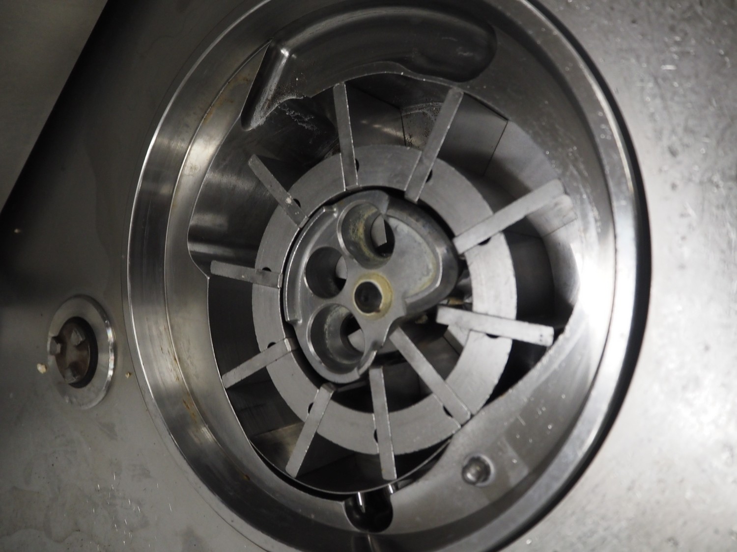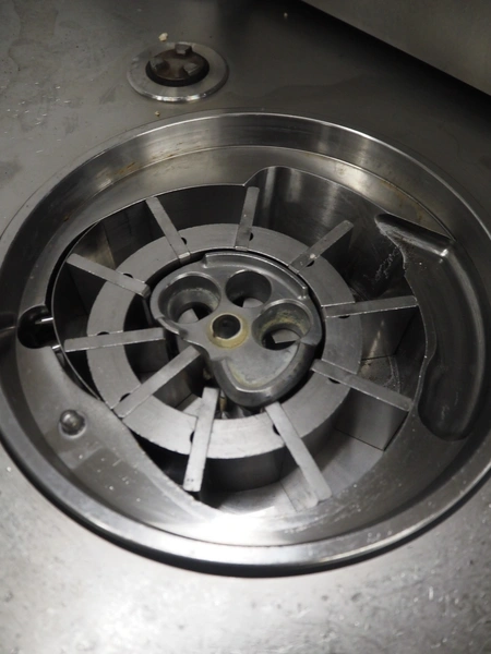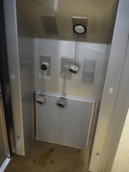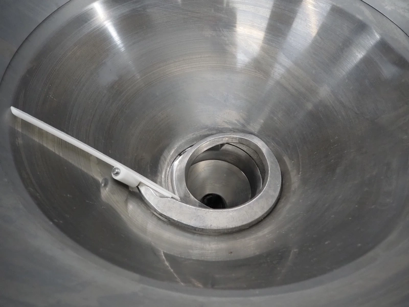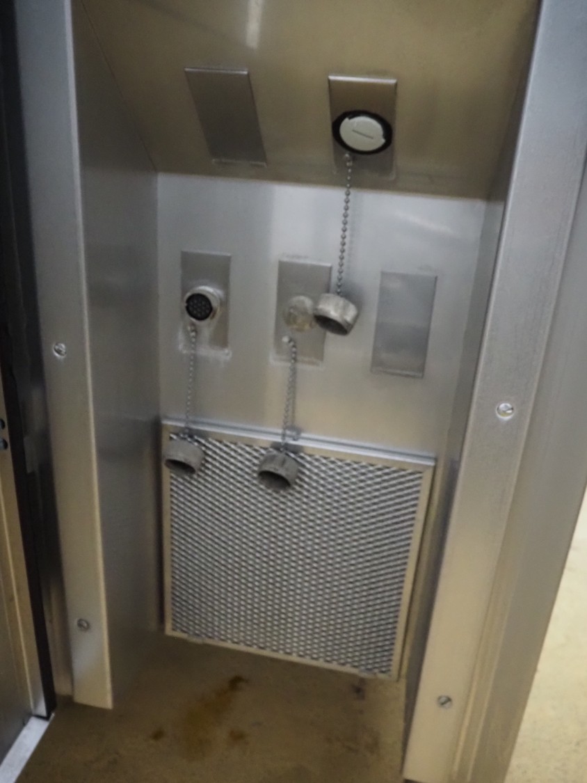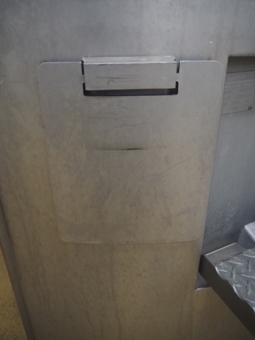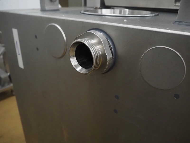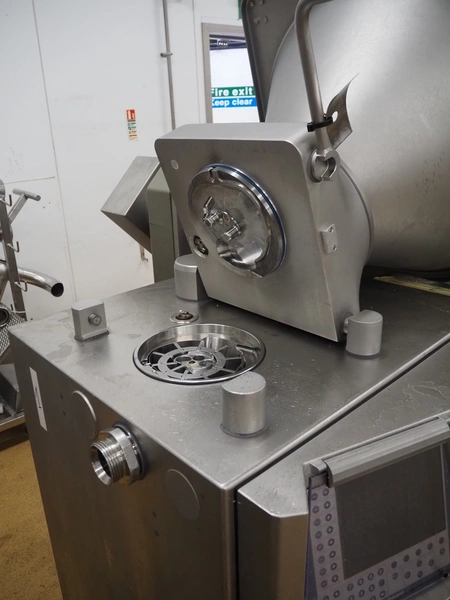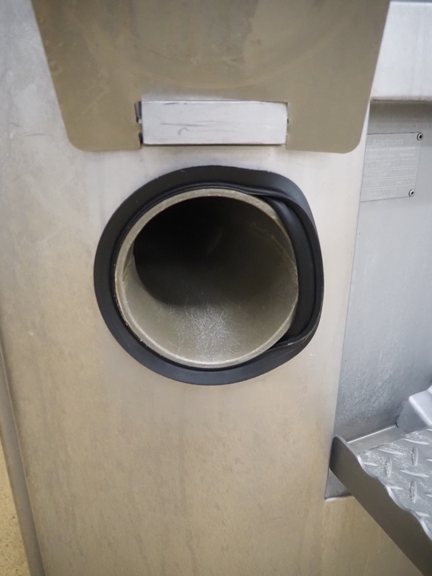 Handtmann vacuum filling machine with lifter for 200 litres meat bins, model: VF611, number: 25422, year of construction: 2008, 400 V, 3 Ph, 50 Hz, 5.1 A, 3.5 kW, dimensions: 1900 mm x 1400 mm x 2000 mm, including tool trolley, dimensions: 1600 mm x 600 mm x 1400 mm.