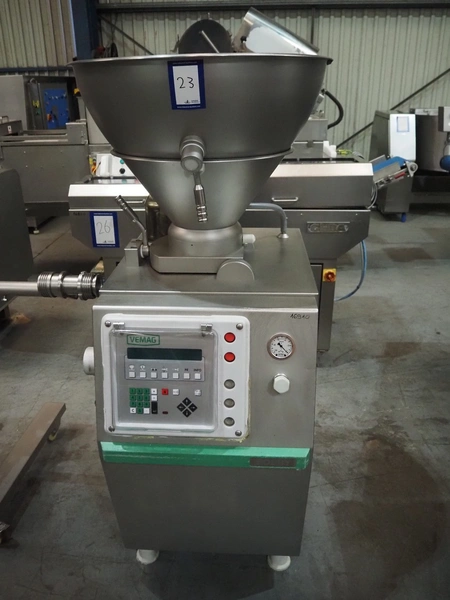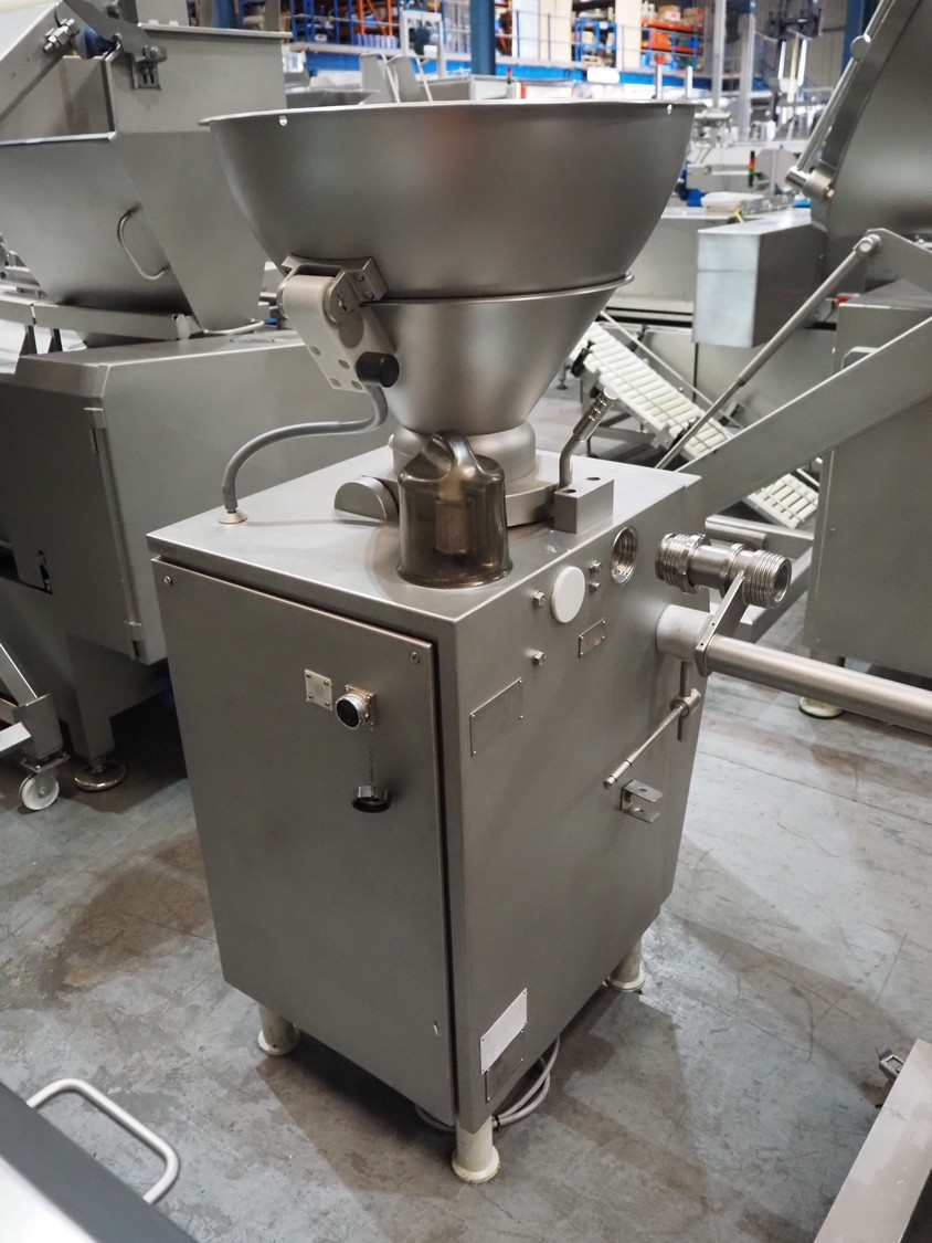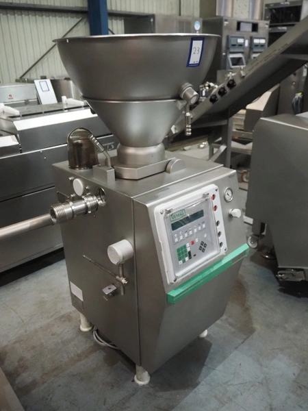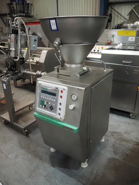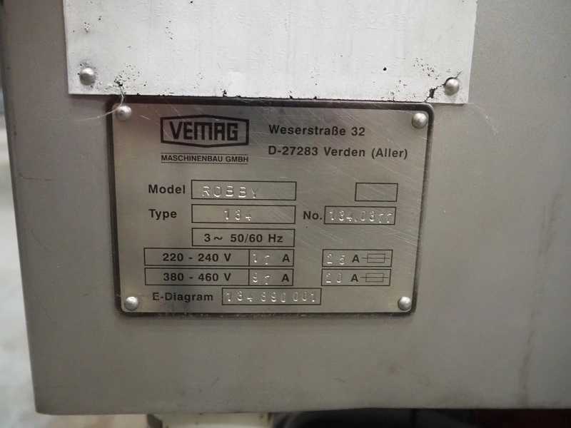 Vemag vacuum filling machine, model: Robby, type: 134, number: 134.0877, 380-460 V, 3 Ph, 50/60 Hz, 9.7 A, dimensions: 760 mm x 900 mm x 1620 mm.