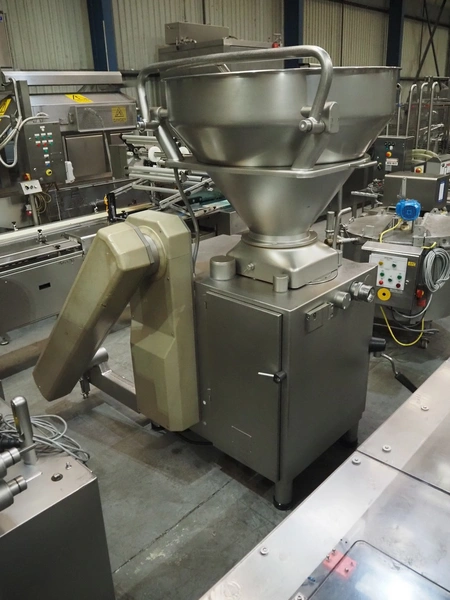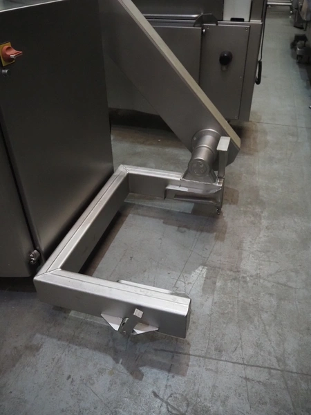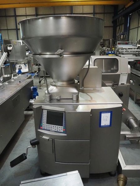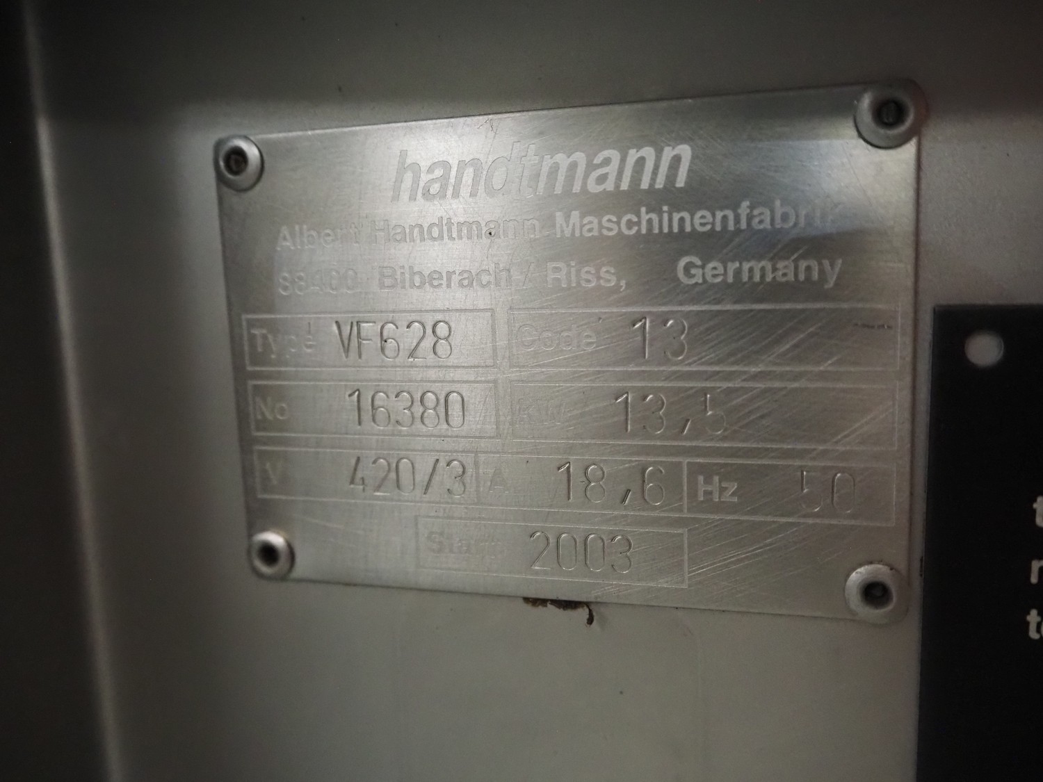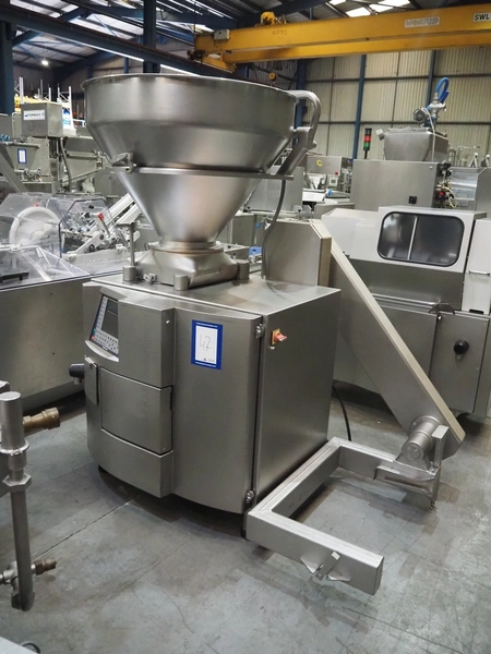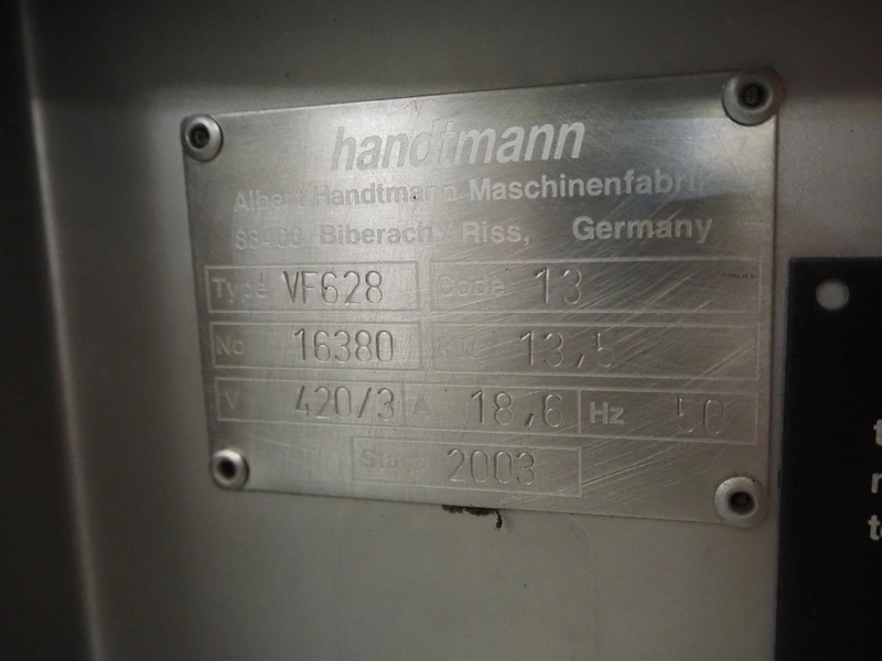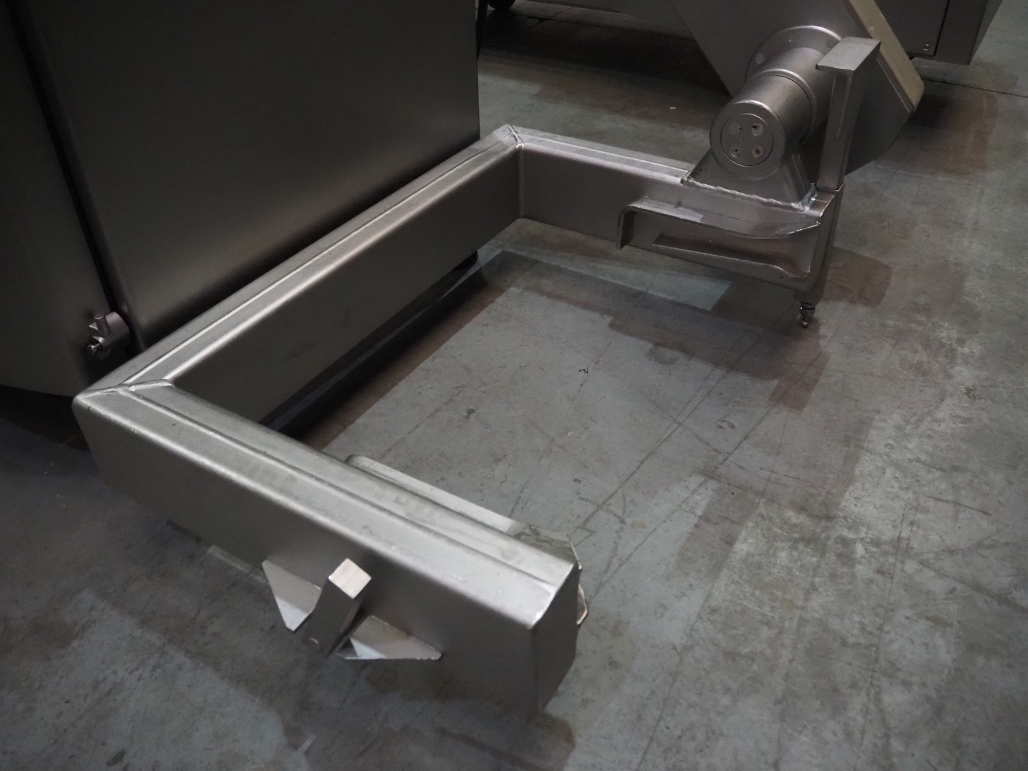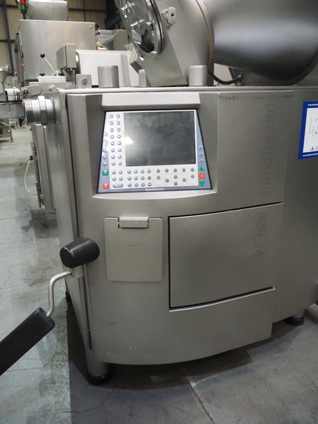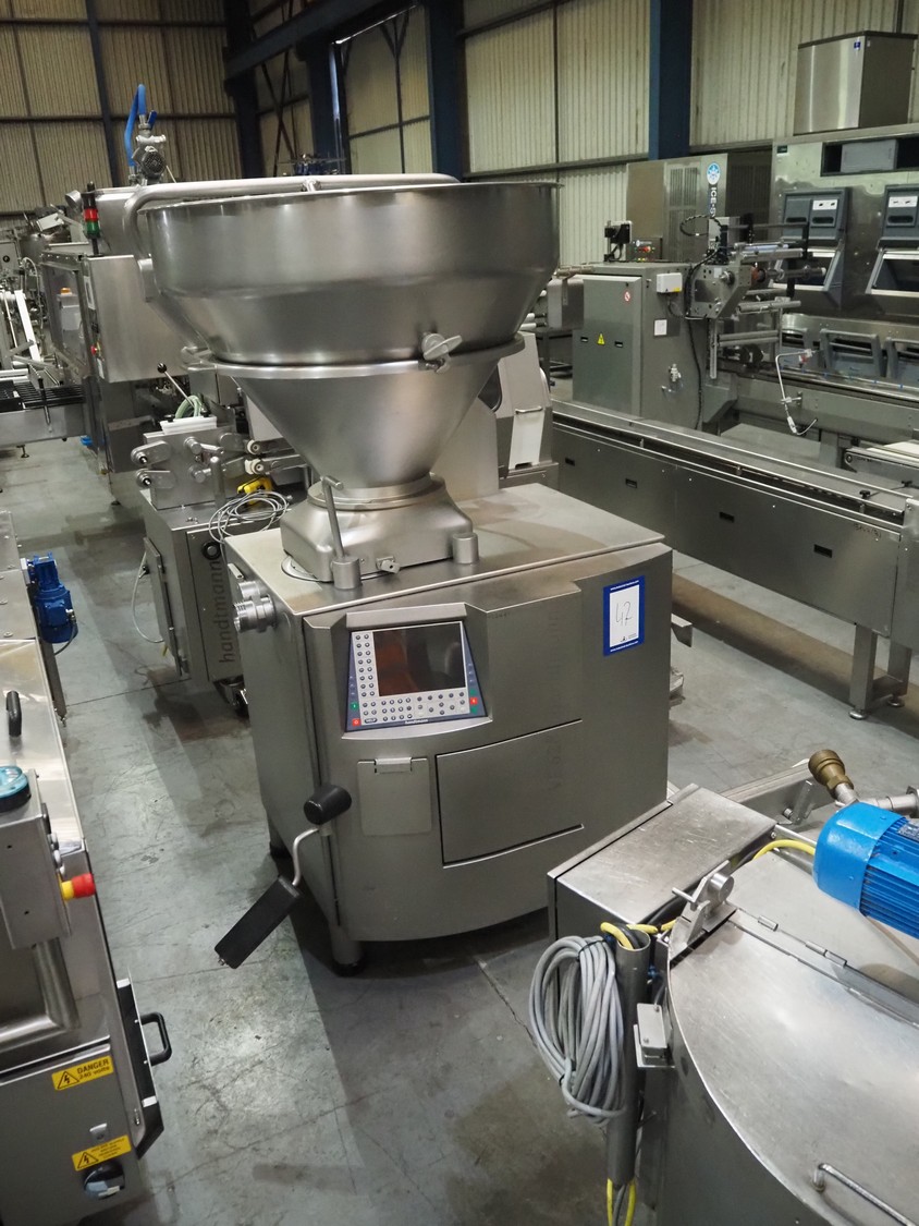 Handtmann vacuum filling machine with lifter for 200 litre meat bins, type: VF628, number: 16380, year of construction: 2003, 420 V, 3 Ph, 50 Hz, 18.6 A, 13.5 kW, dimensions: 1750 mm x 1350 mm x 2100 mm.